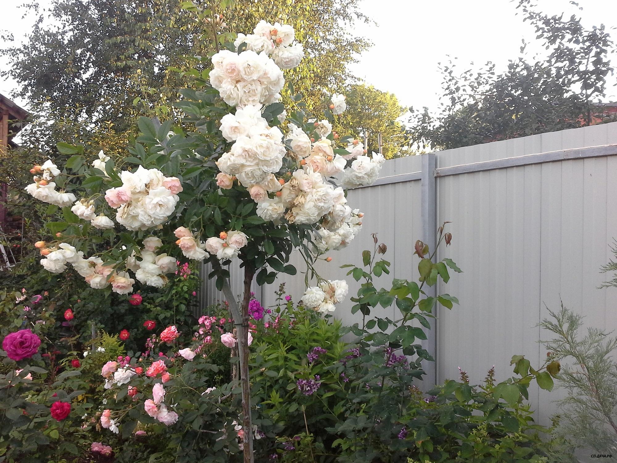 Ирина, вот очень люблю этот штамб-Austriana, хотя и не любитель красных роз. Очень аккуратная всегда прическа, я практически не вмешиваюсь в формирование, только санитарная обрезка. Цветет всегда хорошие такие 2 волны, бутонов море. Цветы держатся довольно долго, ну...дня 4-5, на дожди чихают. Нравится что не выстреливает длиннющими побегами, всегда все аккуратно. Пятнистости бывают, но не критично. Сейчас в такую слякоть стоит чистая