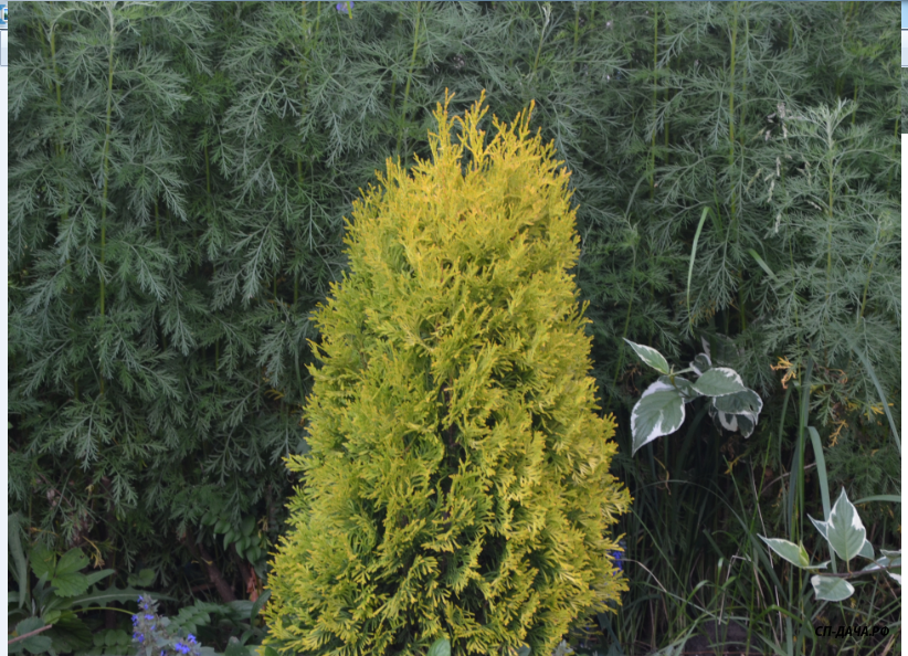 В клумбе с ним, для поддержки его желтого цвета, сидят желтая Туя и Бирючина...но посажены они не рядом, а на некотором удалении.