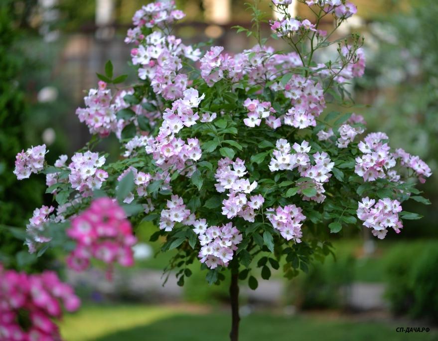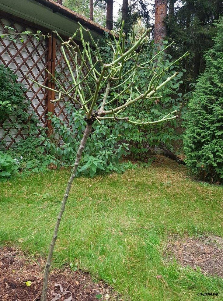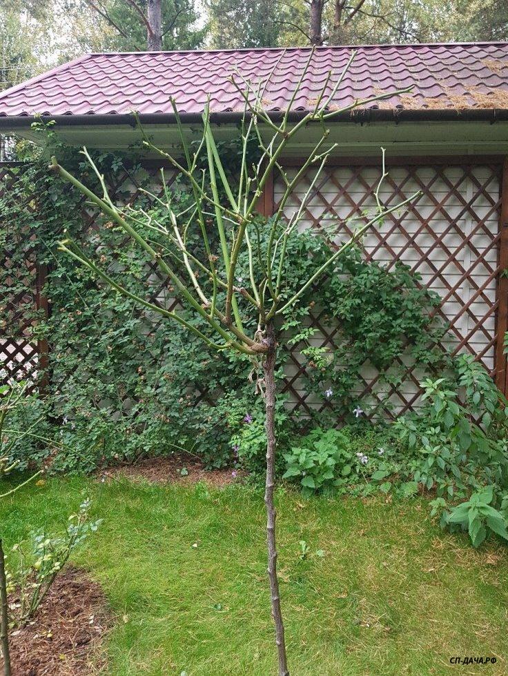 А весной этот согнутый побег будет цвести уже не на концах побега, а по всей длине. Соответственно крона штамба становится шире и цветов на ней больше. Вот как у этого штамба.