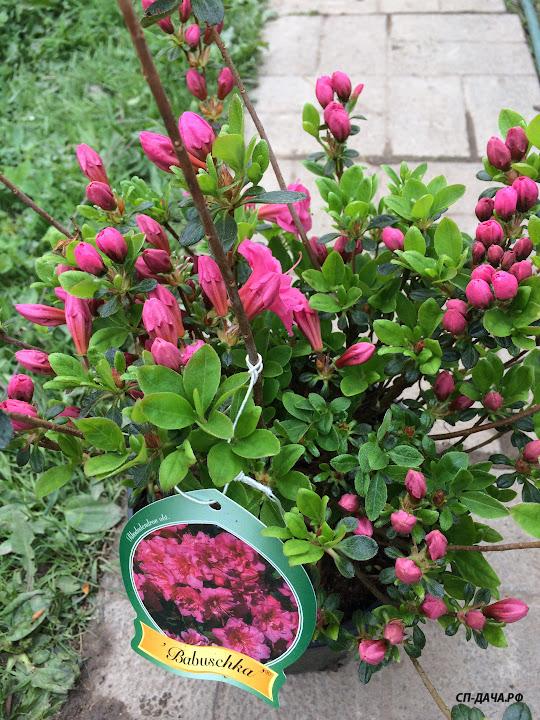 Азалия Бабушка - медленно растущий кустарник компактной шаровидной формы. В 10-летнем возрасте диаметр куста становится около 50 см, высота 30-50см.. Листья темно-зеленые. Цветки многочисленные, крупные, полумахровые, карминово-розовые. Сорт предпочитает полутень. Рекомендуются одиночные или групповые посадки на газонах, в бордюрах, на альпийских горках.