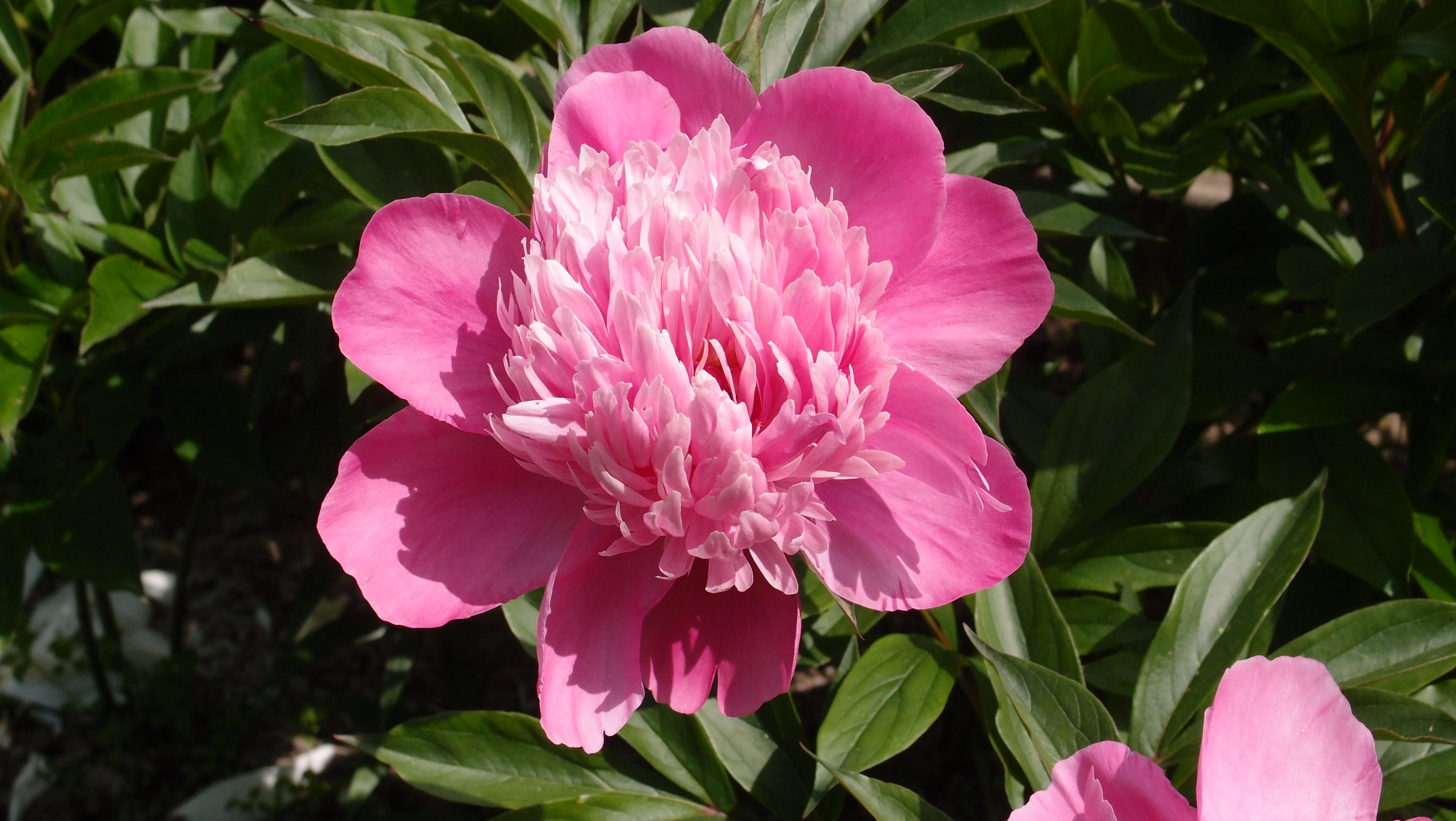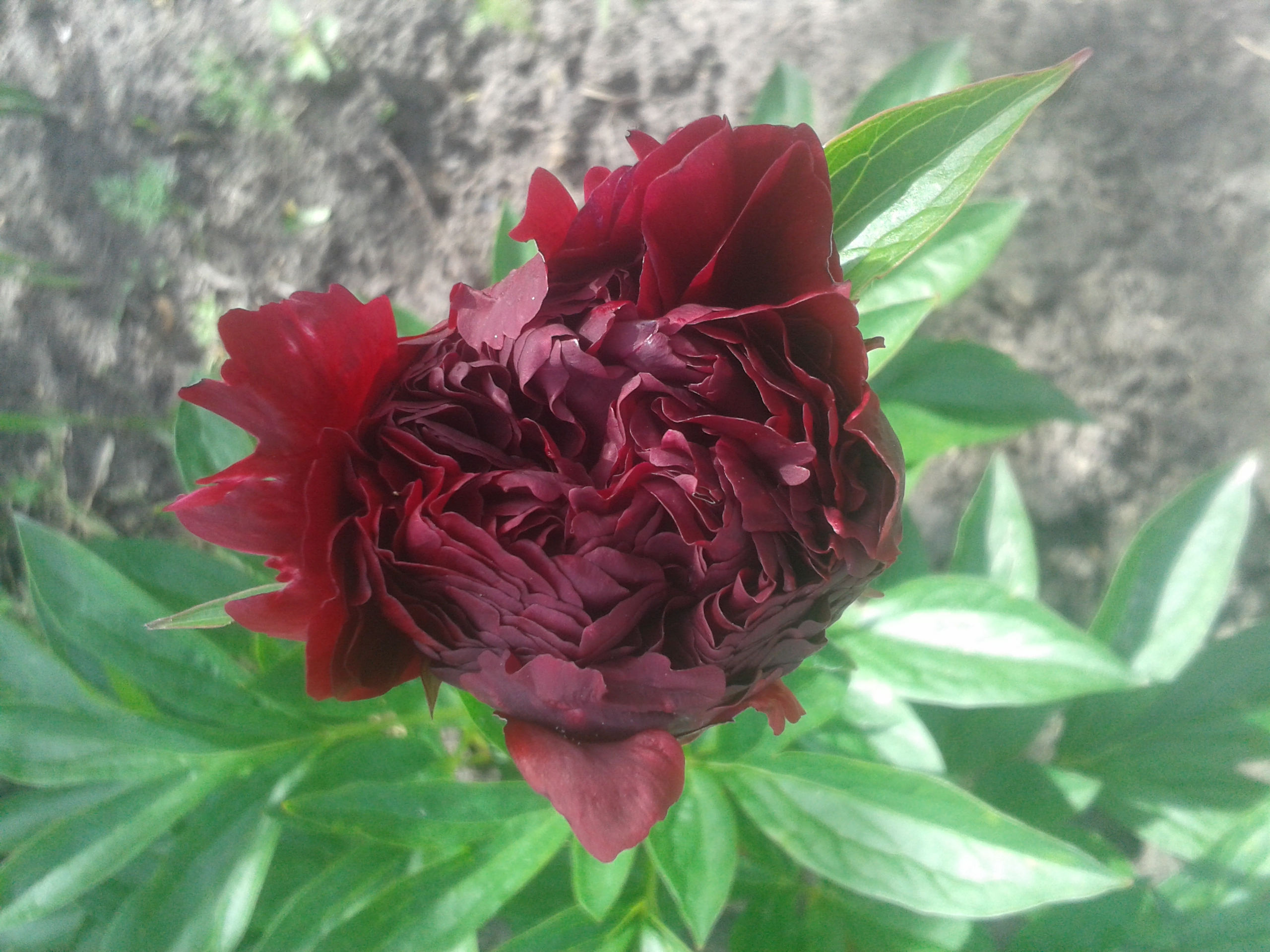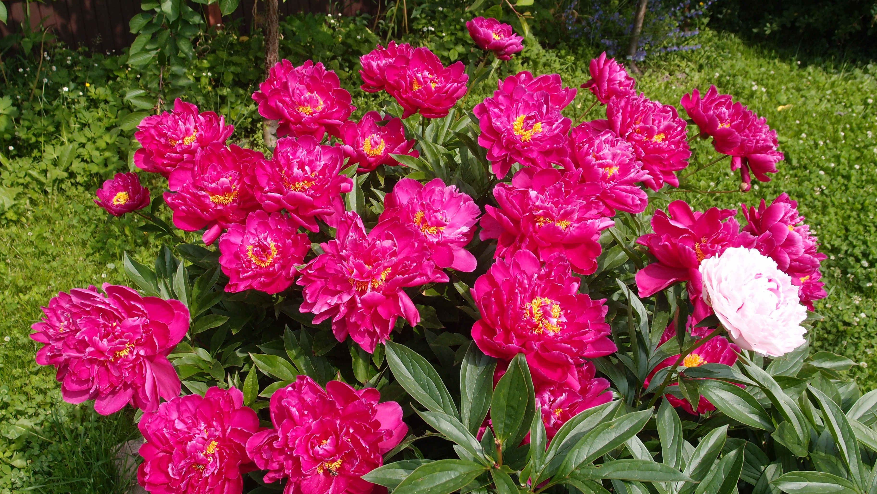 Кто-то шикарнейший куст пиона, всегда оч обильно цветущий, высадил рядом с проезжей частью около ржавого шлагбаума)))