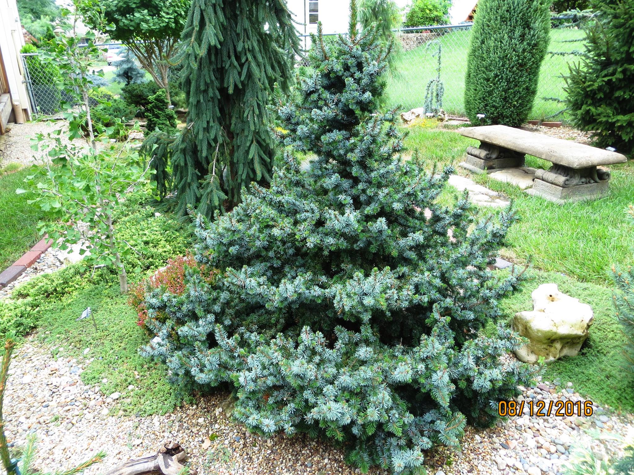 А на последней, растение на заборе это Cedrus atlantica 'Aurea Robusta'.