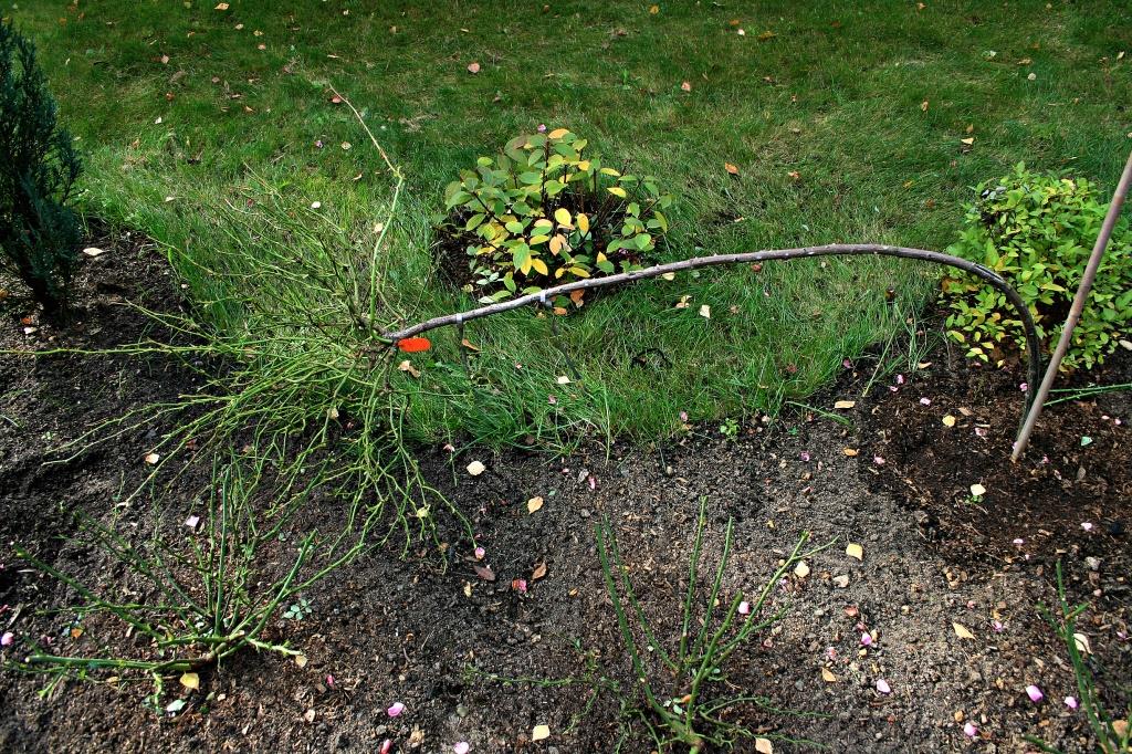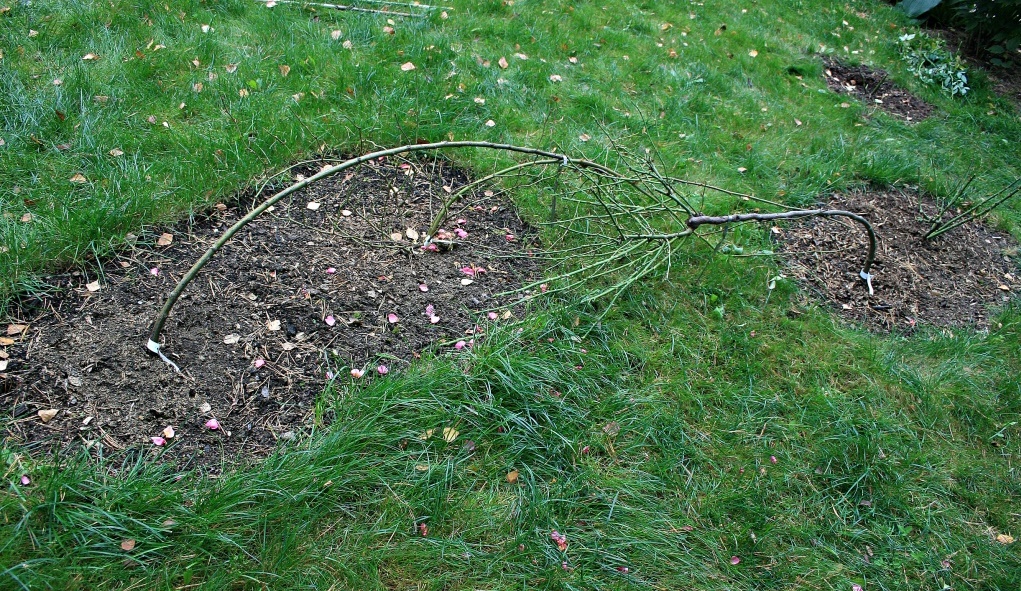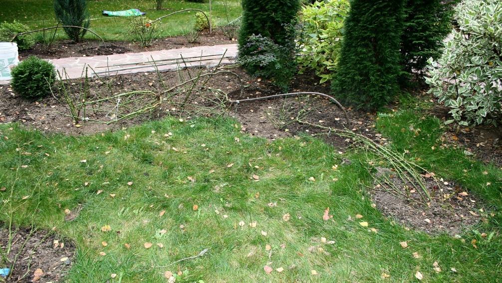 Таня, плохо могут гнуться только сухие стволы. Чтобы они легко гнулись, перед укладкой хорошо проливаем штамб, это придаст ему гибкости. Когда укладываем штамб первый раз, прилагаем незначительное усилие, направляя штамб в нужное нам место. Если сильно переживаете, можете укладывать в несколько приемов, каждый раз притягивая штамб к земле все ниже. На следующий год штамб уже помнит то положение, в котором лежал в прошлом году и укладывается без проблем. Небольшая подборочка для наглядности:Terra писал(а):Bars Оля, скажите, все стволики так легко гнутся/укладываются?