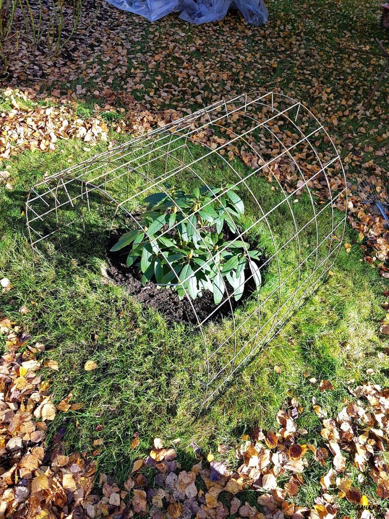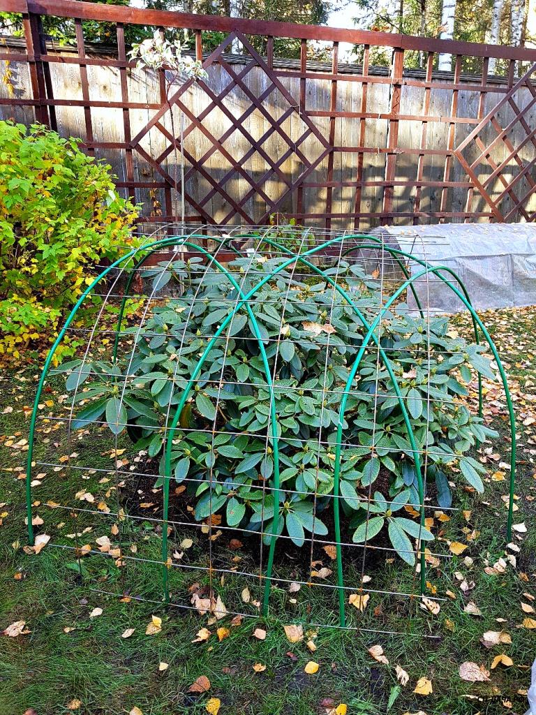 Этой осенью, мы уже серьезнее подошли к укрытиям родиков и можевельников... Над родиками ставили дуги, а сверху, внахлест ставили дорожную сетку, втыкая острыми концами в землю. Дуги ставили, чтобы сетка под тяжестью снега не сложилась и не завалилась. Вот так это выглядело осенью