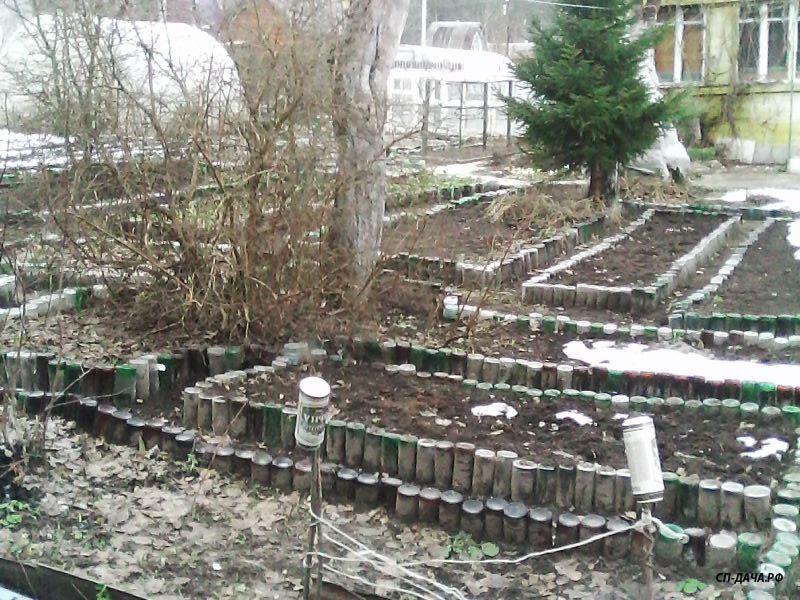 У Вас ограждение для грядок из пластиковых бутылок или из стеклянные банки? Чем заполнены - землей для жесткости?