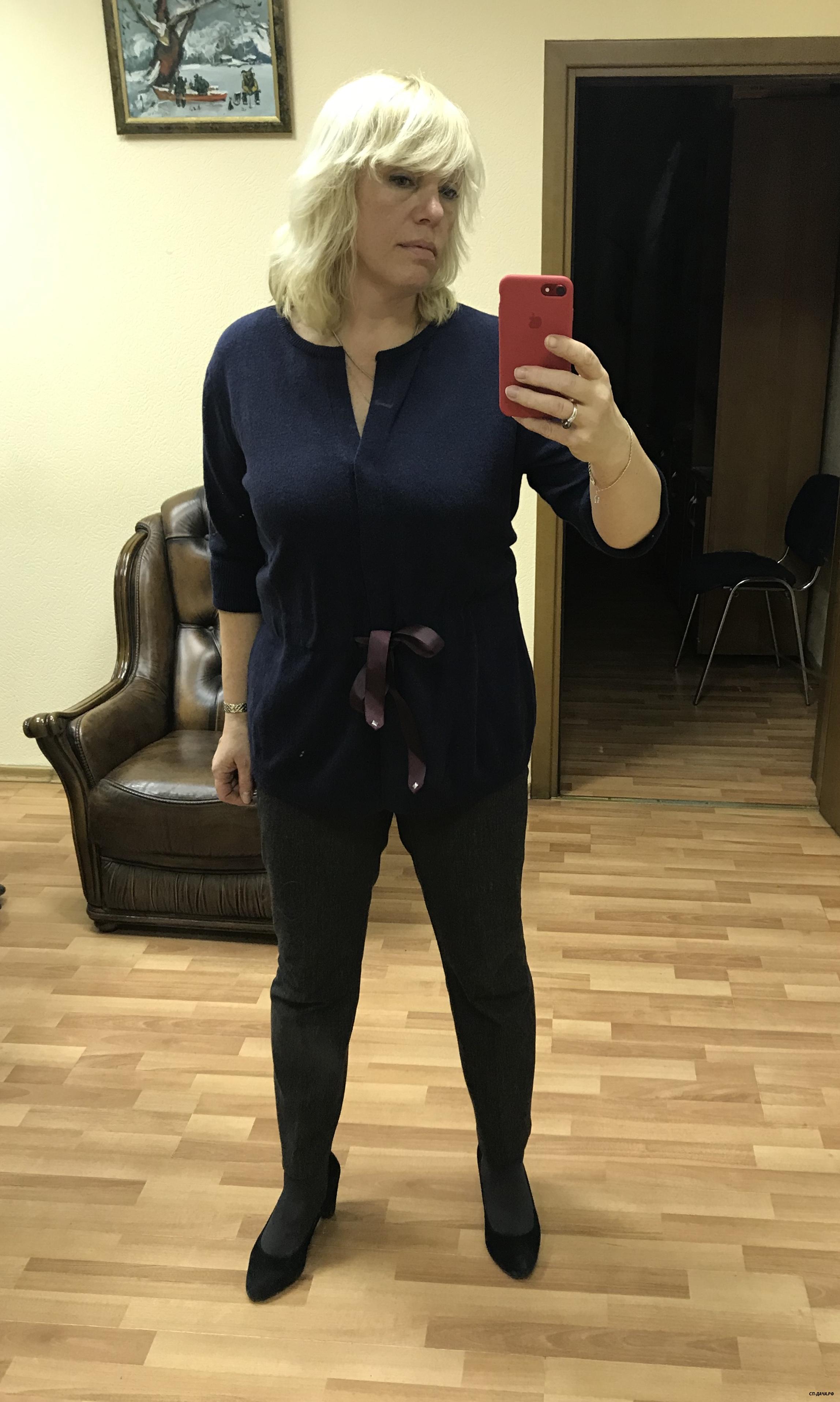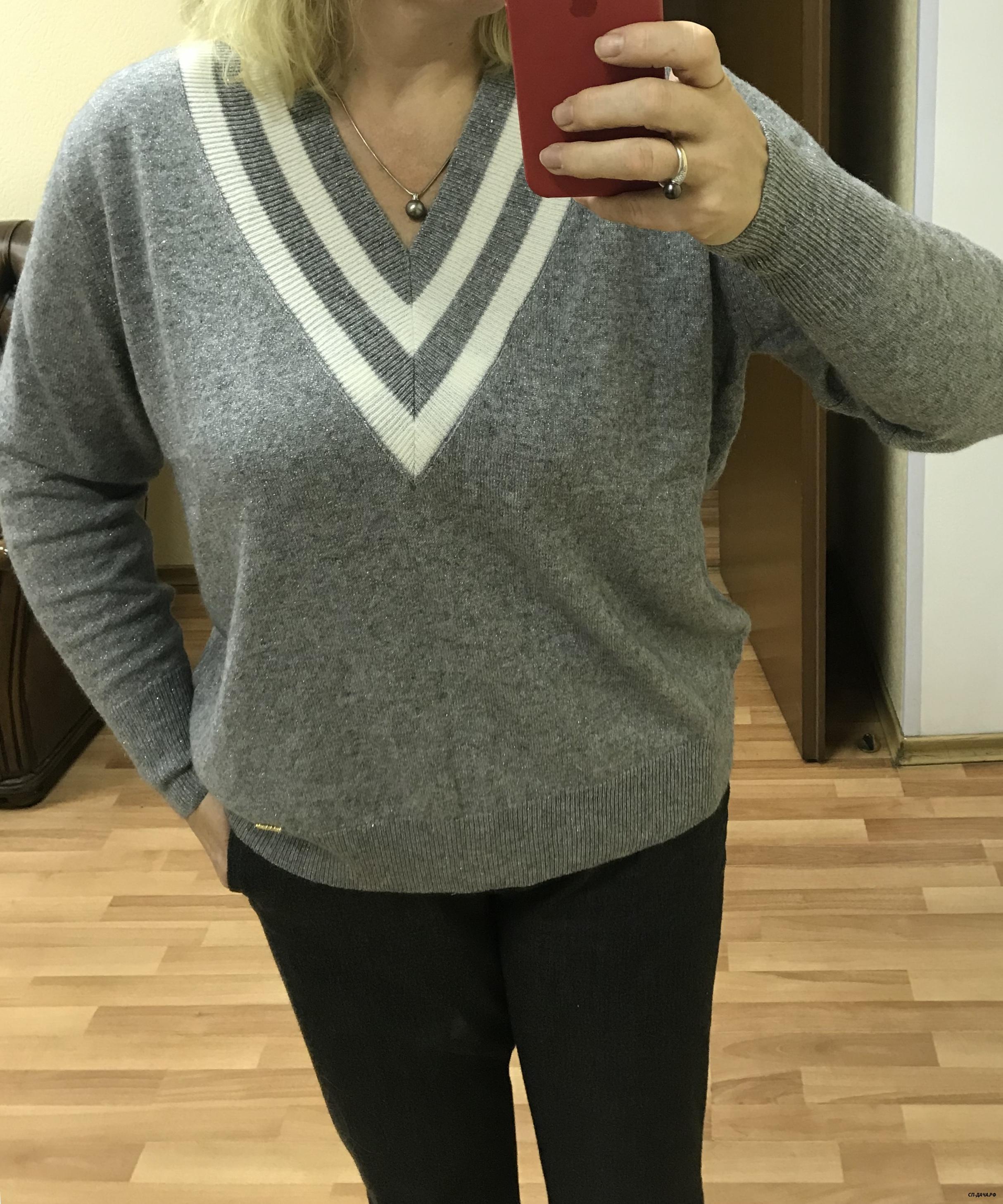 Джемпер 4102 графит. На сайте есть фото и написано графит. Цвет да, похож. НО - отделка вместо светлой черного цвета :9ac6e5e8: Т.е. ничего не видно абсолютно. Брала к клетчатым брюкам , думала полосочки будут перекликаться. Пришлось поддевать белую рубашку, вешать всякие висюльки, чтоб хоть как-то оживить. В результате - носить можно :ye: