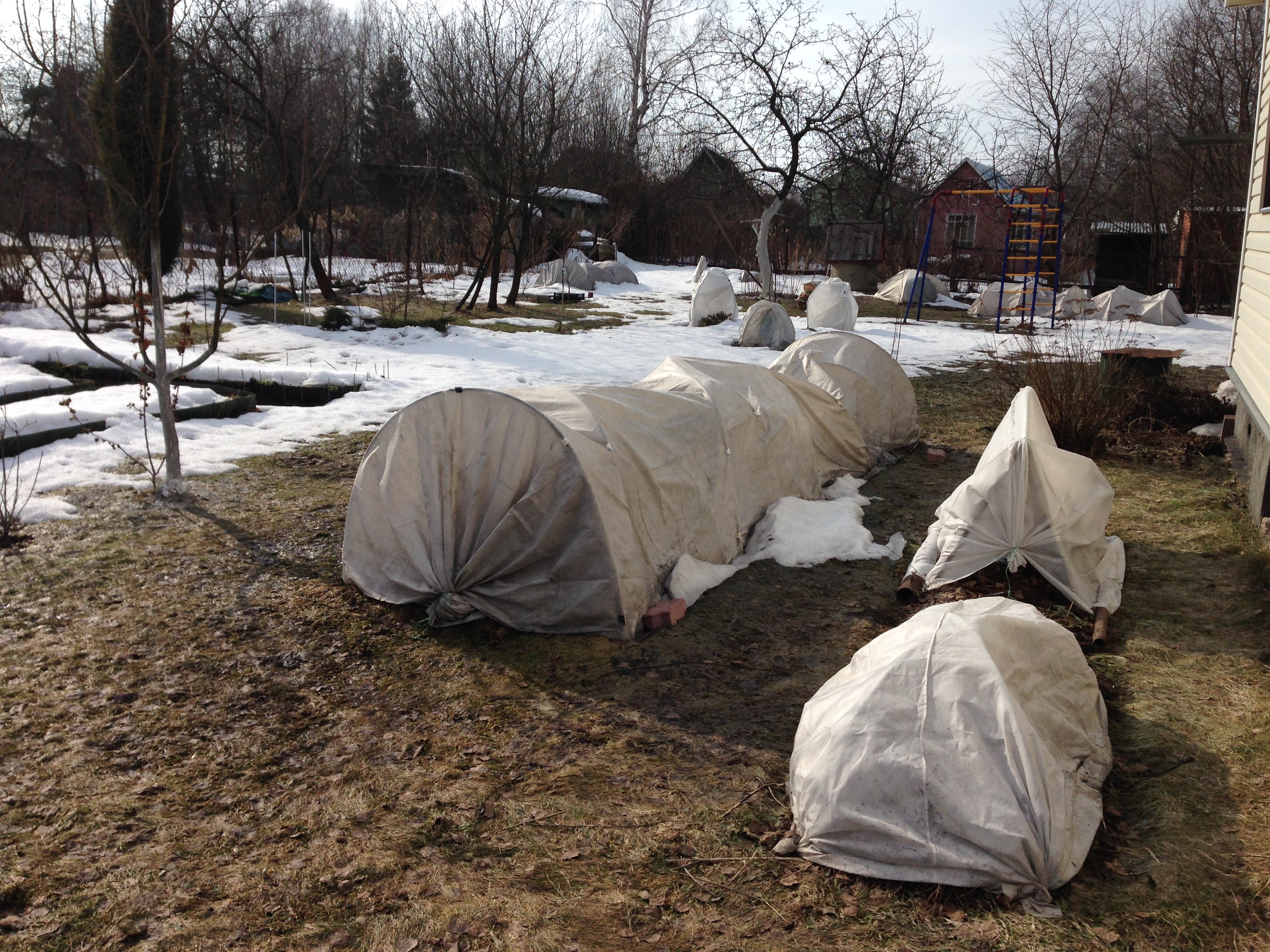 Разгребла их от земли, проветрила , на всякий пожарный лапником веточки закрыла и снова укрыла лутрасилом, чтобы не спрели.