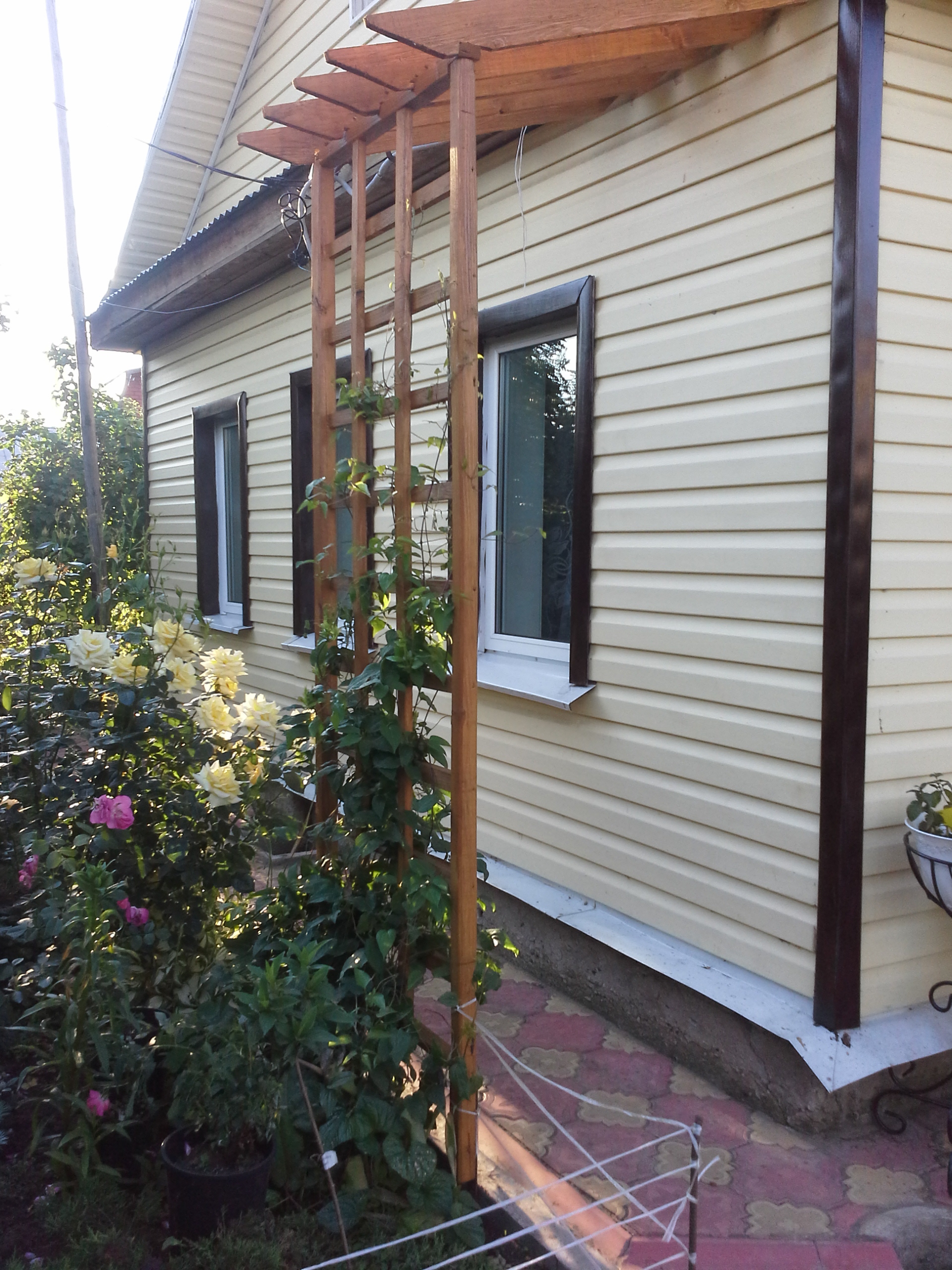 Вместо полуарки под клематис сделала деревянную полуарку.Кажется неплохо получилось.