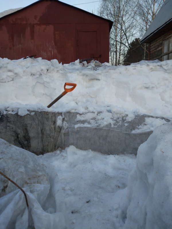 И я со стороны ягодника просто физически не могу снять снег, там кусты, и девать его мне уже некуда, и конструкция укрытия полностью сварная, ее не разберешь, пока все не счистишь.