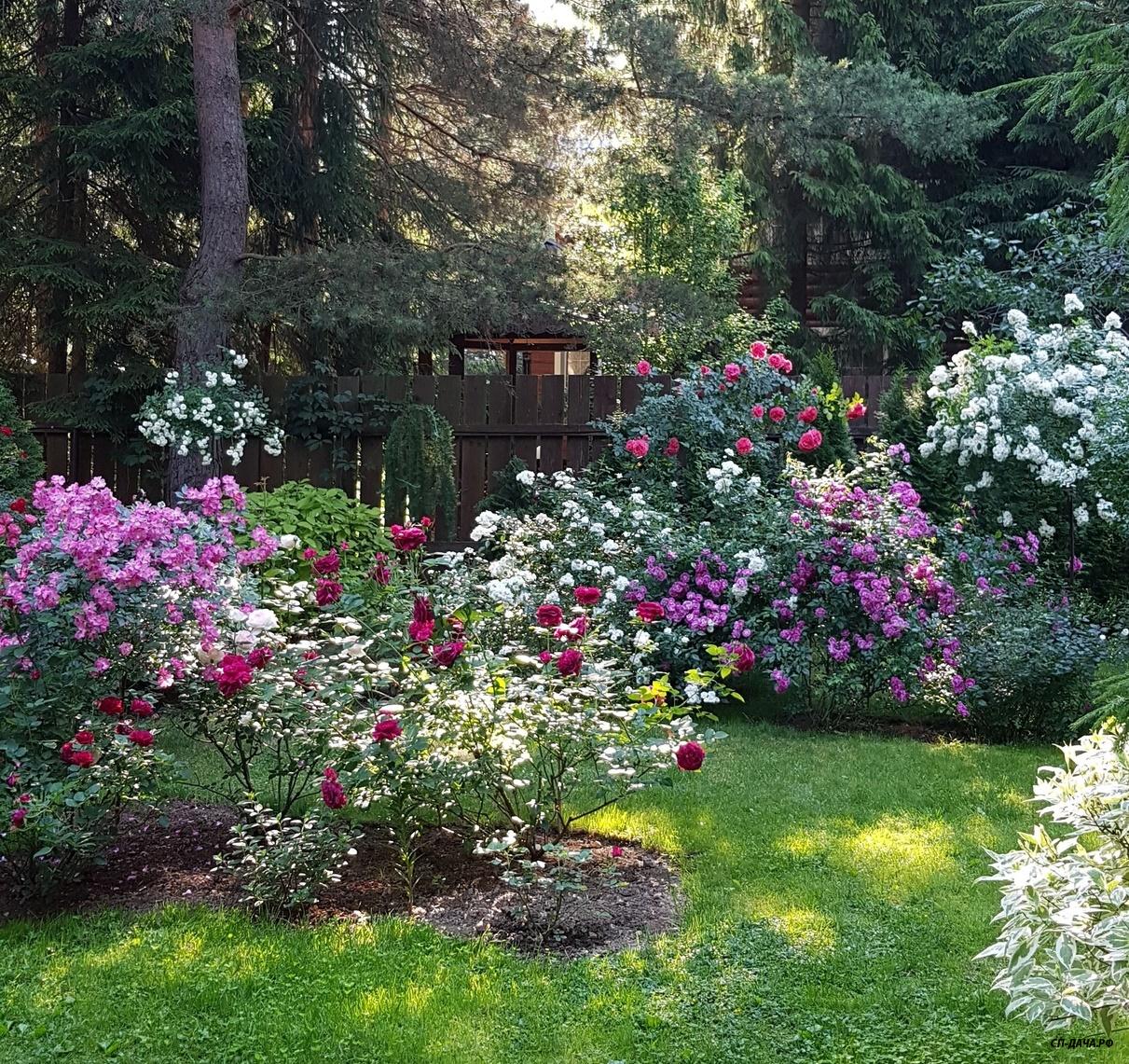 Правда, на этой фотографии уже прошла обрезка первых отцветших соцветий, но мне и тех цветов, что продолжали распускаться хватало... Иначе получался перегруз в цветах... В этом саду у меня все кусты получаются с вытянувшимися побегами из-за малого количества солнца. А на открытом солнце, обрезанные такими чашами они были компактными и цвели пышными пулушариями.