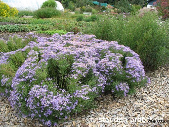 Цветки многочисленные, лилово-голубые с жёлтой серединкой, мелкие. Цветёт в августе-сентябре. Листья зелёные, линейные. Кустик компактный, высотой 30 см. Место солнечное. Почва дренированная. Зона 4 (до -29°С).