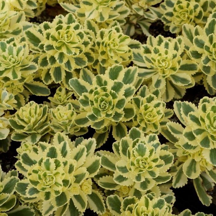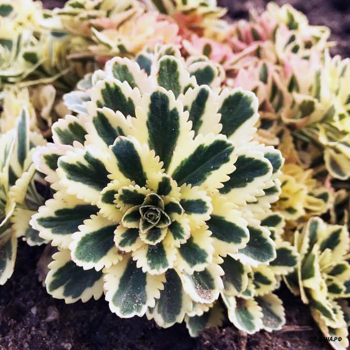 Очиток такесимский 'Atlantis' - новый сорт седума, демонстрирующий увлекательное сочетание цветов: зеленая листва с кремовыми краями, розовые цветочные бутоны, вишнево-красные бутоны листьев и желтые цветы летом. Листва сохраняет свой цвет на протяжении всего лета и осени.
