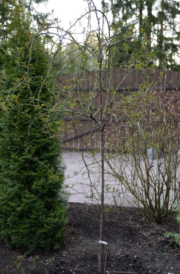 Оля, я все штамбы сажаю прямо и сначала обязательно в контейнер, так мне быстрее и проще следить за их приживаемостью и наращивать им корневую. Если честно, я просто не знаю, зачем сажают под углом.