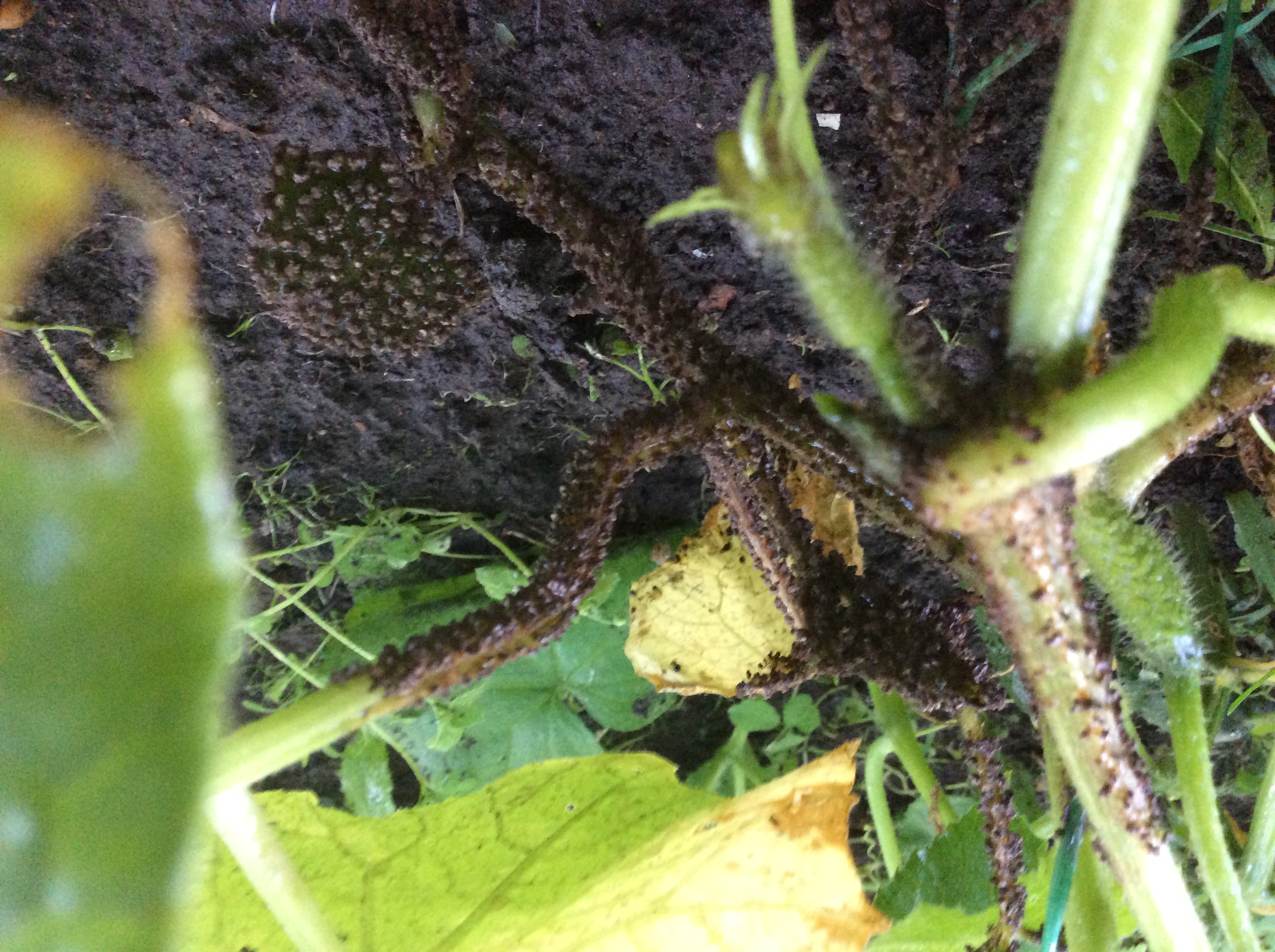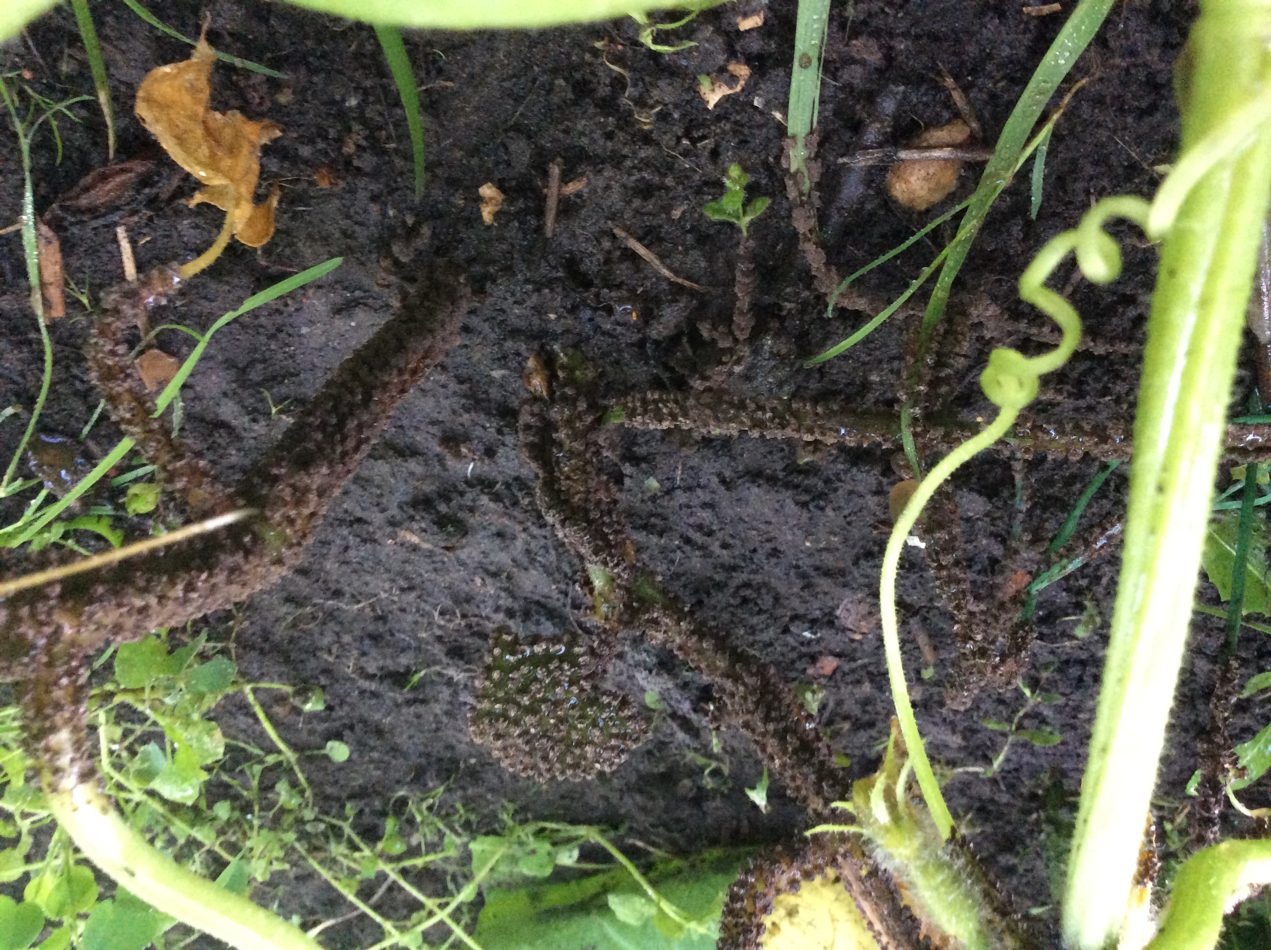 Дело было так. Числа 10 июля надо было на неделю уехать с дачи и из Москвы. Было очень холодно и огурцы стояли под лутрасилом и днём, и ночью. Уехали, оставив их также. А через 3-4 дня пришла жара. Как назло, никого не было на даче, кого можно было бы попросить открыть огурцы. 17 июля, как только вернулись в Москву, помчались на дачу. Когда открыли лутрасил, увидели то, что на фото. Как кадры из фантастических фильмов!!!! Бррр!!! Причём коричневым налетом были покрыты не только плети и листья огурцов, но и травинки-сорняки, оказавшиеся рядом. При малейшем прикосновении это что-то коричневое начинало пылить. Но коричневый налёт был не на всех огурцах. Первый порыв был - выдрать больные плети и сжечь. Потом подумала-подумала и решила, что терять уже нечего и можно попробовать что-нибудь сделать. Развела мыльную кашу, взяла губку и осторожно, стараясь не пылить, обильно смачивала и смывала налёт с плетей. Что могла - обрезАла. Заодно и землю вокруг плети смачивала этой кашей. Потом всё высохло, на стебле остались только подсохшие серые следы. Огурцы после этого росли и плодоносили, и не очень отличались от других, не попавших под налёт. Смотрела потом в интернете болезни огурцов, но ничего похожего не нашла. Понятно, что это было следствием жары и парникового эффекта. Но что именно это было? Может кто знает?