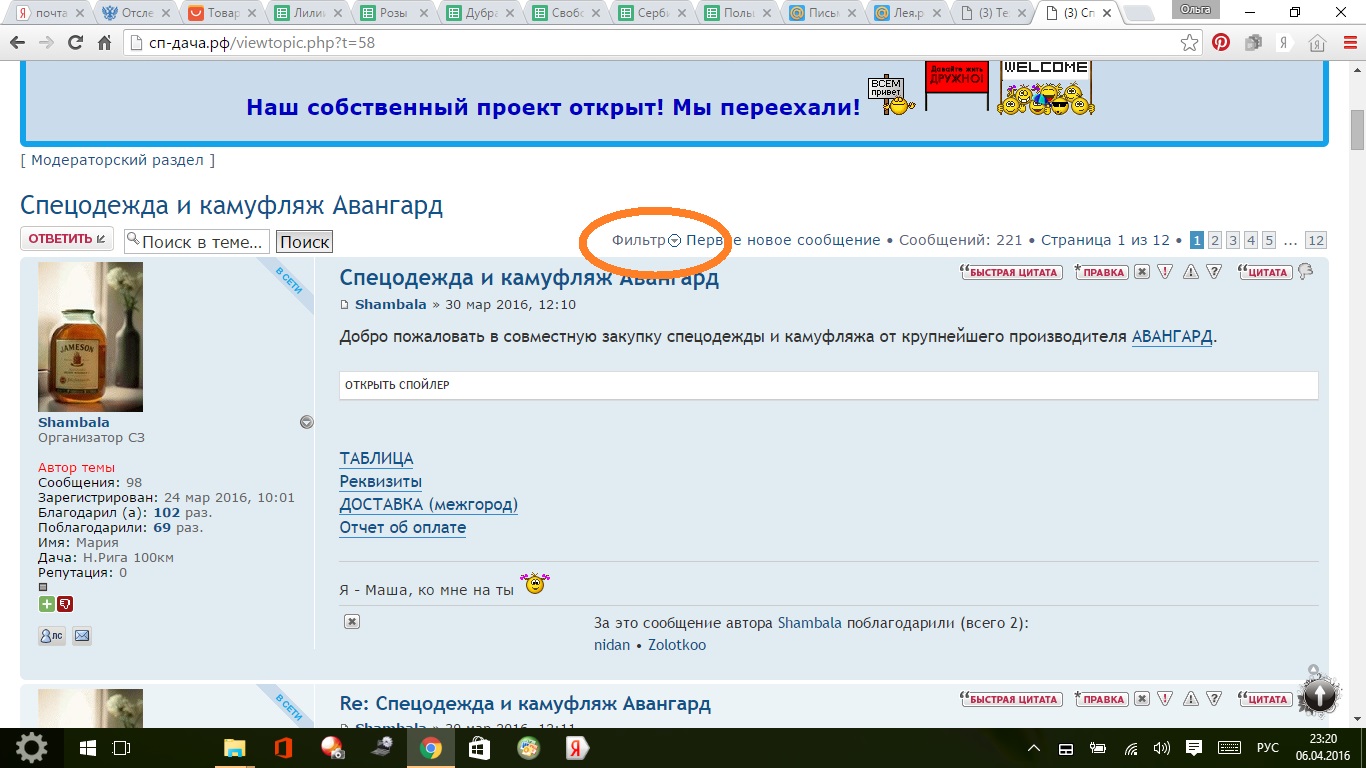Закрепите пожалуйста первым сообщением на каждой странице описание закупки. Очень удобно сразу от прочтения сообщений/просмотров фото быстренько отметить желаемое в таблице, не листая каждый раз на первую страницу темы.