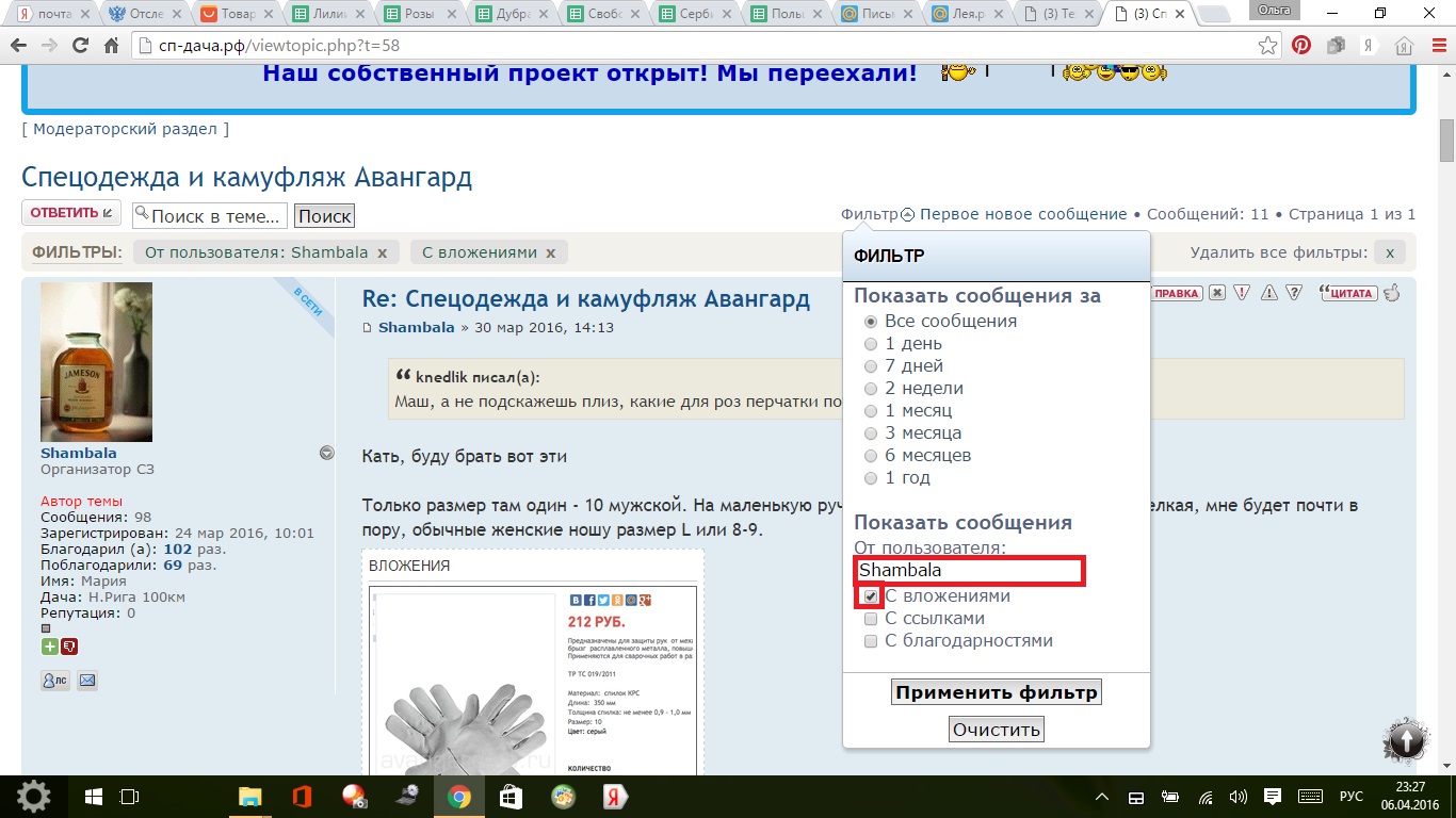 3. Для поиска всех сообщений в теме, содержащих вложения ( Фотографии).