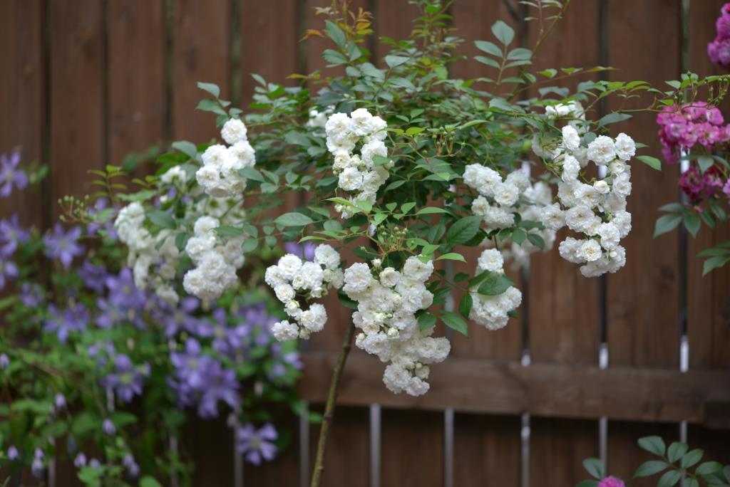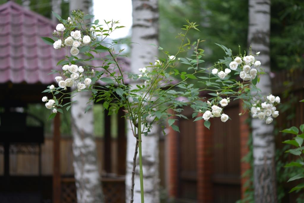 Характер цветения абсолютно разный: Alba Meidiland цветет гроздьями, своего рода ниспадающий водопад. Цветет постоянно, т.к. новые бутоны закладываются в момент цветения кистей. Цветок держит очень долго. Отцветшие грозди лучше, конечно же, срезать, чтобы и вид не портили, и сил на закладку следующих бутонов хватало. Побеги вызревают очень быстро, т.к. не жирные. У Blushing Bride цветы парят в воздухе - как брызги шампанского... Перерывы в цветении если и есть, то совсем маленькие, т.к. бутоны выбрасываются постоянно. У этой розы нет шипов! (Один-два случайно отросшие не в счёт) Цветок тоже держит очень долго, при отцветании они облетают сами. Тоже прекрасно и быстро вызревает. Обе розы абсолютно здоровые. Очень пластичные, что важно при укладывании на зимовку. У меня этот год росли в горшках, т.к. с местом еще не определилась, обе прекрасно себя чувствовали. Высаживать буду весной, после получения остальных штамбов, чтобы не ошибиться при распределении мест.