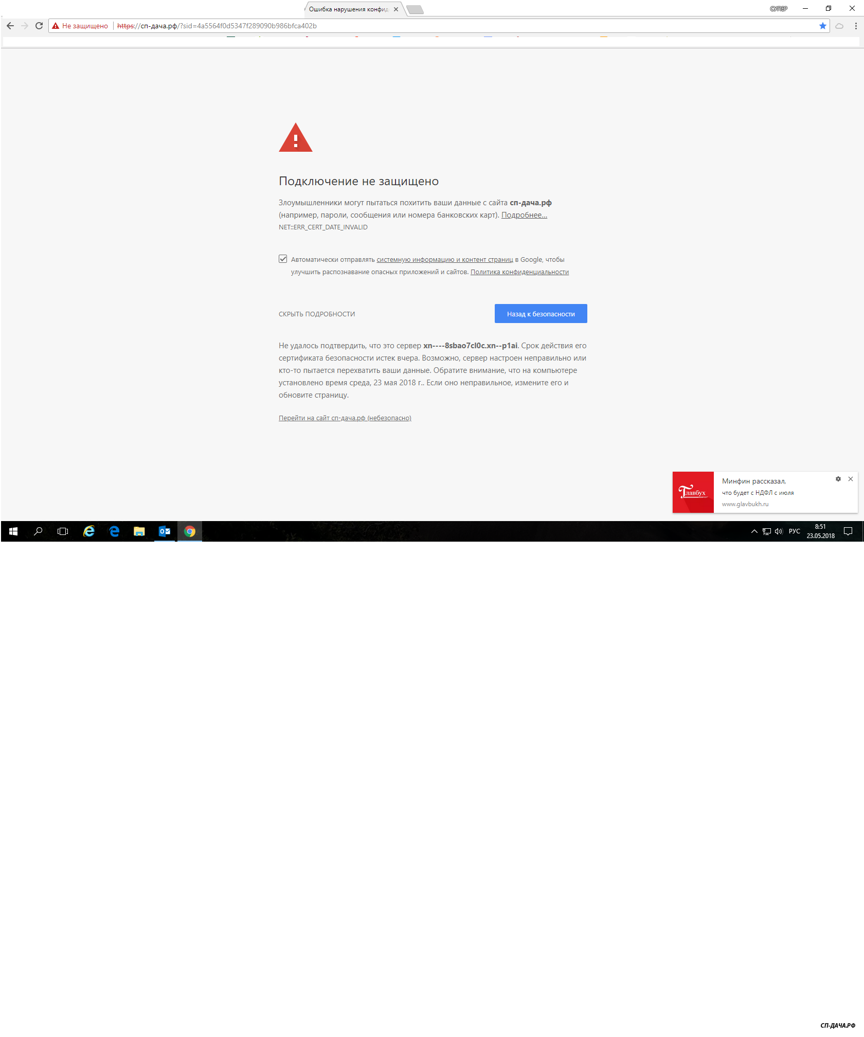 У всех так, похоже, с каких устройств не заходи. Когда он начнет первый раз пугать злоумышленниками, нужно внизу нажать кнопочку ДОПОЛНИТЕЛЬНЫЕ, потом внизу "перейти на сайт СП-ДАЧА НЕБЕЗОПАСНО", если не боитесь, конечно.Лаванда » 23 май 2018, 11:31 писал(а):И у меня так жеAngela » 23 май 2018, 11:22 писал(а):У меня тоже такая проблема, Гугл пишет Подключение не защищено, с телефона еще как-то удалось заставить войти, а с компа вообще не выходит. А с телефона так-то плохо, таблицы не видно.