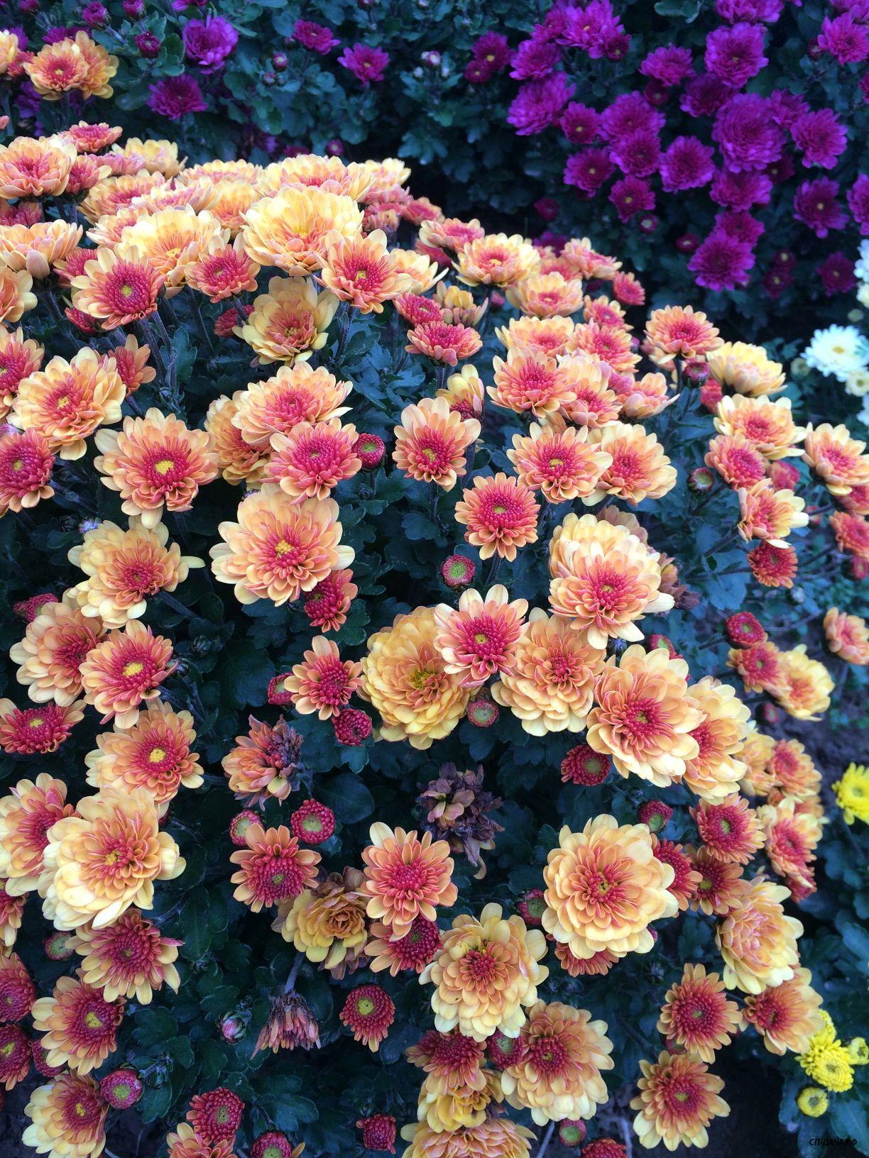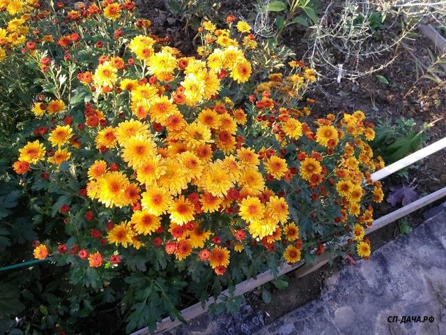 Еще интересно, что генетическая линия мульти может дать сбой. У меня один из сортов вдруг выстрелил до высоты обычной корейской хризы. До 70 см, величина цветка и обильность цветения осталась. Куст склонялся от обилия цветов и разваливался. Но картинка замечательная получилась - плотная листва и все в цветах.