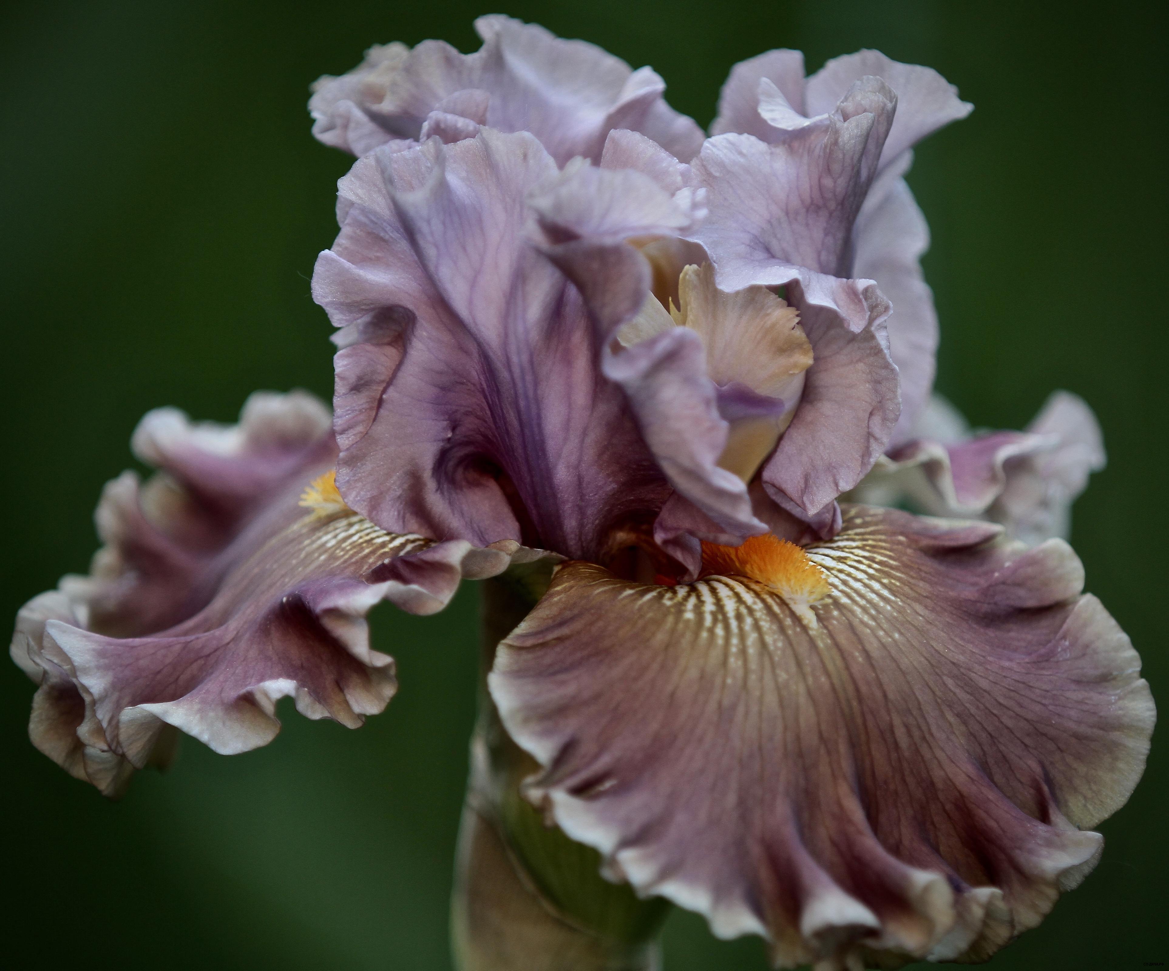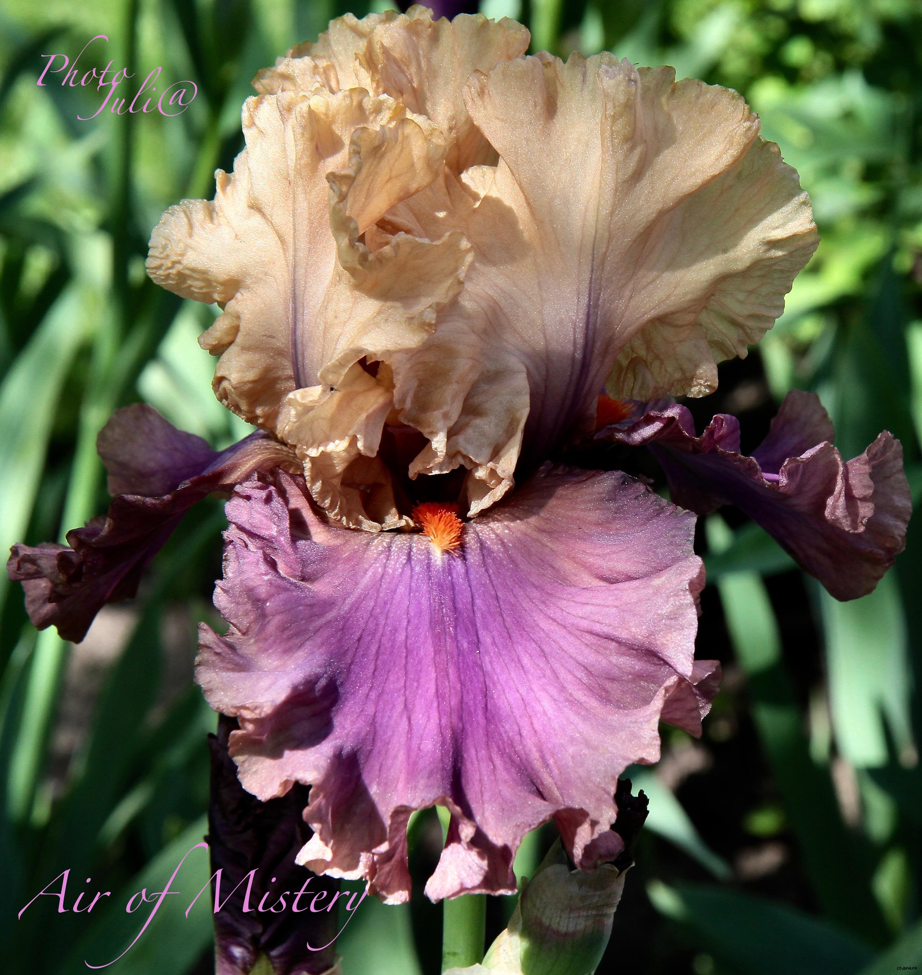 Крупный ирис с шикарной формой! Стандарты светло-сиреневые, к краю чуть светлее, сильно широкие фолы светло-коричнево-желтые с нежным чуть сиреневатым оттенком, окантовка белая, сильно выраженная на таком сочетании цветов. Бородка оранжевая. Сильно гофрированный