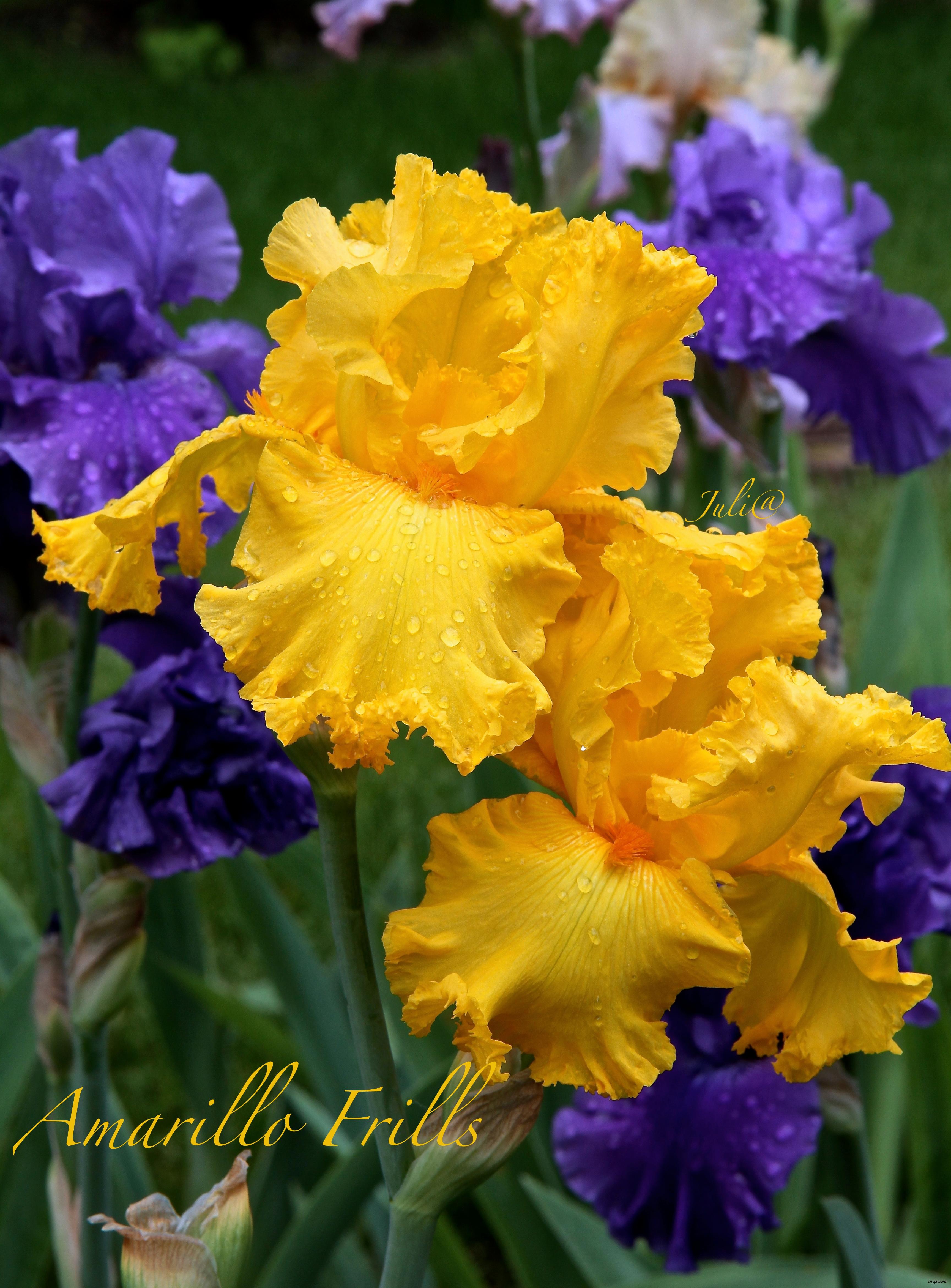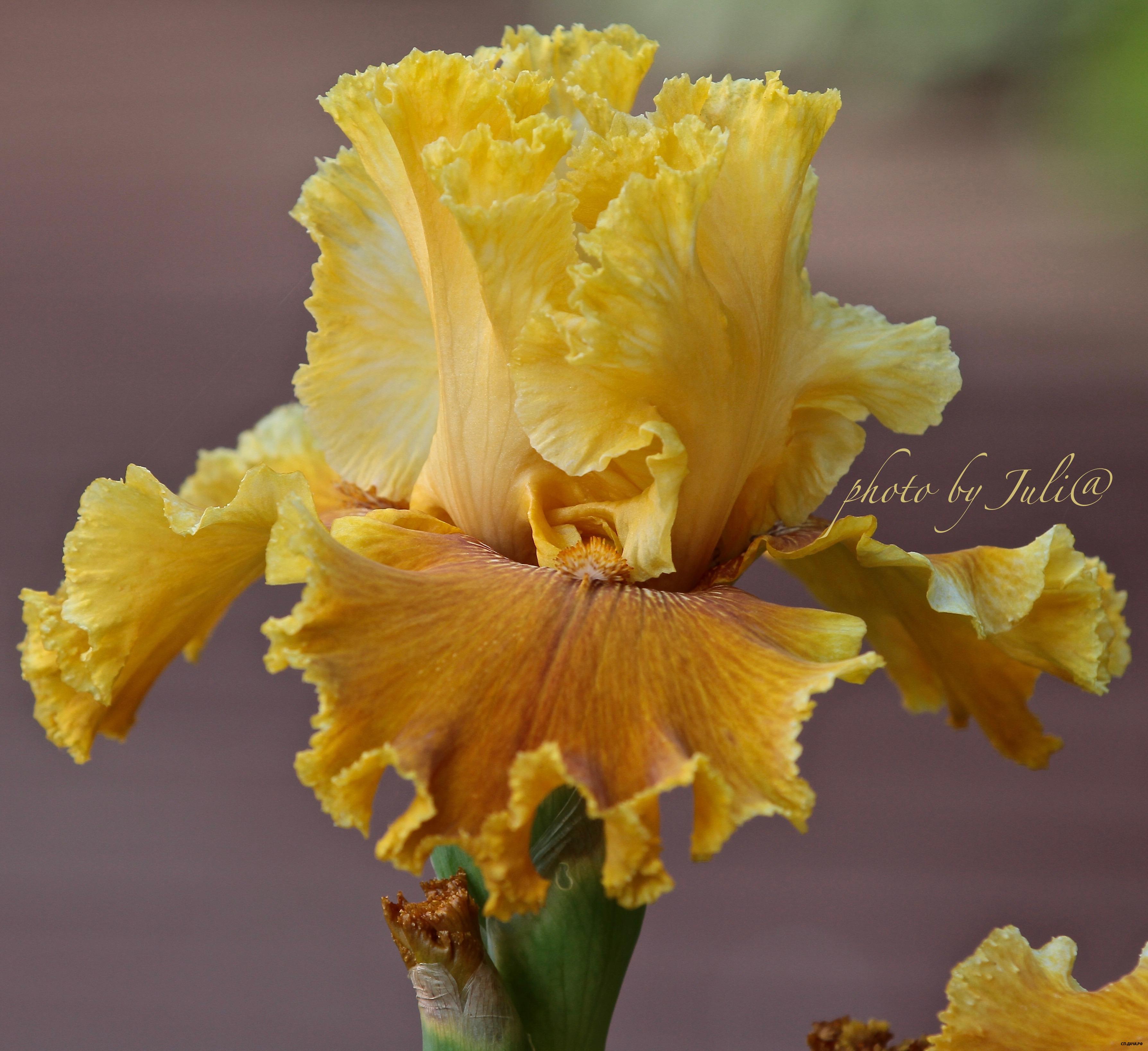 С. желтые, Ф. лавандовые с желтым основанием и коричневой каймой; оранжевая бородка заканчивается лавандовой «ложкой». Сильно гофрированный, рогатый.