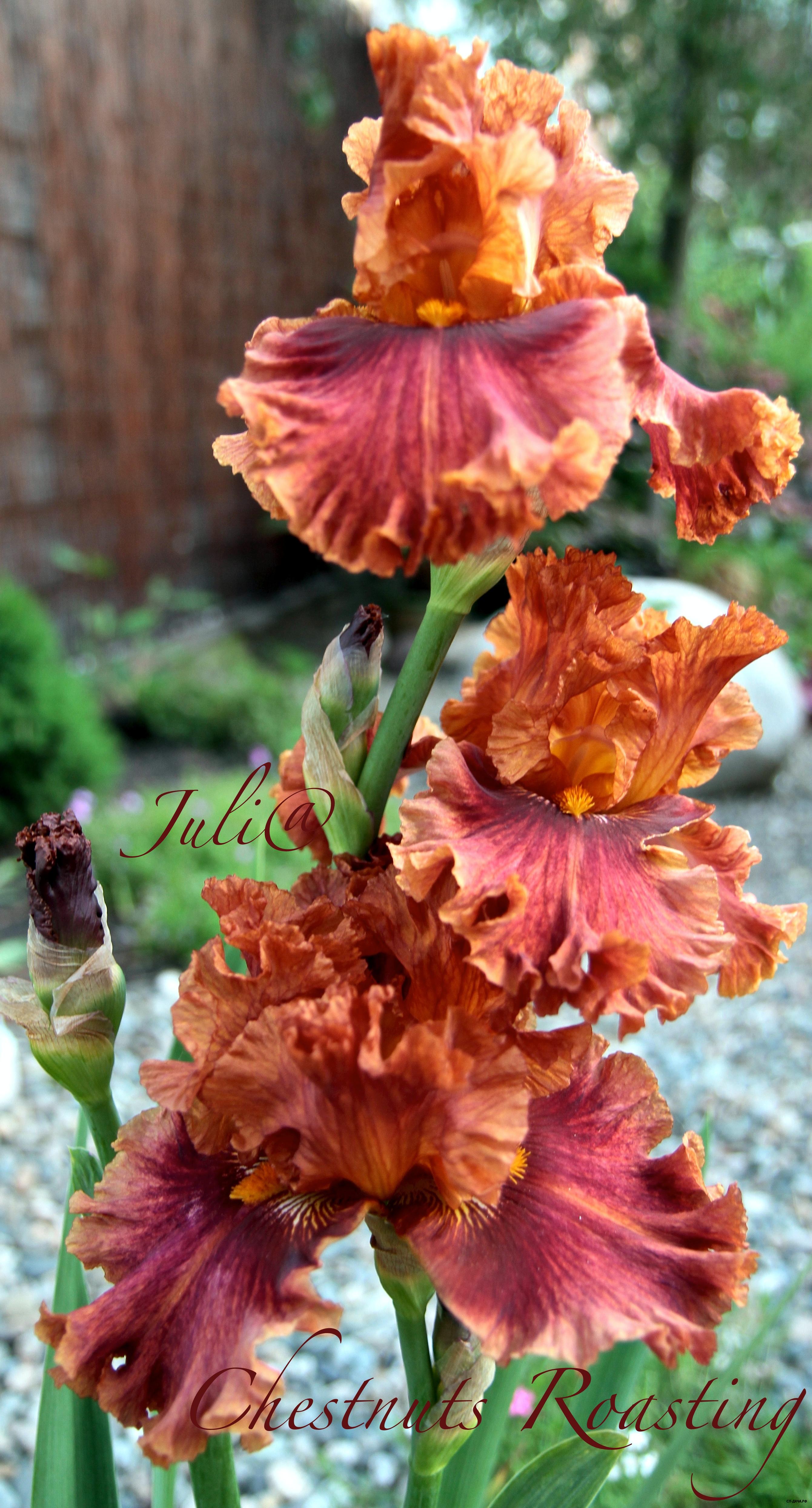Стандарты – красно-корично-кирпичные с размытым золотисто-желтым оттенком у основания, по средней жилке и прерывисто-пузырчастому краю; Фоллы - красно-корично-кирпичные с каштановыми плечами и кремовым штрихованием вдоль золотисто-горчичных бородок. Мускусный аромат. Очень гофрированный.Невероятно красивый суперсорт!