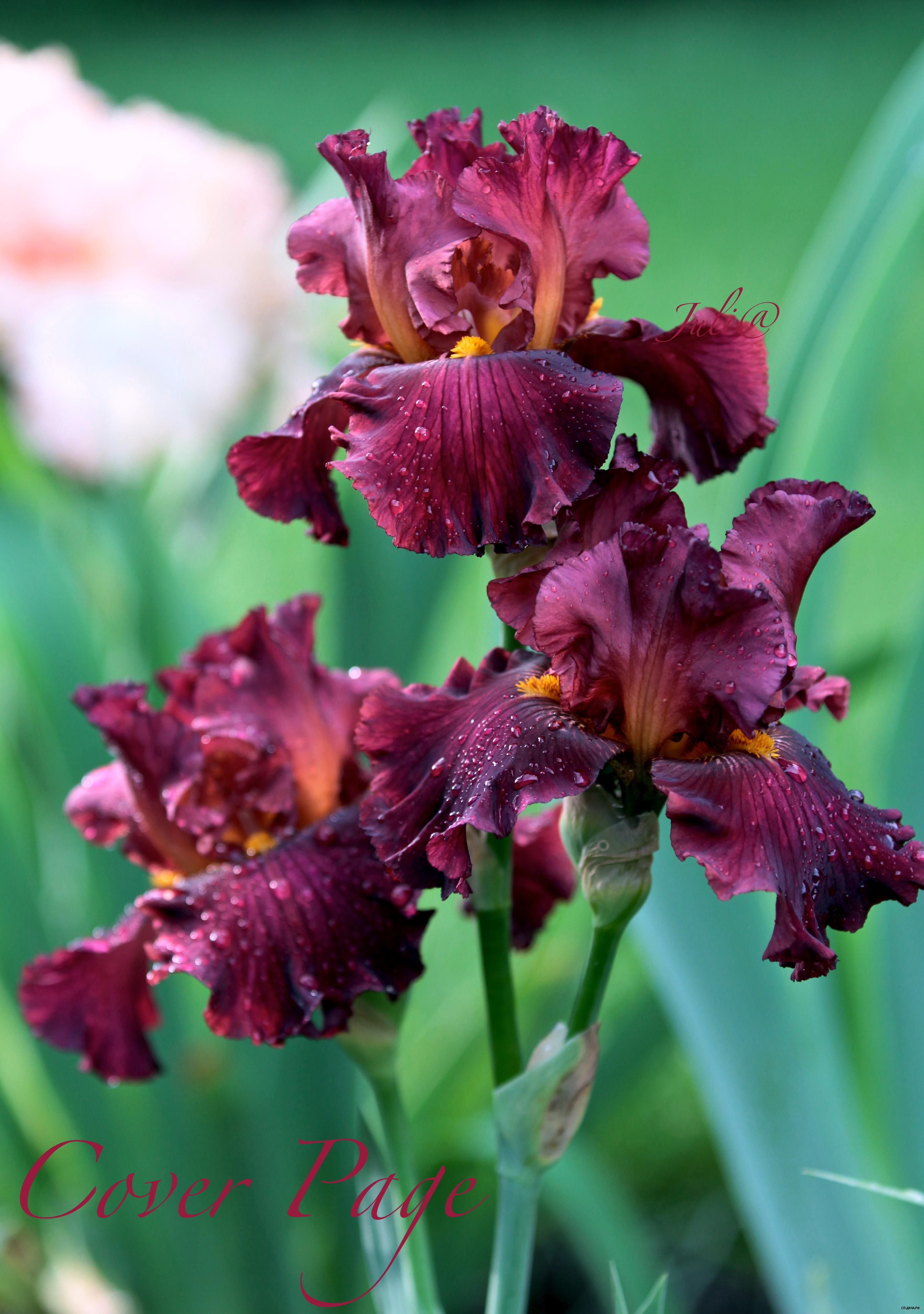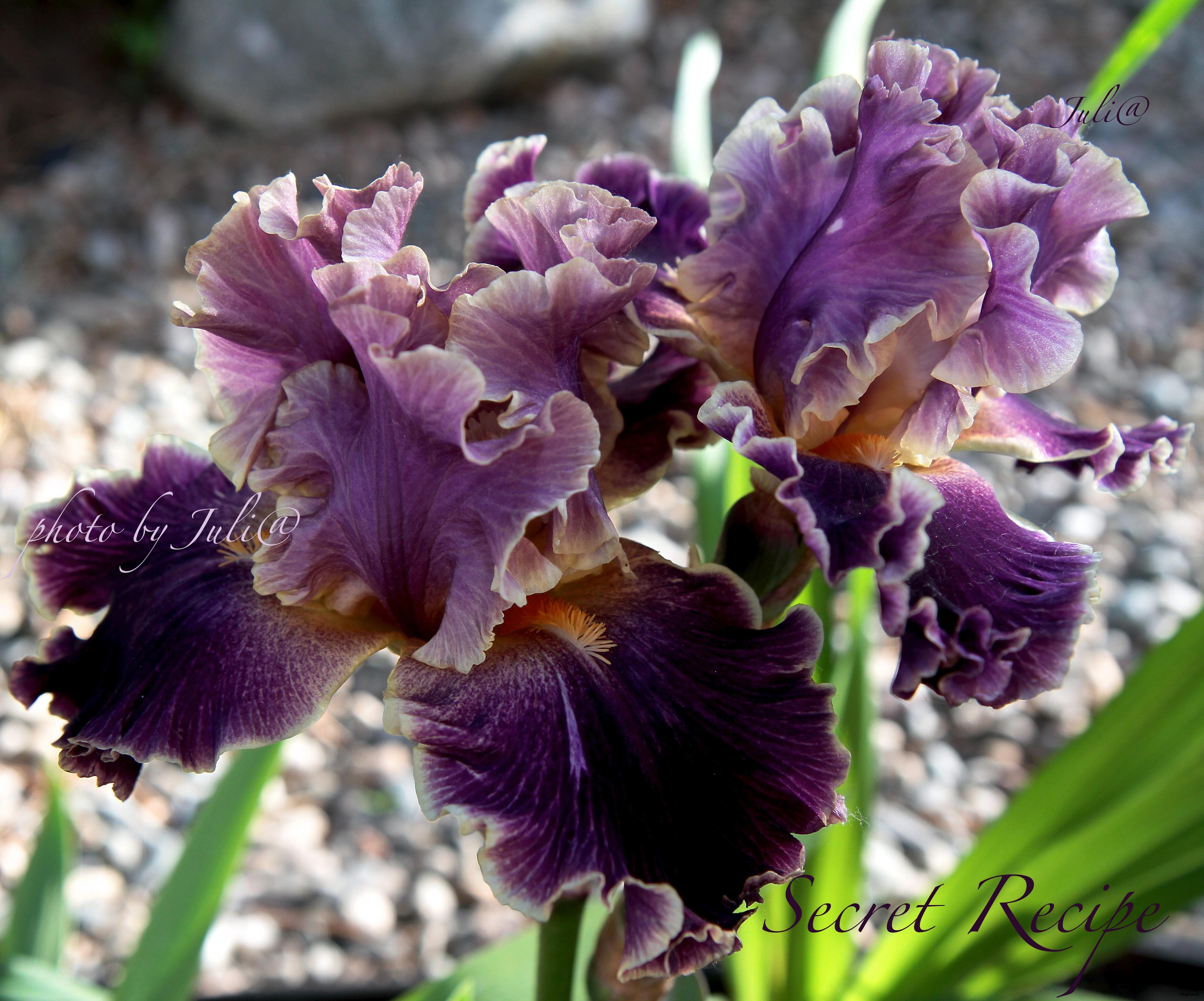 Бордово-розовые стандарты, бархатные сливово-бордово-красные фолы с оранжевыми бородками. Прекрасная форма. Роскошный темно-красный ирис! 30. Secret Recipe 350р