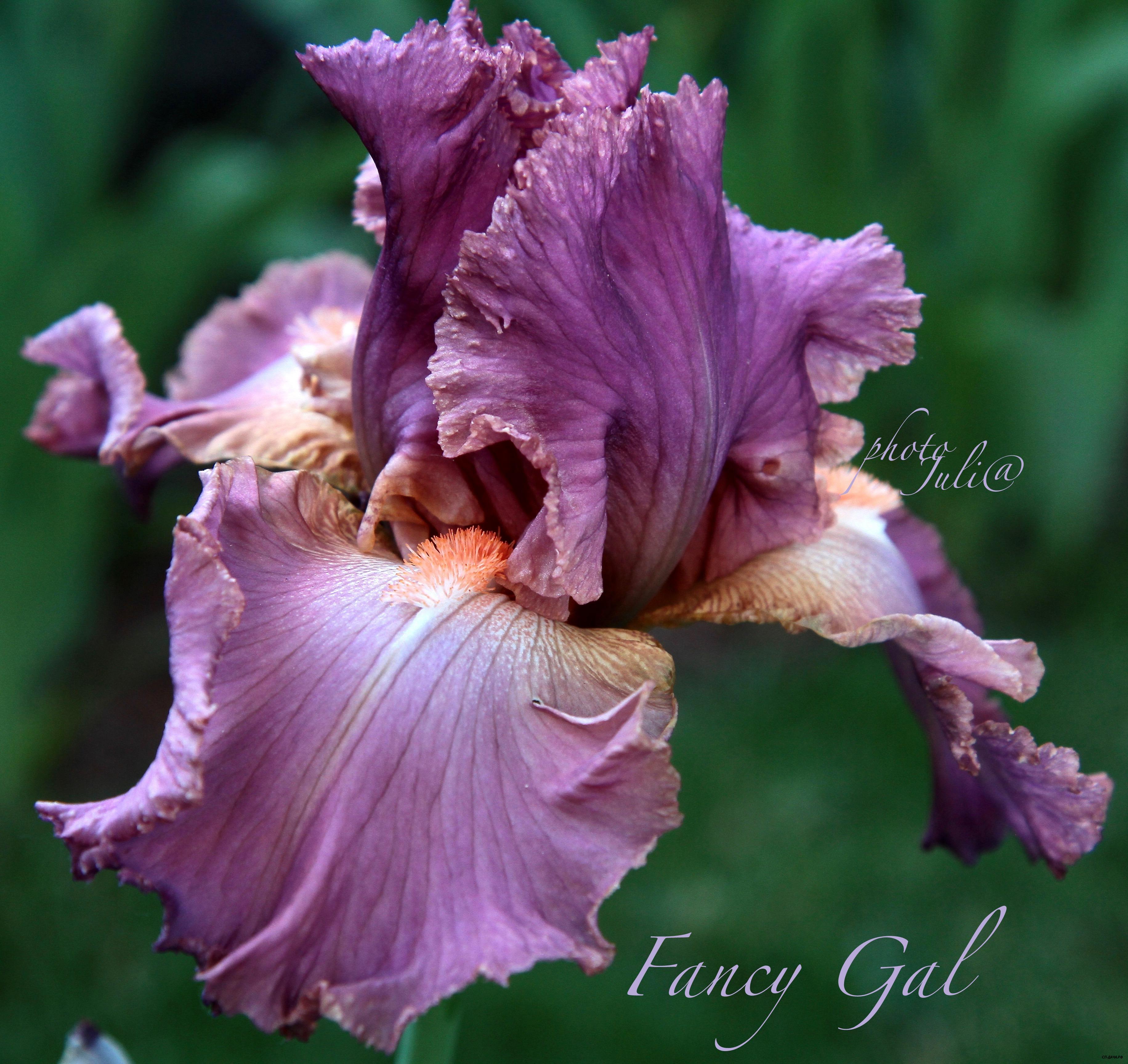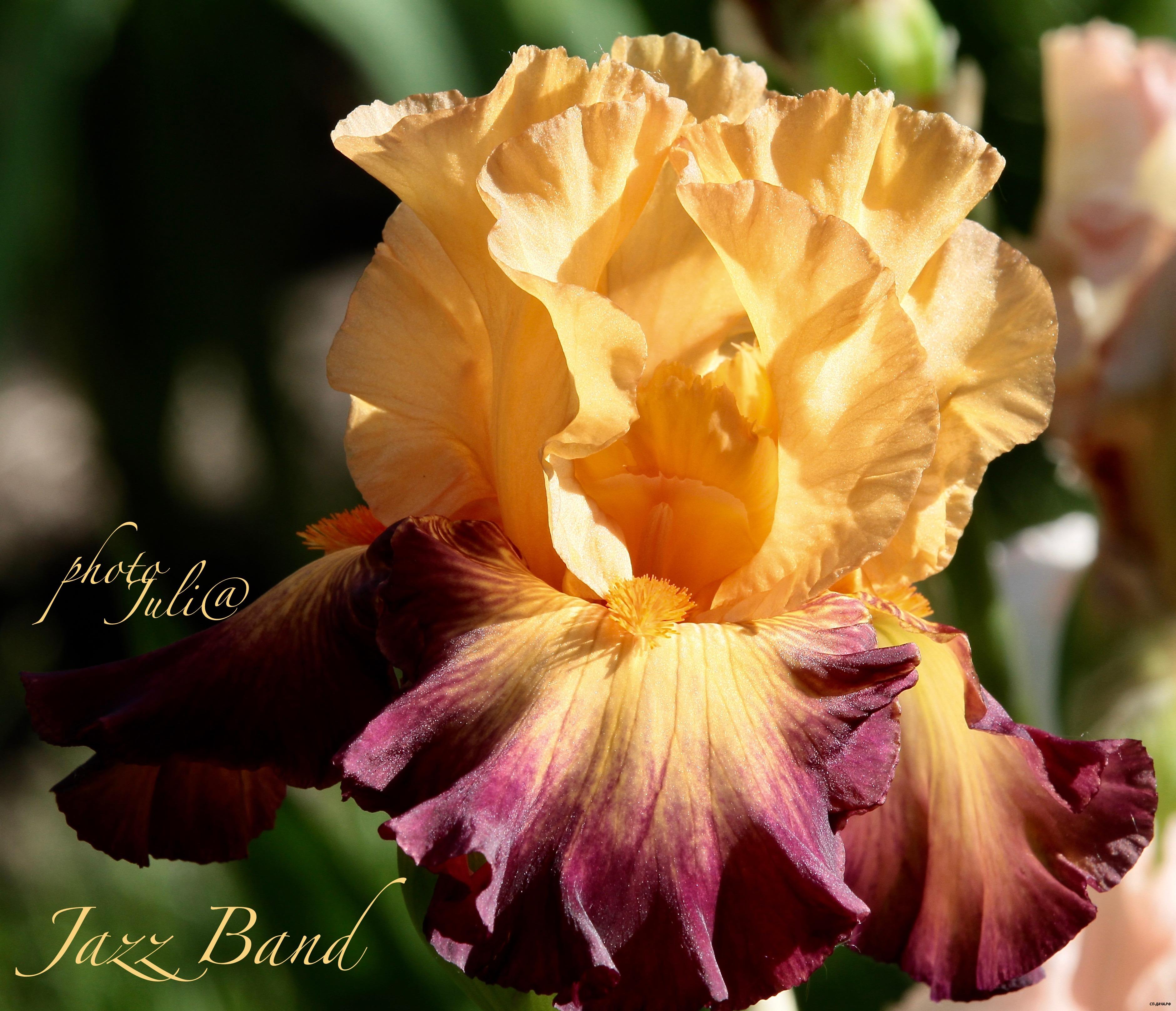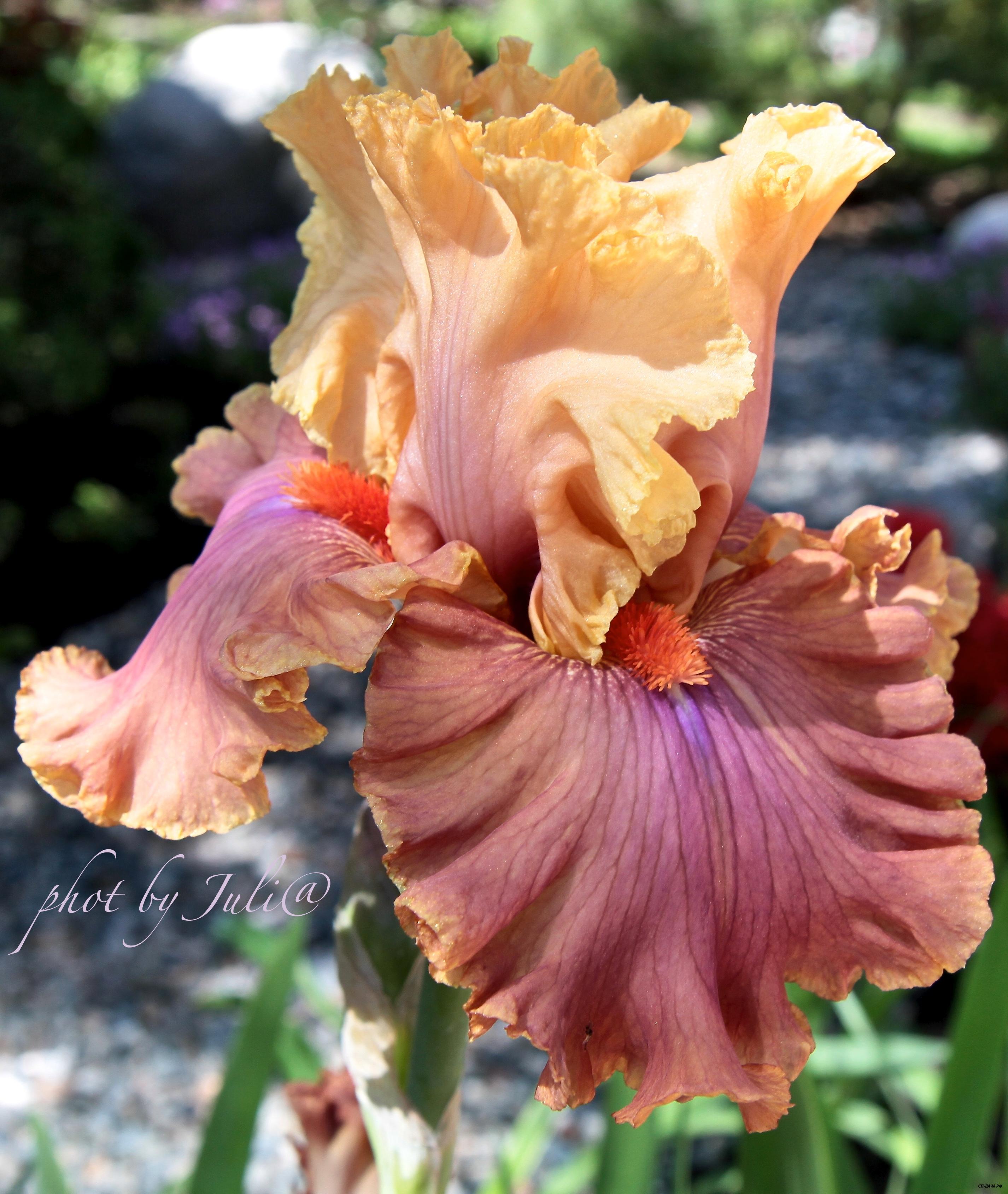 Супергофрированный и кружевной! Золотисто-розовые стандарты, яркие сливово-бордовые фолы с кремово-абрикосовой каймой и оранжевыми бородками.