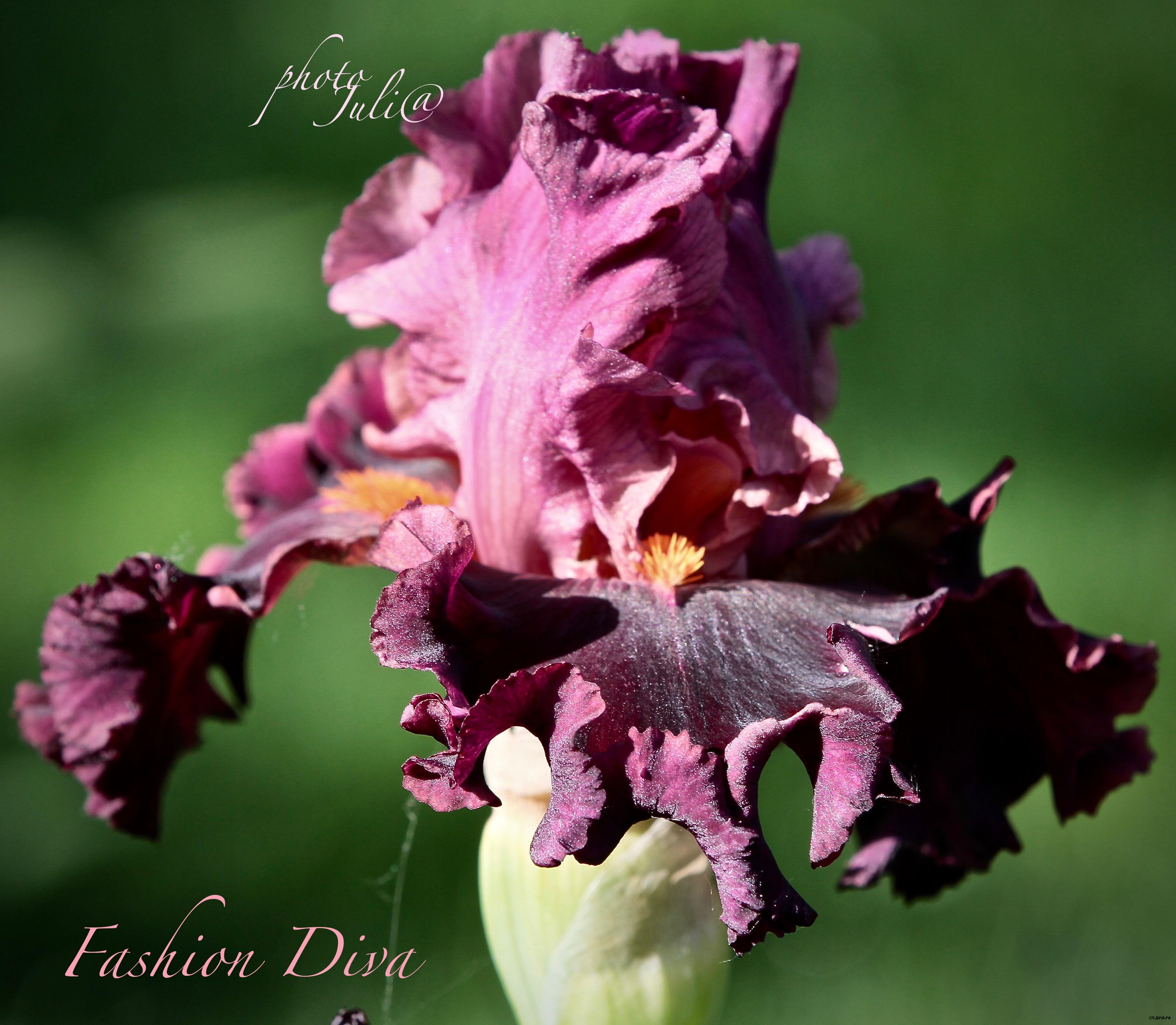 11. Fashion Diva 500р Шикарная модница! Огромные привлекающие к себе внимание цветы. Высокие розовые стандарты. Бархатные, красно-фиолетовые фолы с белой люминатой у основания и вспышками ярко оранжевых бородок подчеркнуты белыми короткими линиями. Гофрированный и изумительный ирис. На цветоносе 7-9 бутонов.