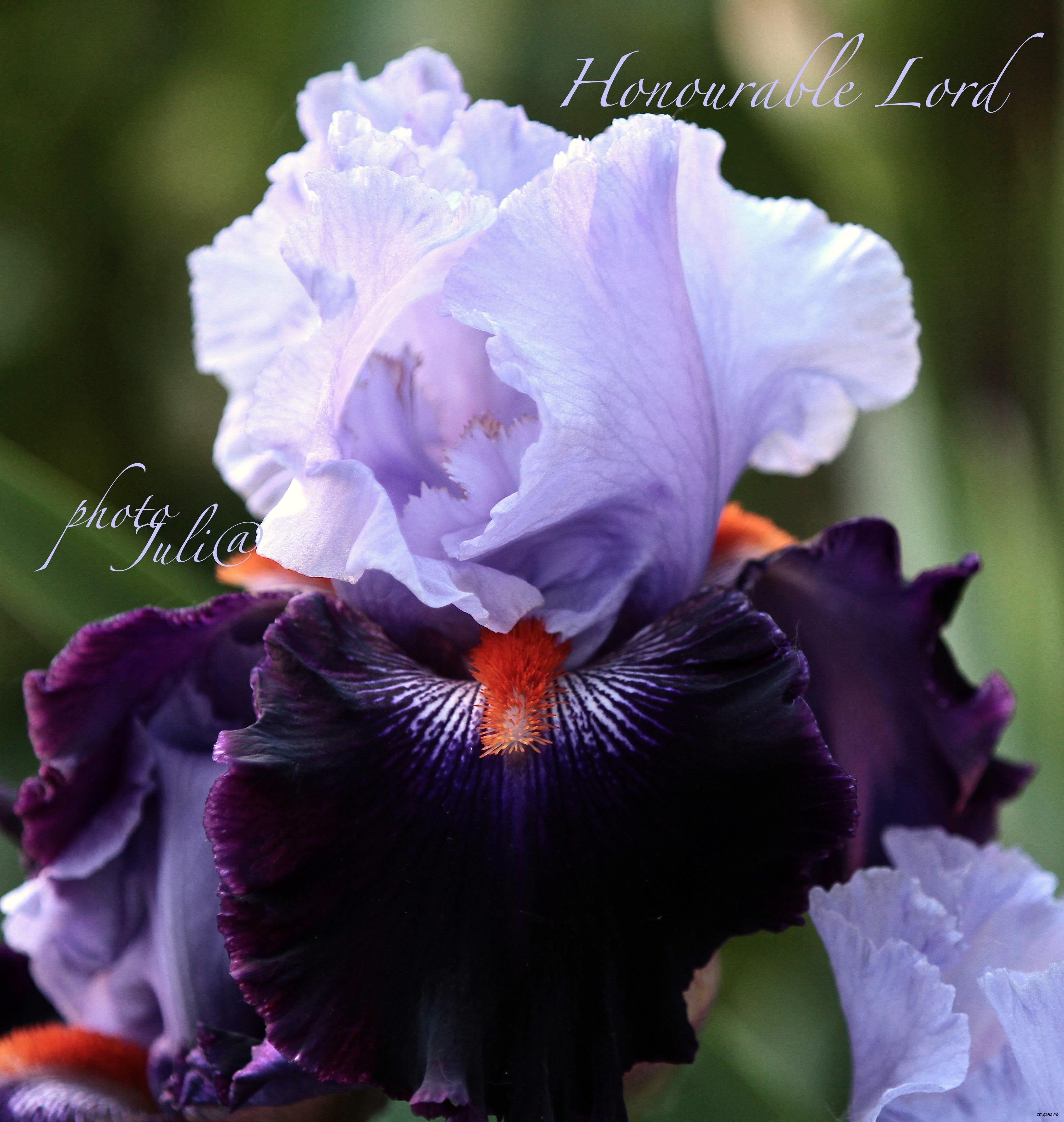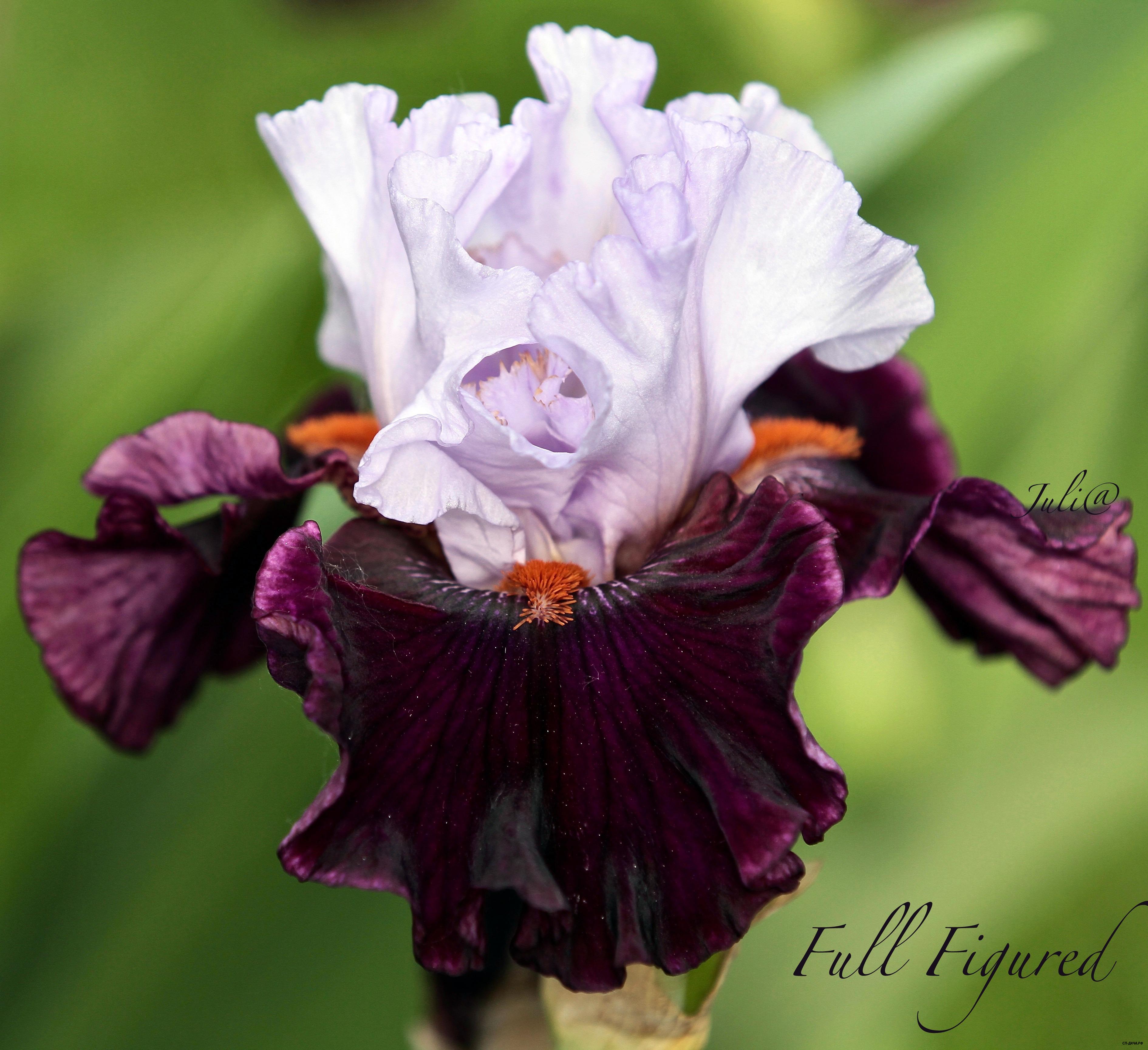 Лавандовый верх и чёрно-фиолетовый низ, акцентированный мандариново-красными бородками, и белыми лучами вокруг. Пурпурные основания листьев. Великолепие гофрировки и кружева! Сорт - полное совершенство!