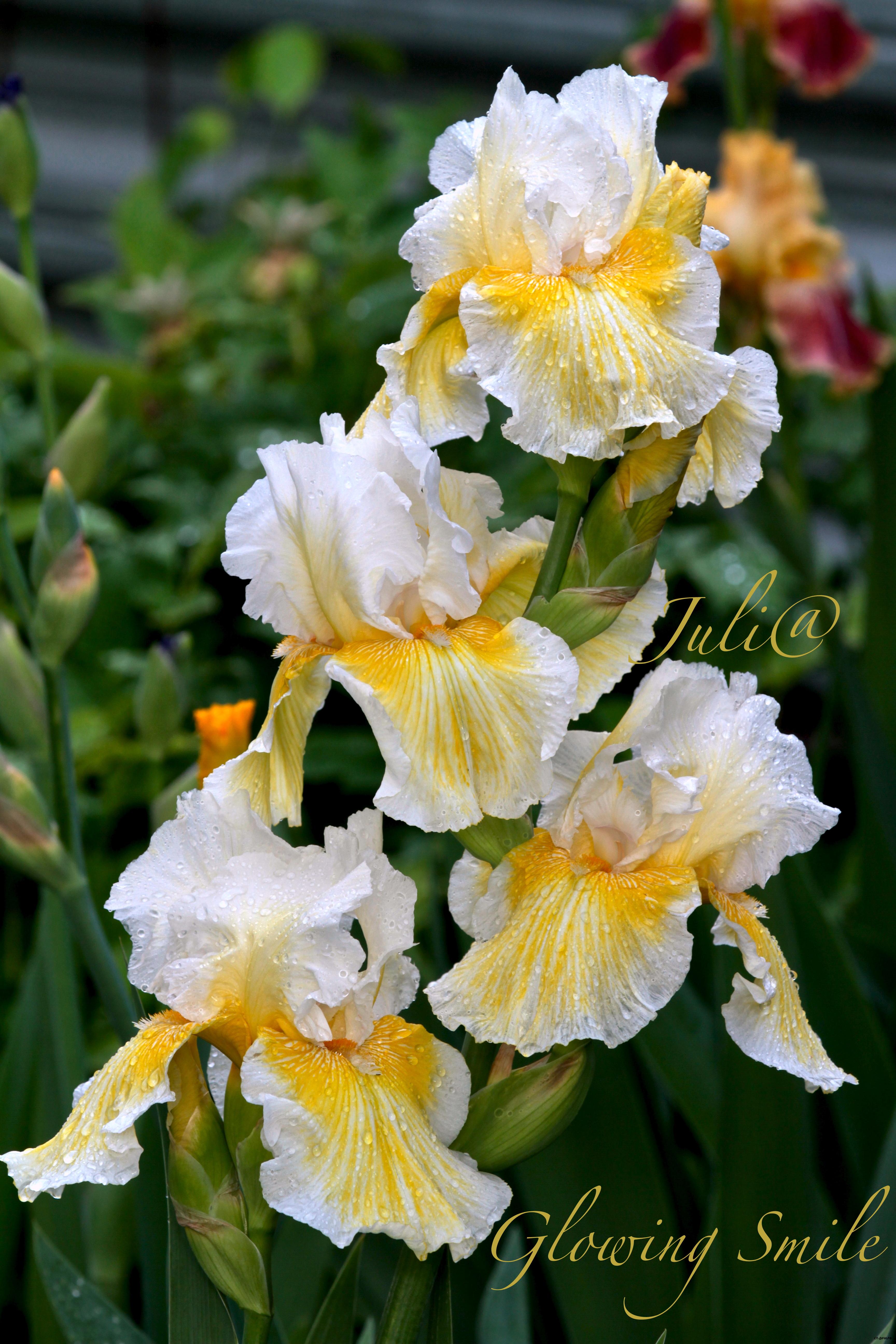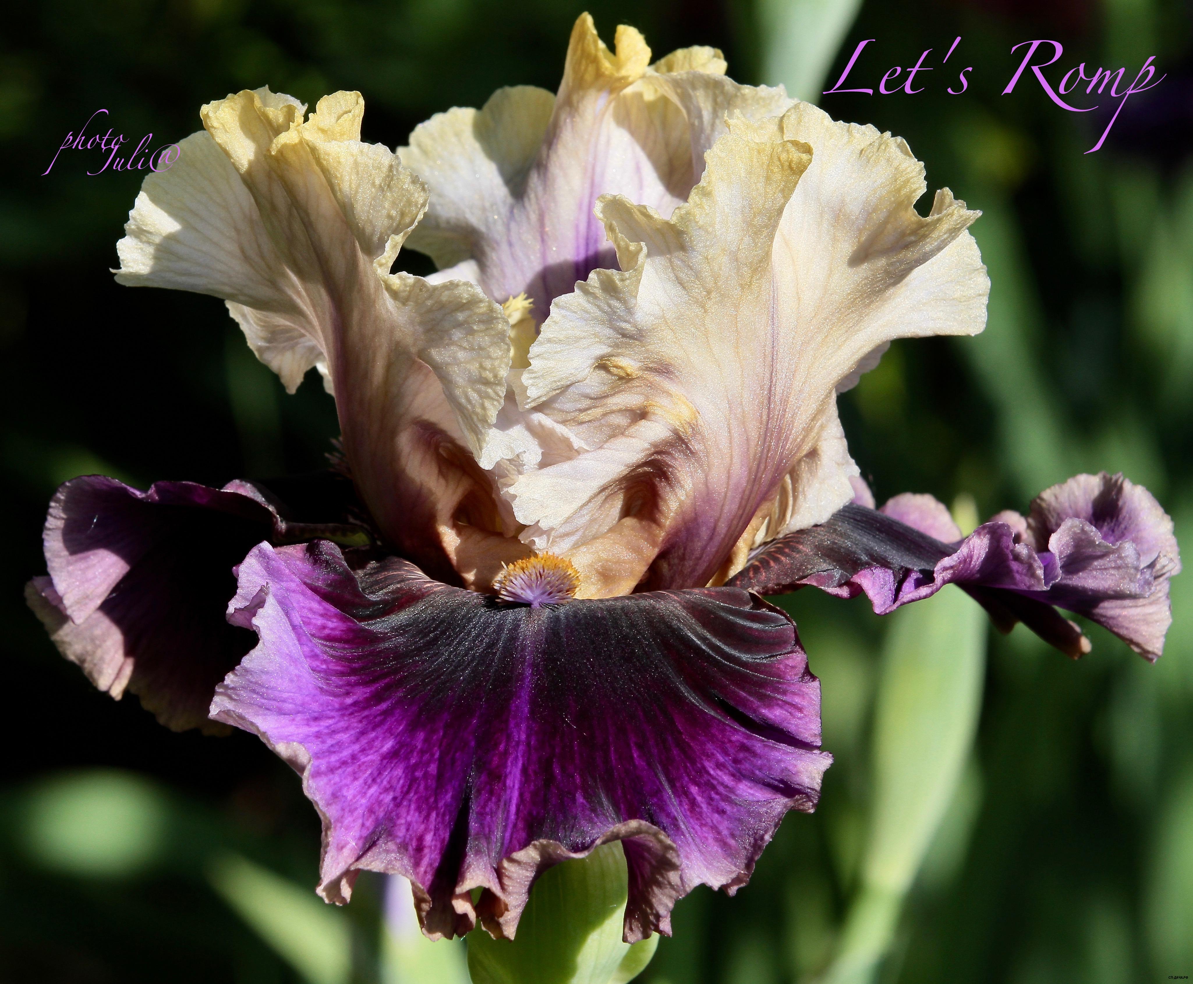 С.- ярко-желтые, кружевные, гребни желтые; Ф.- светло-лиловые, с яркими золотыми плечами, очень узкой приглушено-желтой кромкой и такой же подкладкой; бородки оранжевые. Легкий аромат. Парящие, с глубокой красивой гофрировкой цветы, разветвленные стебли с 8-10 бутонами.