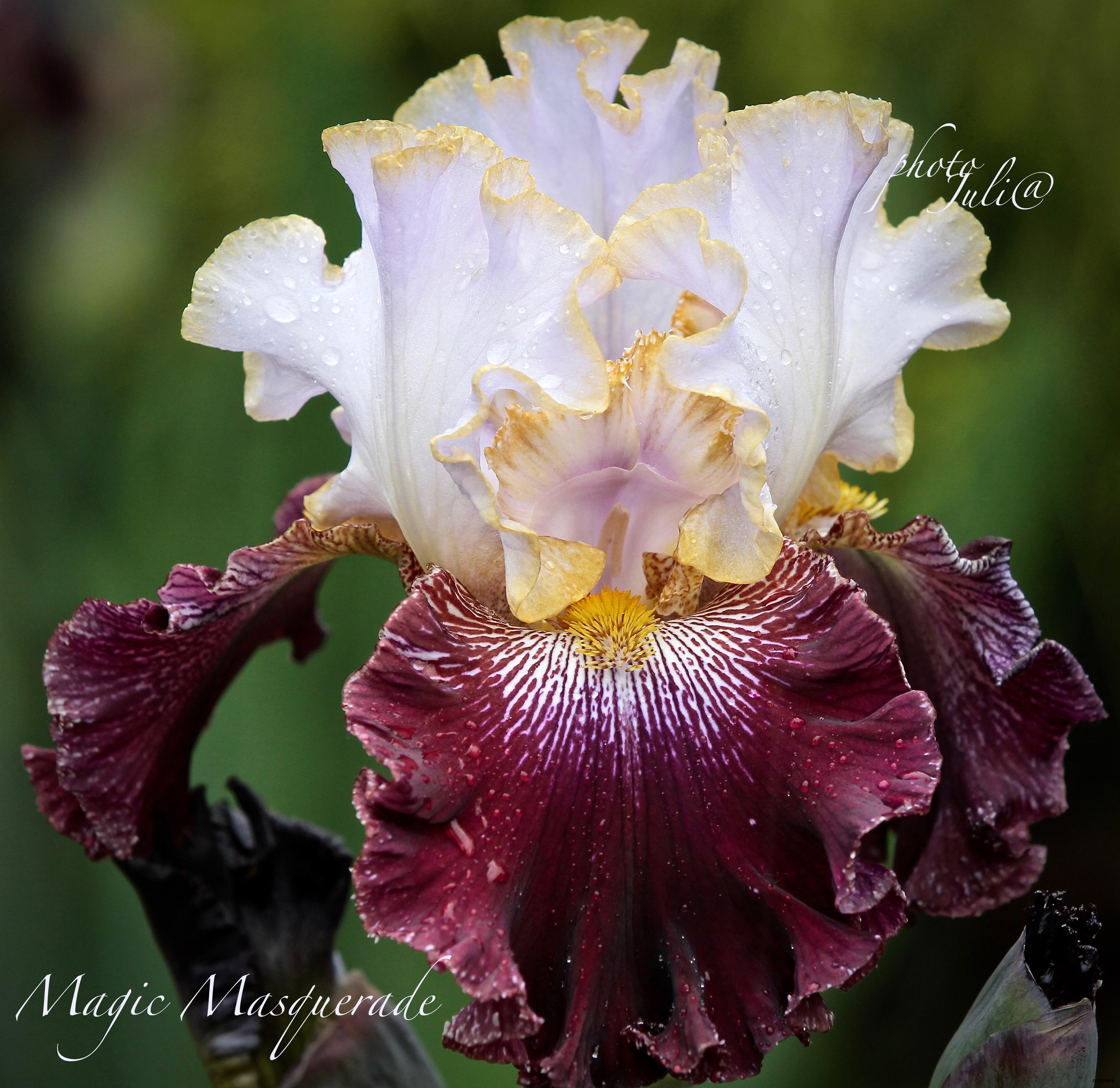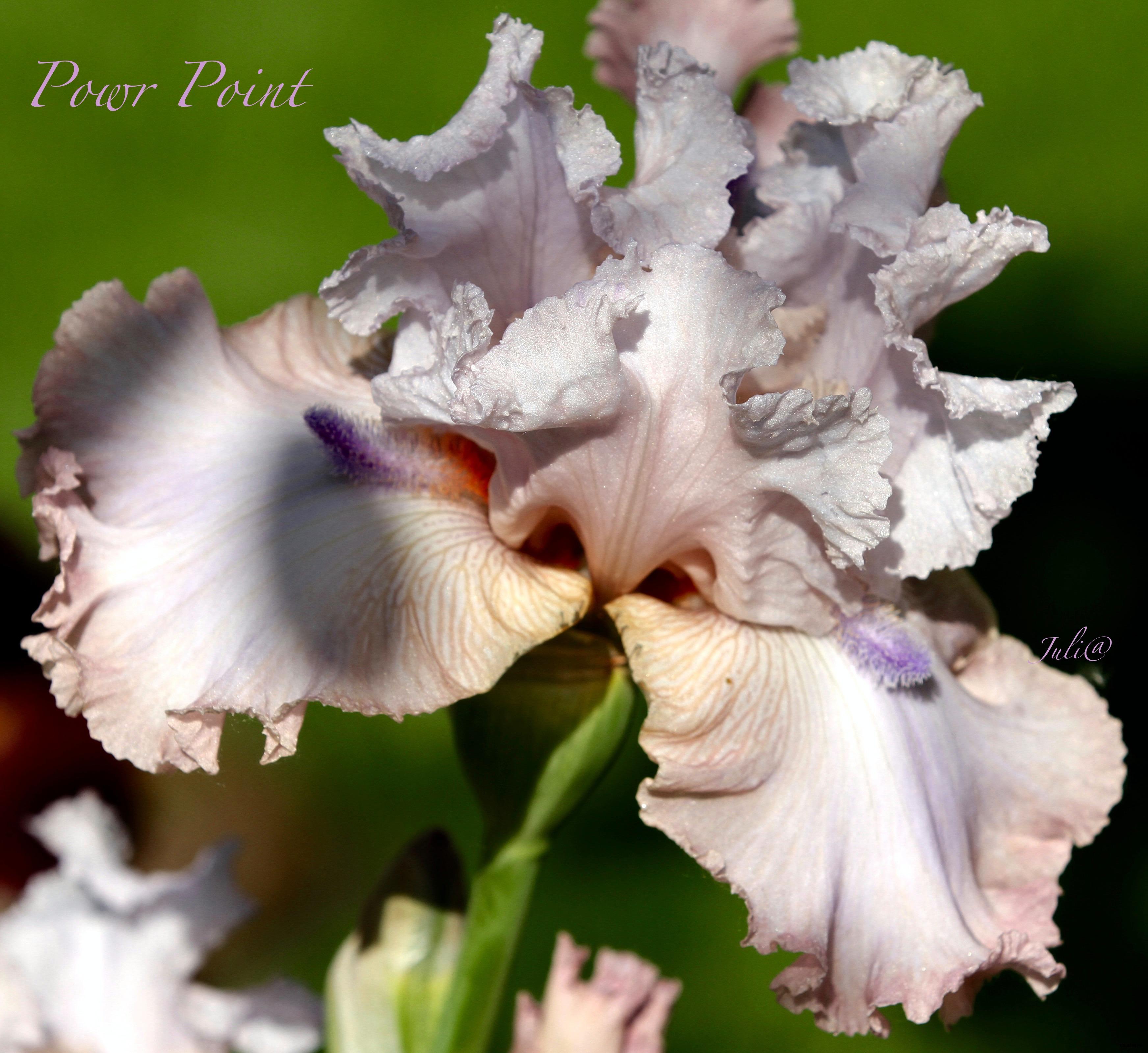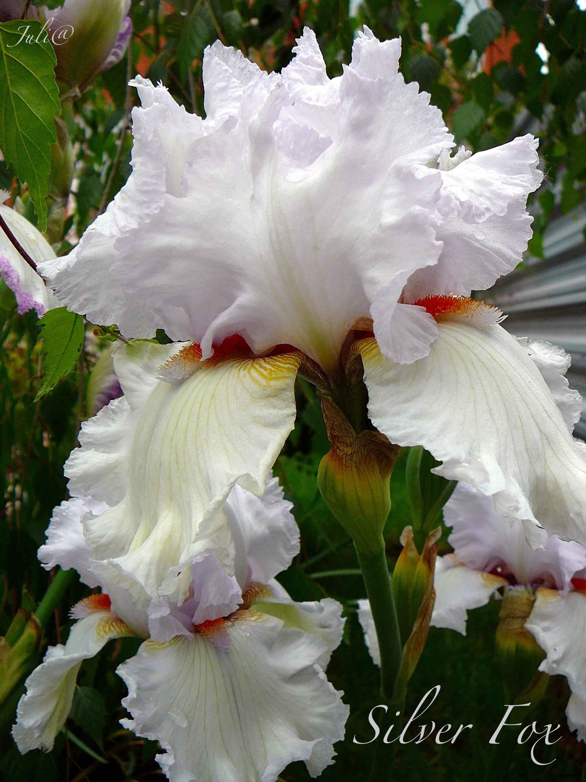 Стандарты – белые с легким лавандовым оттенком и тончайшей золотой окантовкой по краям, фолы – темно- фиолетовые с краснотой и белыми тонкими штрихами у основания. Бородка – цвета старого золота. На обратной стороне нижних лепестков – белое точечное покрытие. Цветок – гофрированный и кружевной. Ветвистый, обильноцветущий сорт, несущий 8-9 бутонов.