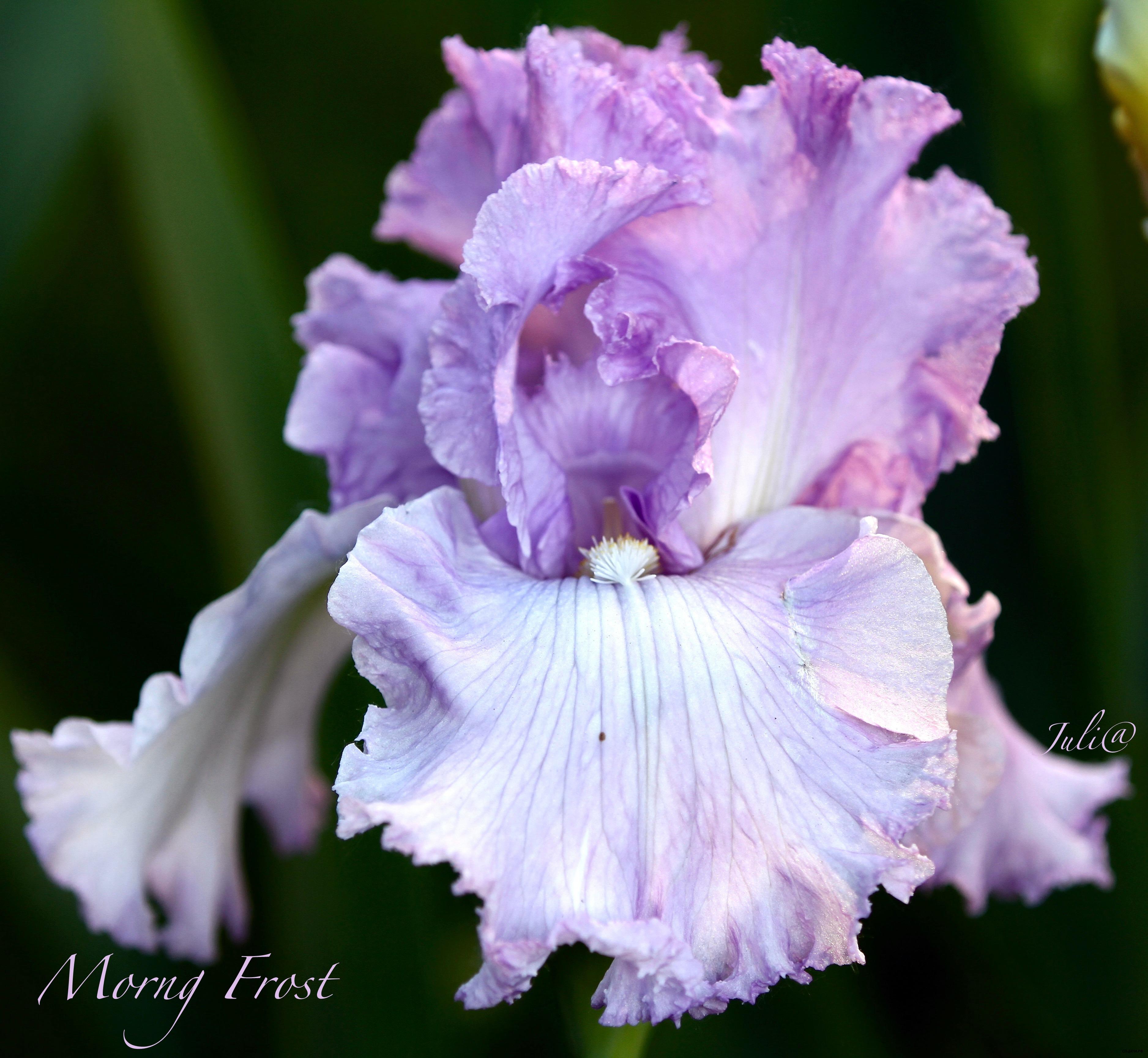 стандарты цвета ледяной лаванд, жилки чуть темнее; фолы -светло-фиолетовые, оборка цвета стандартов, с маленькими коричневыми плечиками. Цветочный водопад! Огромный. Очень красиво смотрится в саду.