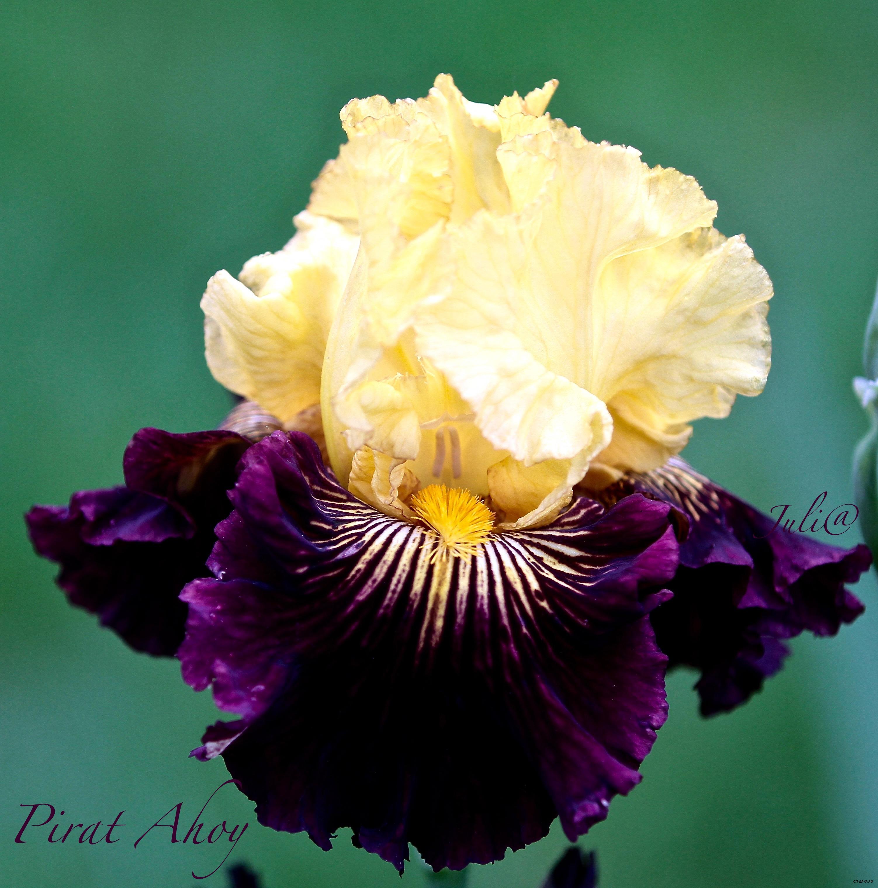 Фантастической формы, пузырчатый, очень гофрированный цветок. Розово-персиковые, переходящие в лиловые стандарты, насыщенно сиреневые в полоску фолы с белым пятном у ярких оранжевых бородок. Изысканная форма Ghio – высокий класс! 25. Pirate Ahoy 400р