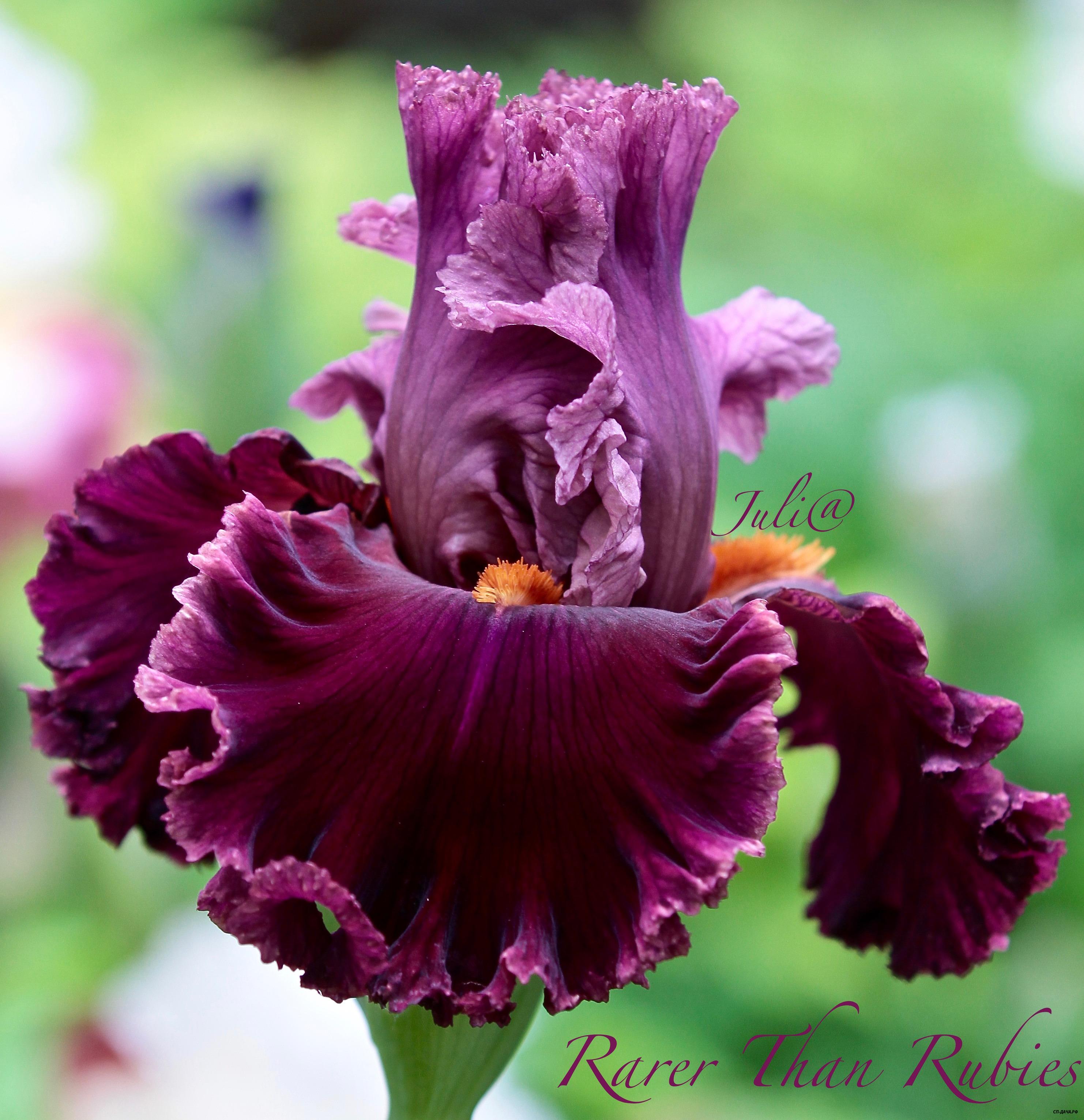 Вишнево-малиновый с приглушенным фиолетовым вливанием на фолах. Золотые бородки. Хорошо гофрированный чудесный ирис!