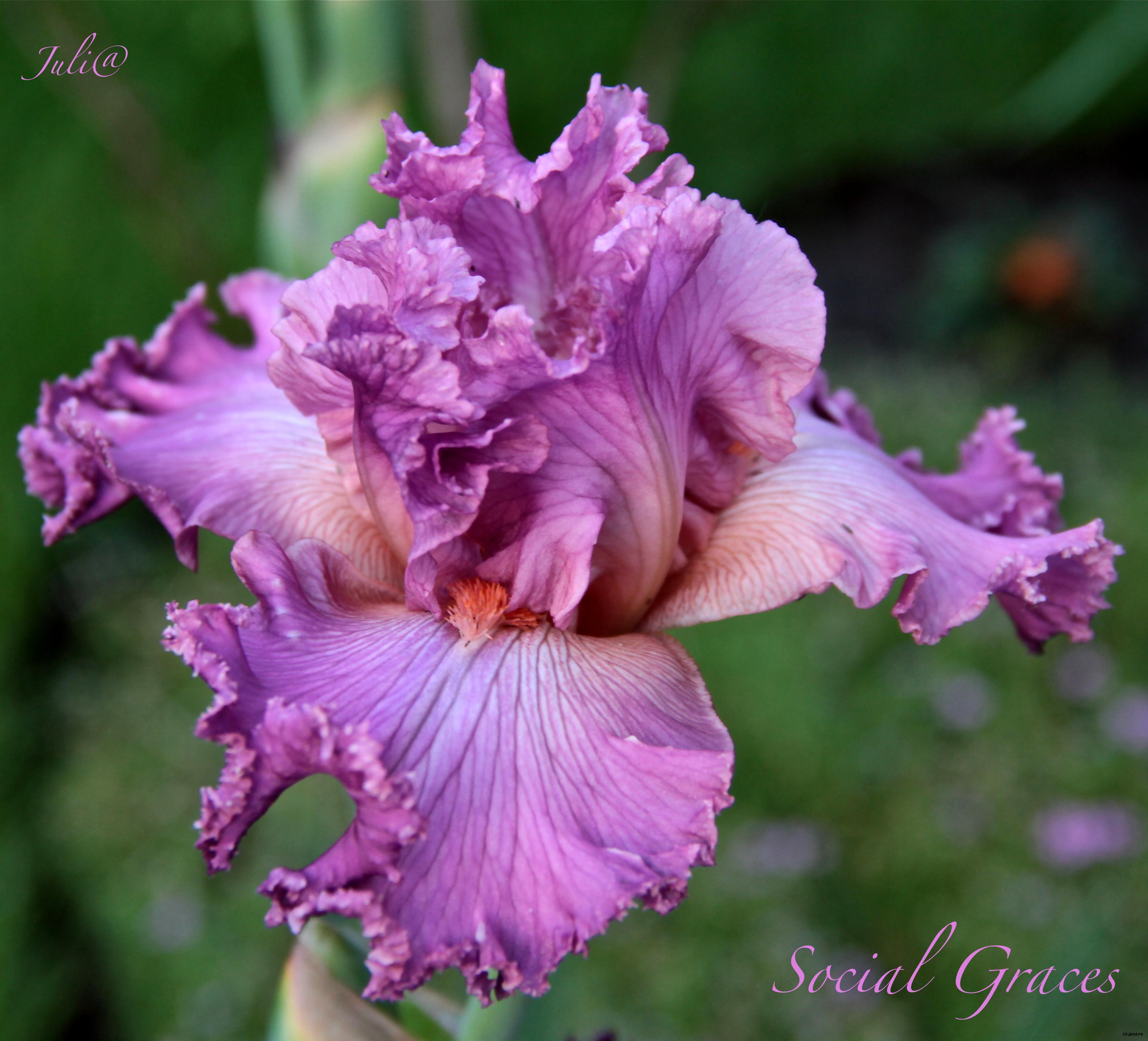 Стандарты - белые с голубоватым оттенком, Фоллы - белые с жёлто-зелёным оттенком и жёлто-зелёной сеткой у оснований; бородки - красные со светло-сиреневыми кончиками. Роскошный цветок гофрированный и кружевной. 32. Social Graces 200р