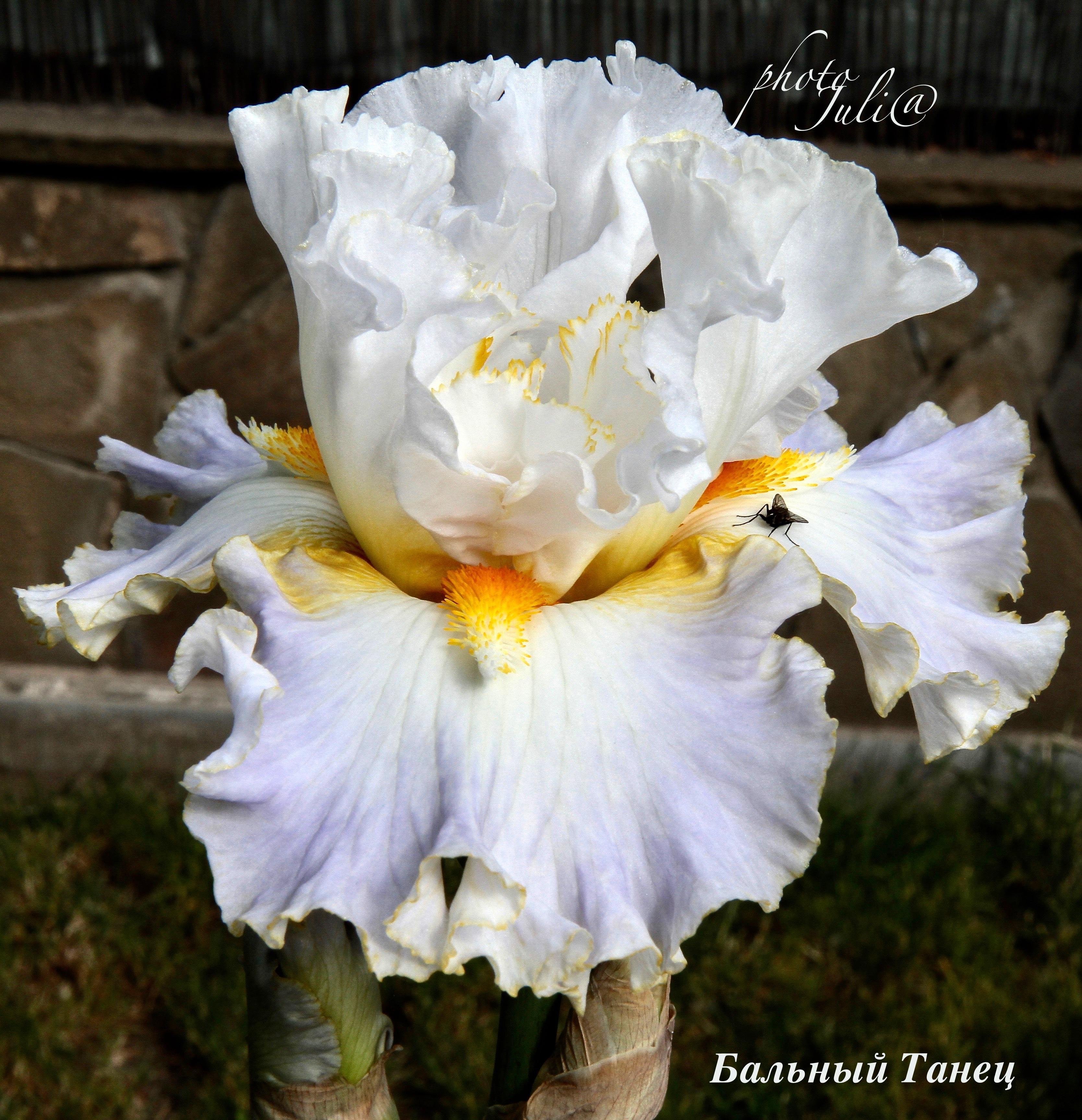 Белые стандарты с бледно-фиолетовым оттенком, бархатные фолы вокруг оранжевых бородок синие, к краям – темно-виноградно-красные. Вокруг бородок белые пятна с темными прожилками.