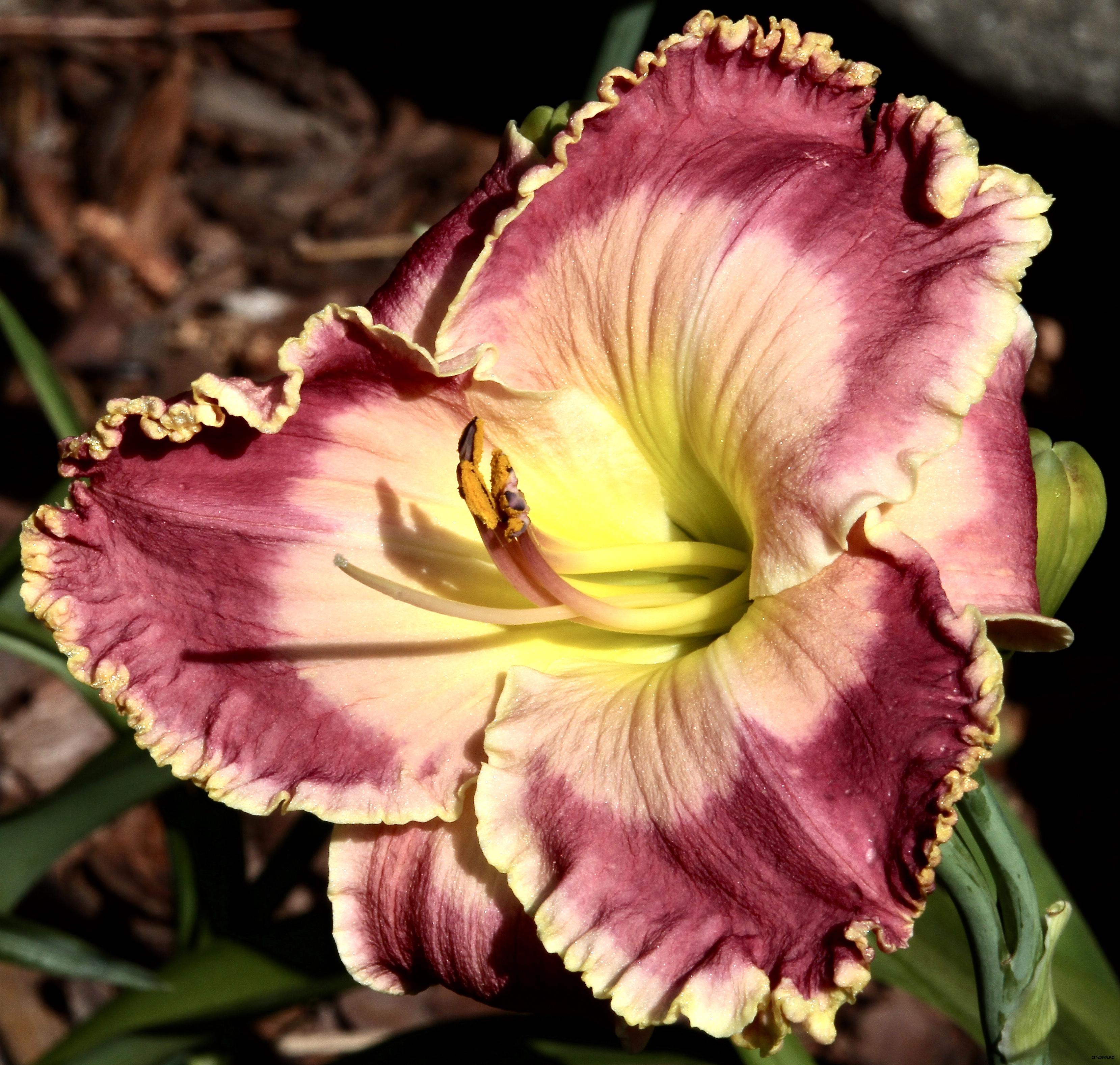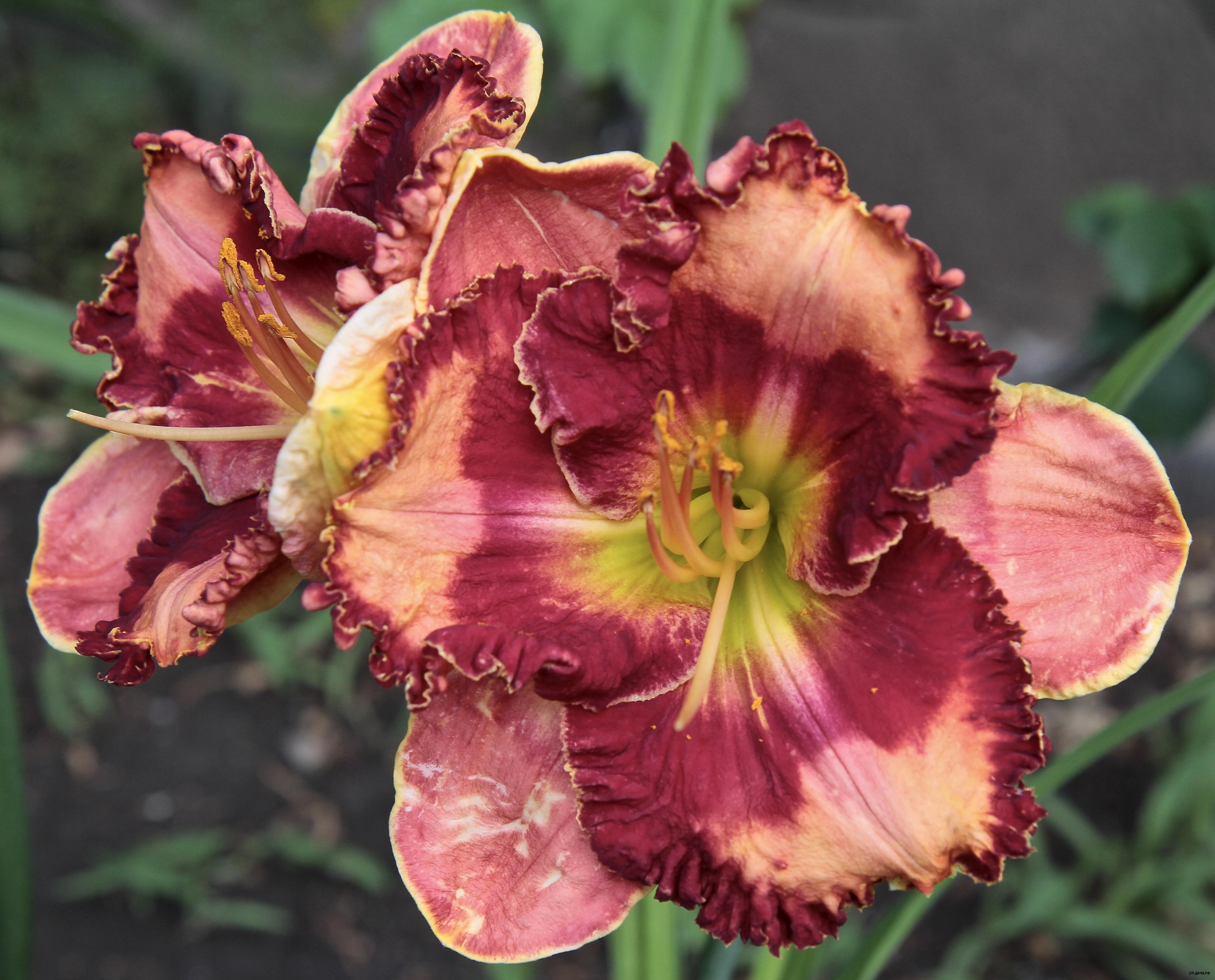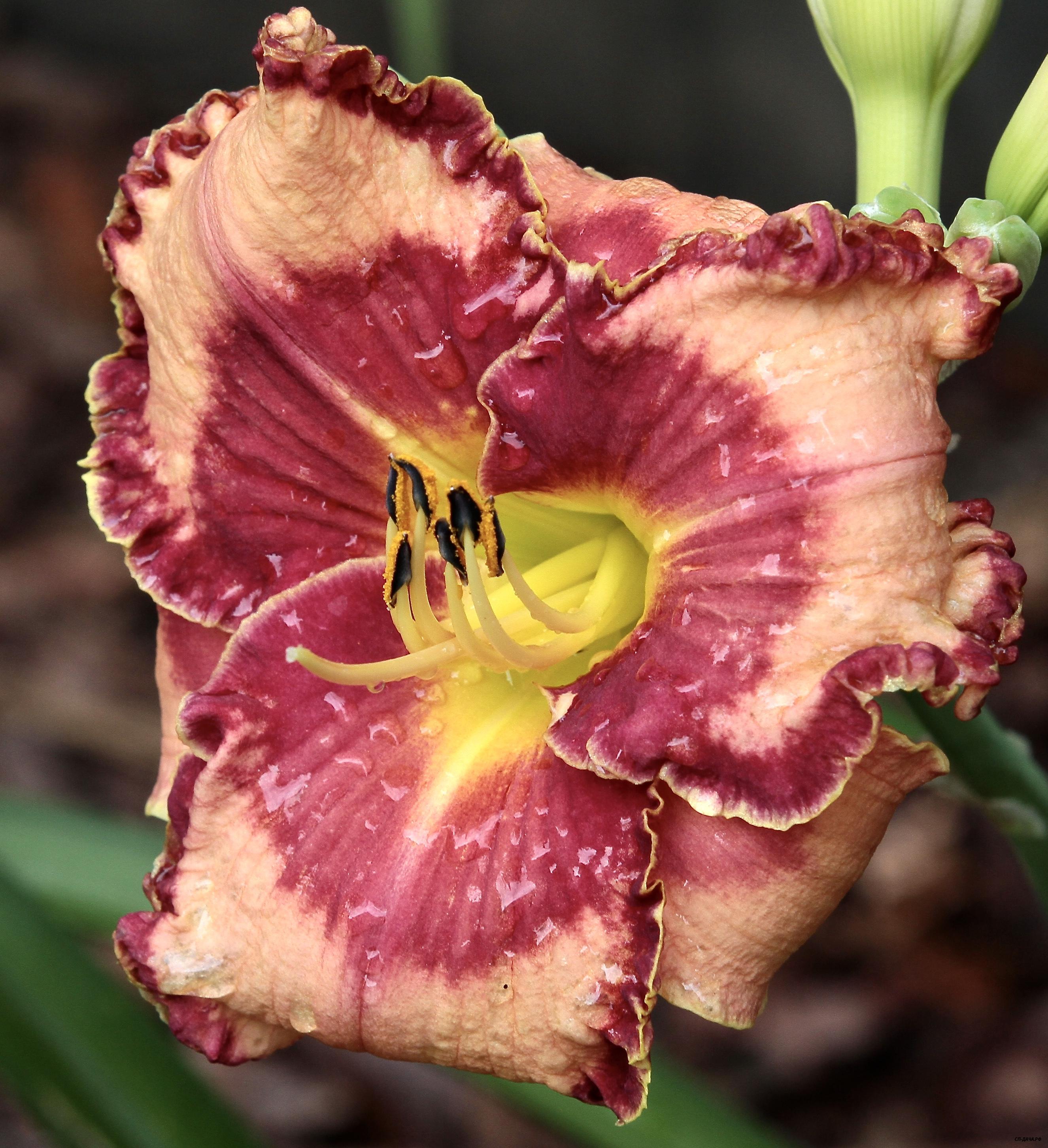 Кремово-малиновый с темным голубовато-малиновым глазом над зеленым горлом и тройной гофрированной каймой - малиновой, синей и белой. На каждом цветоносе 35 бутонов.