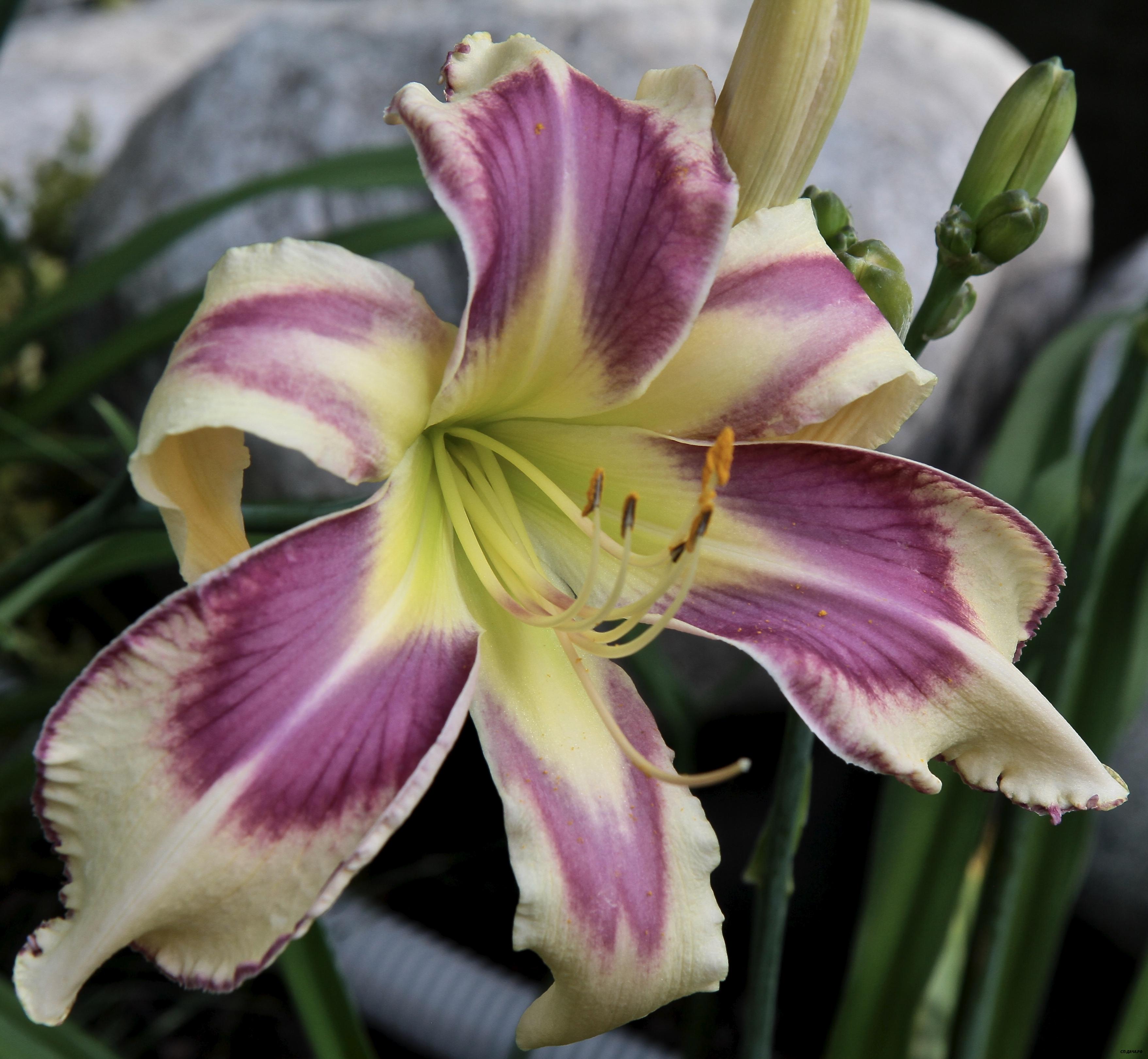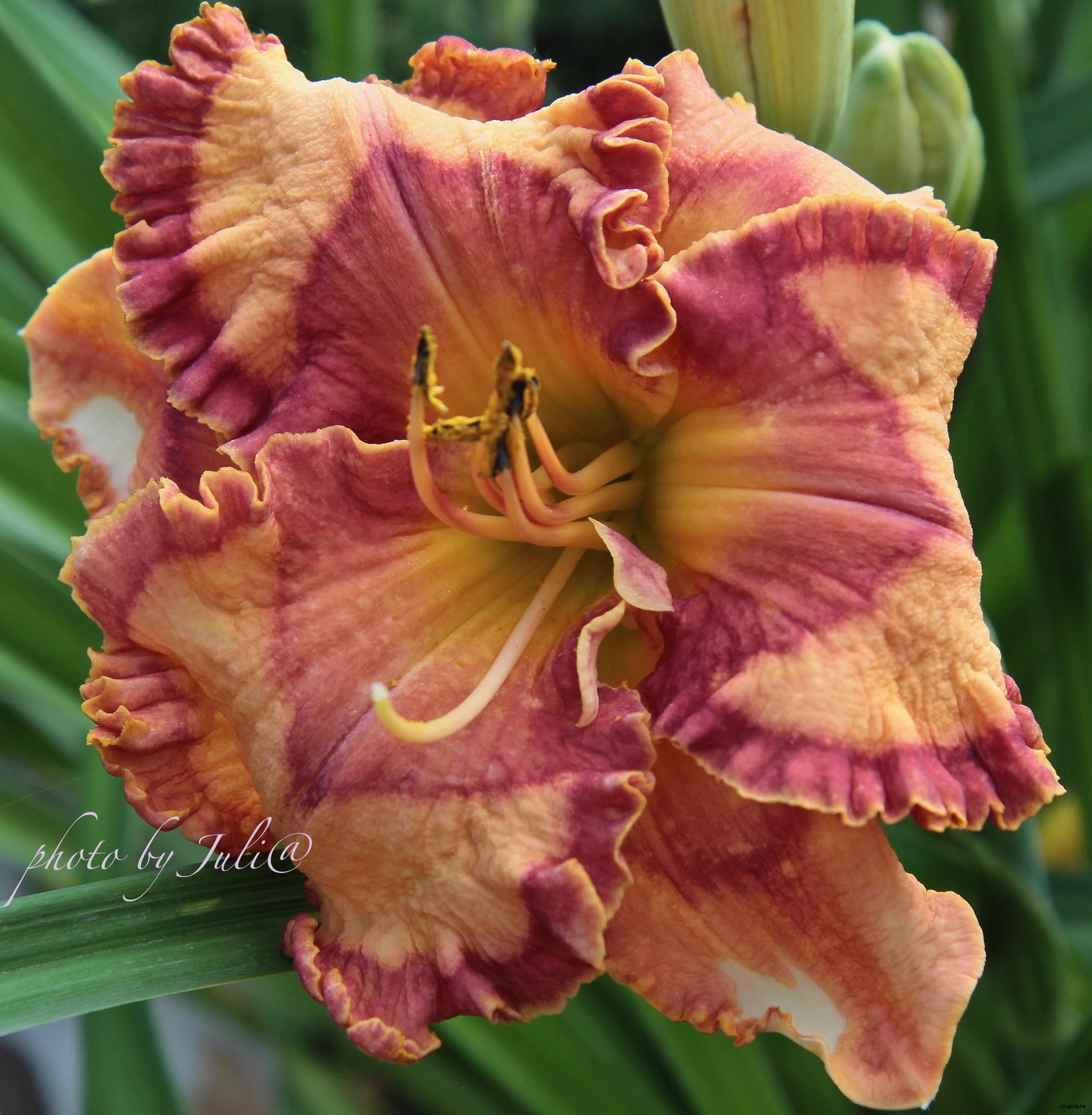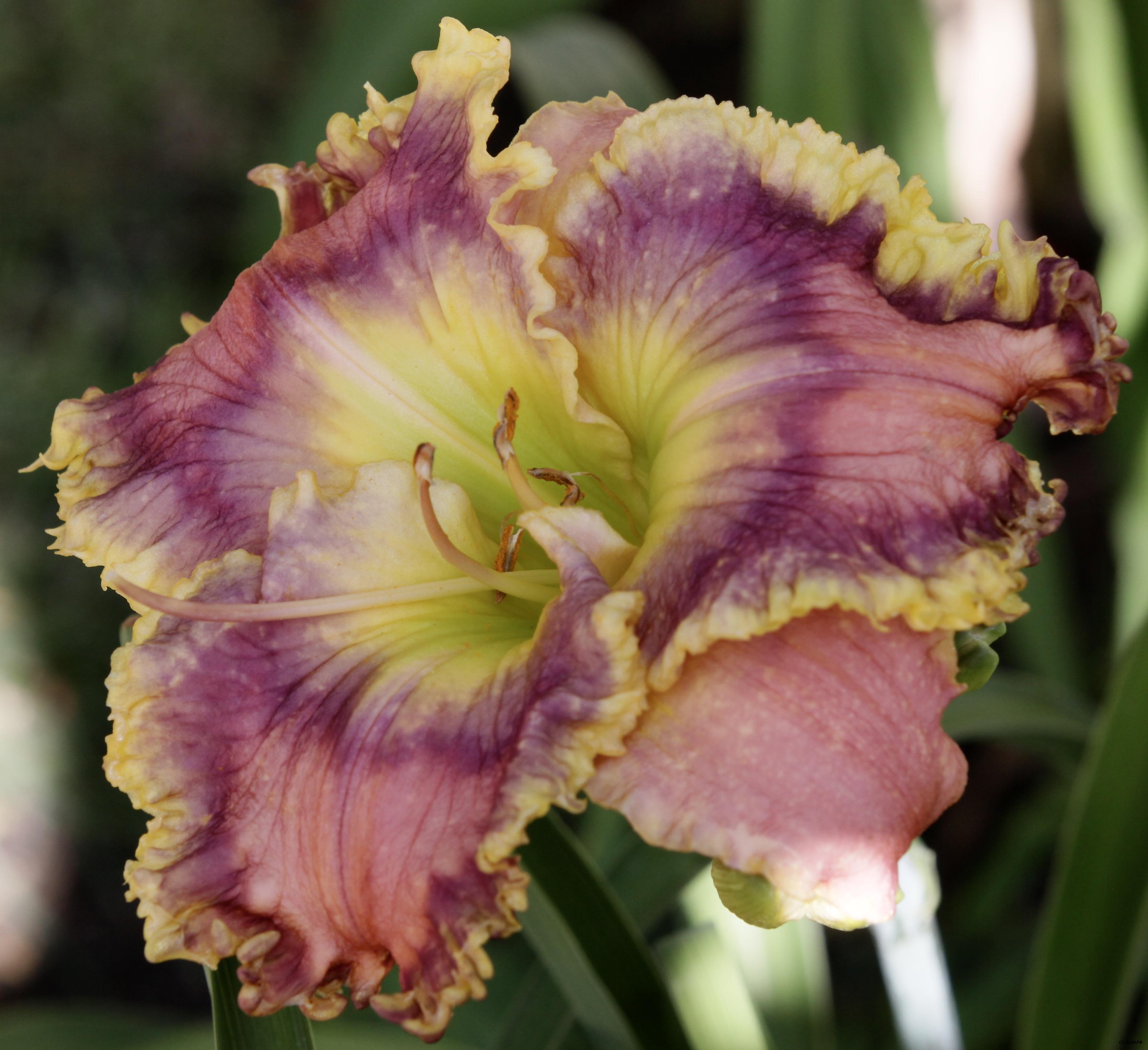 Кремово-малиновый с темным голубовато-малиновым глазом над зеленым горлом и тройной гофрированной каймой - малиновой, синей и белой. На каждом цветоносе 35 бутонов.