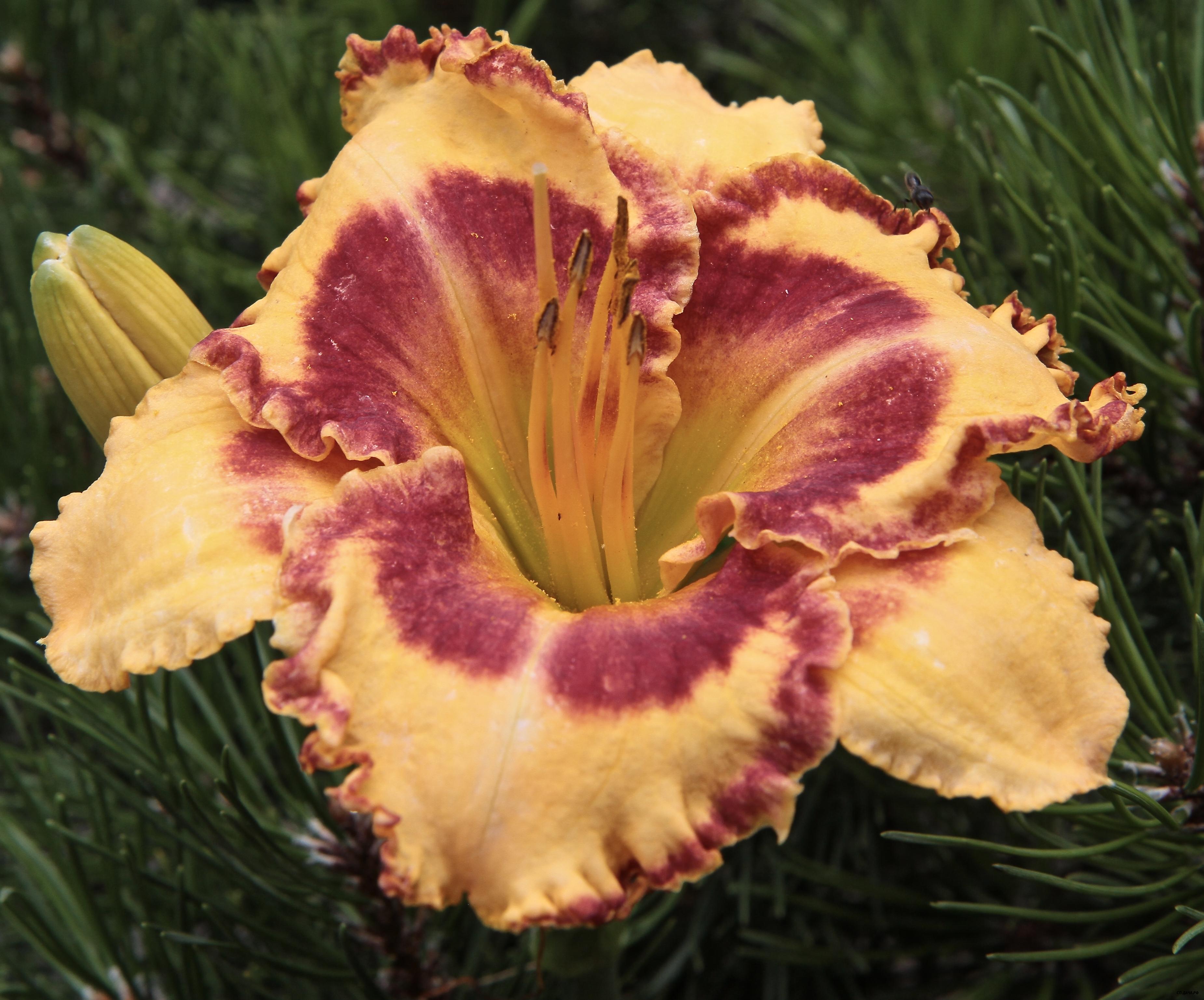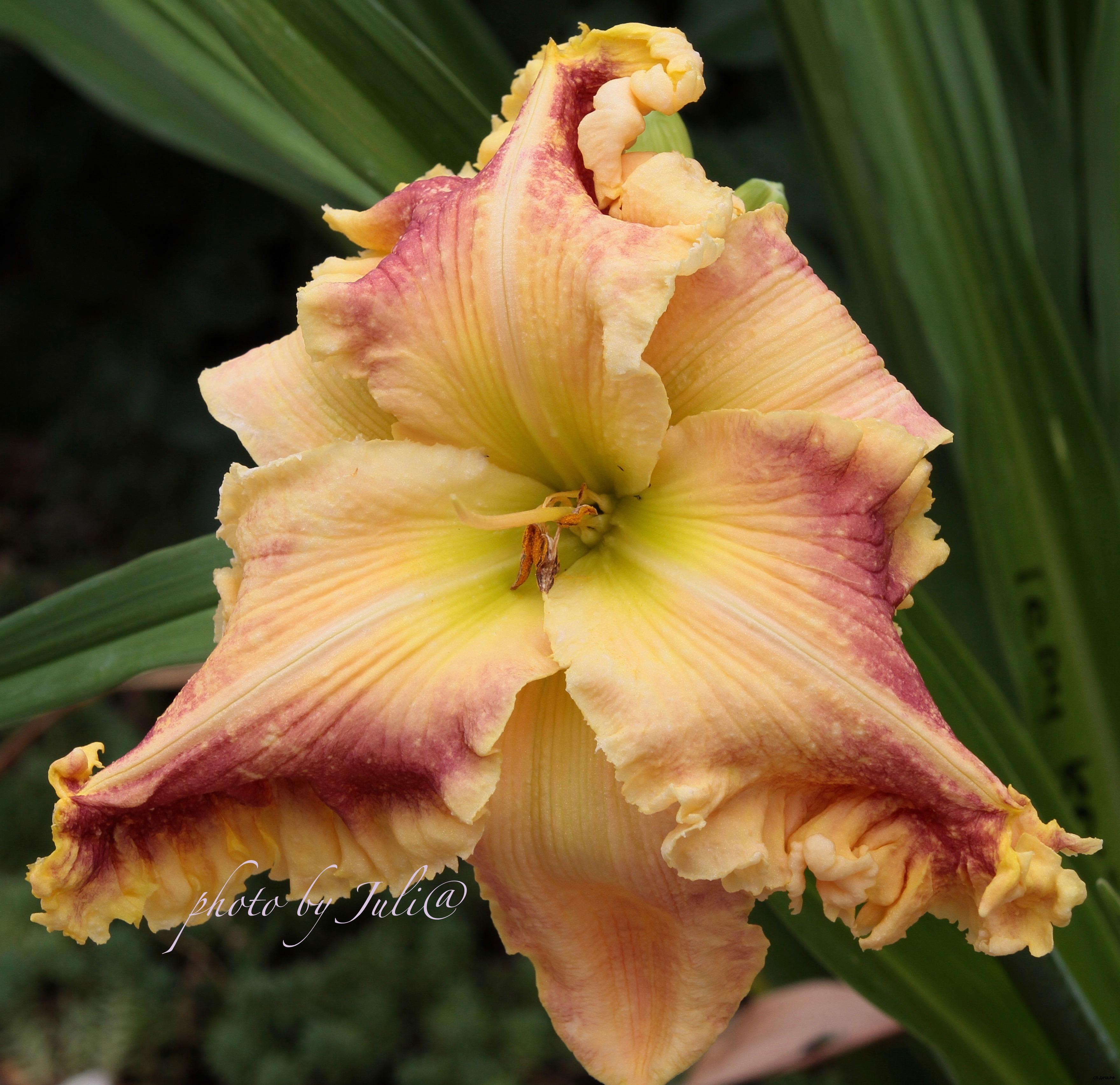 Гофрированный желтый с тёмно-красным глазком и каймой. Относится к махровым, но как пишет сам автор, это не всегда проявляется.