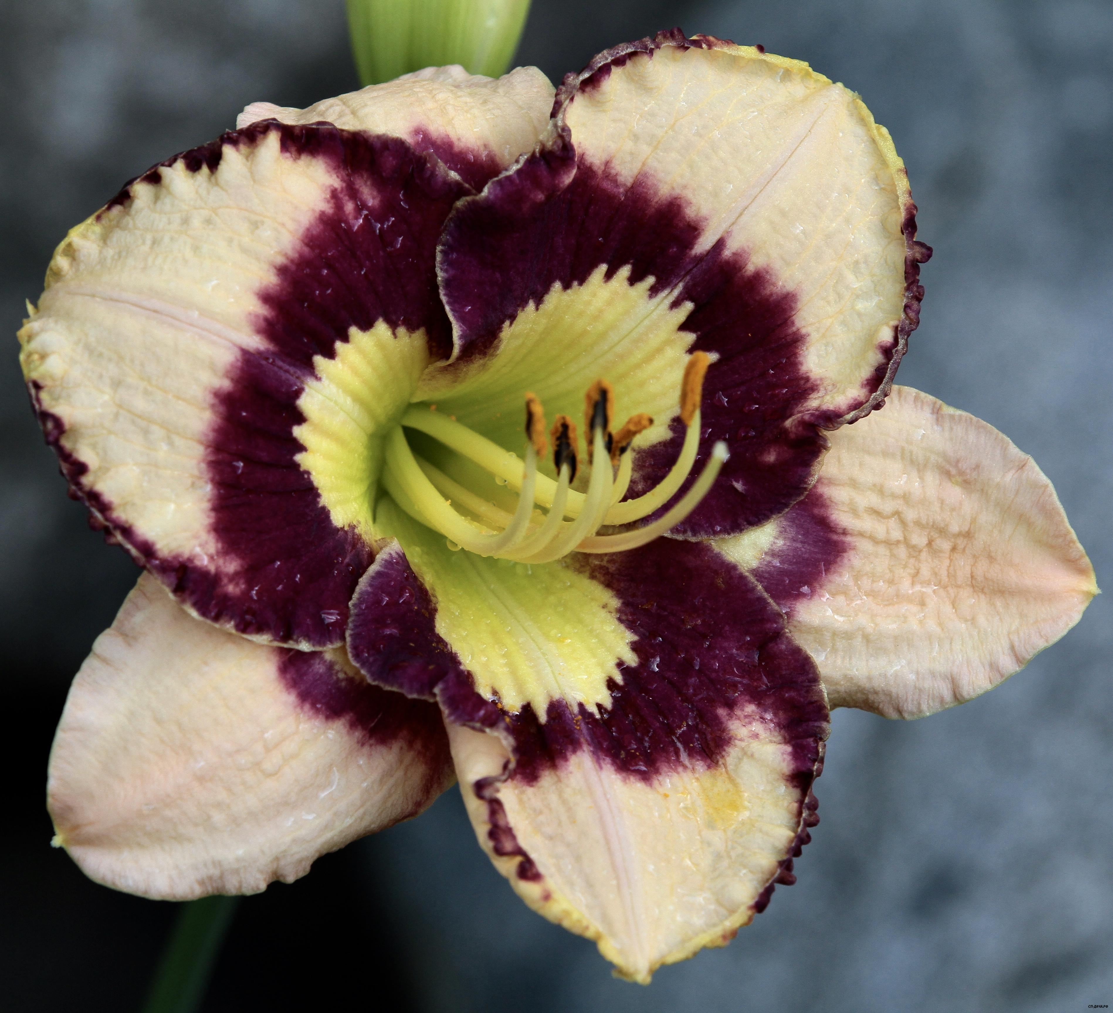 Kinnebrew 03. T, РС, 75/14. Кремовый цветок с пурпурным глазком и окантовкой и необычным жёлтым рисунком в горловине в виде трёх морских ракушек.