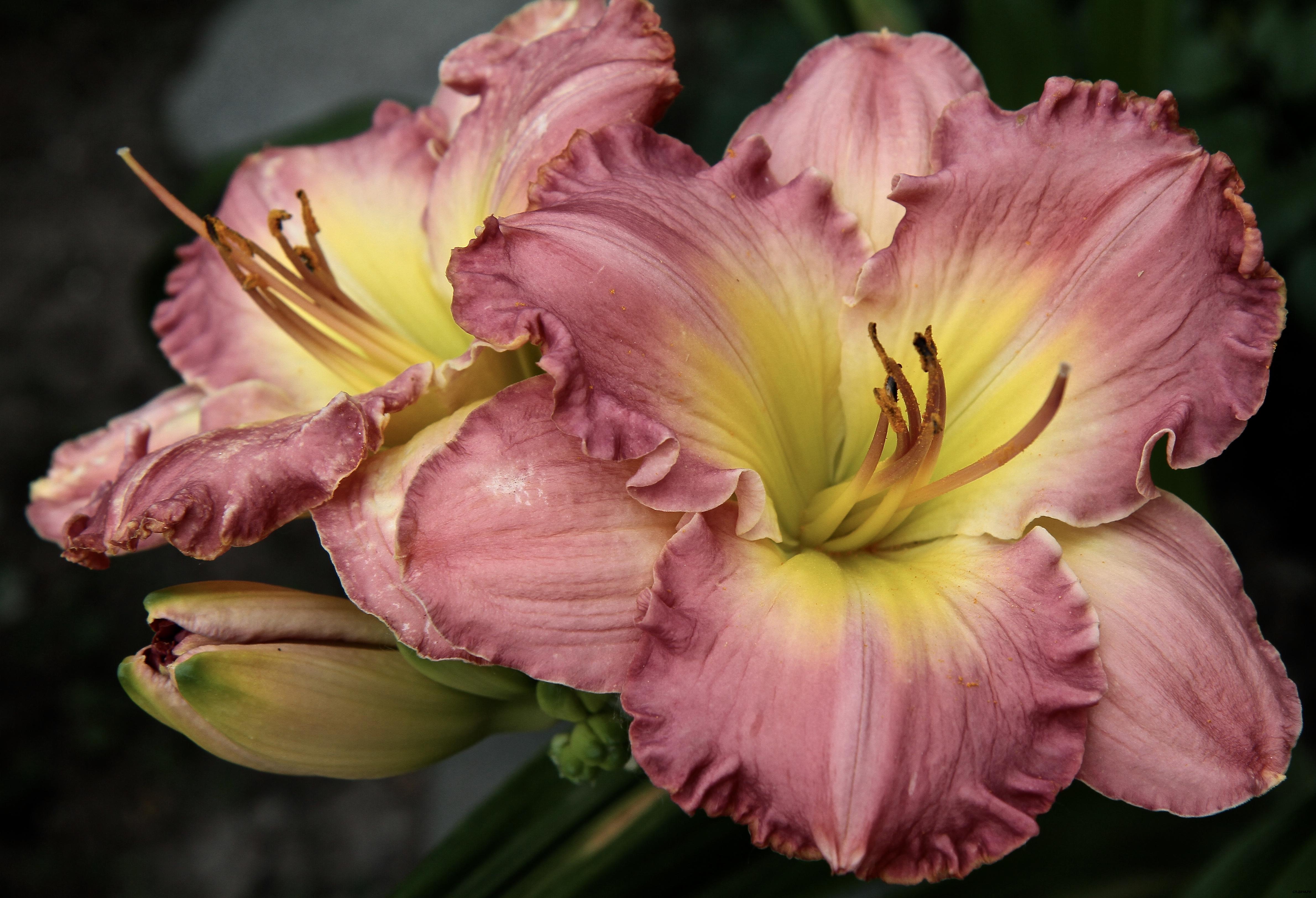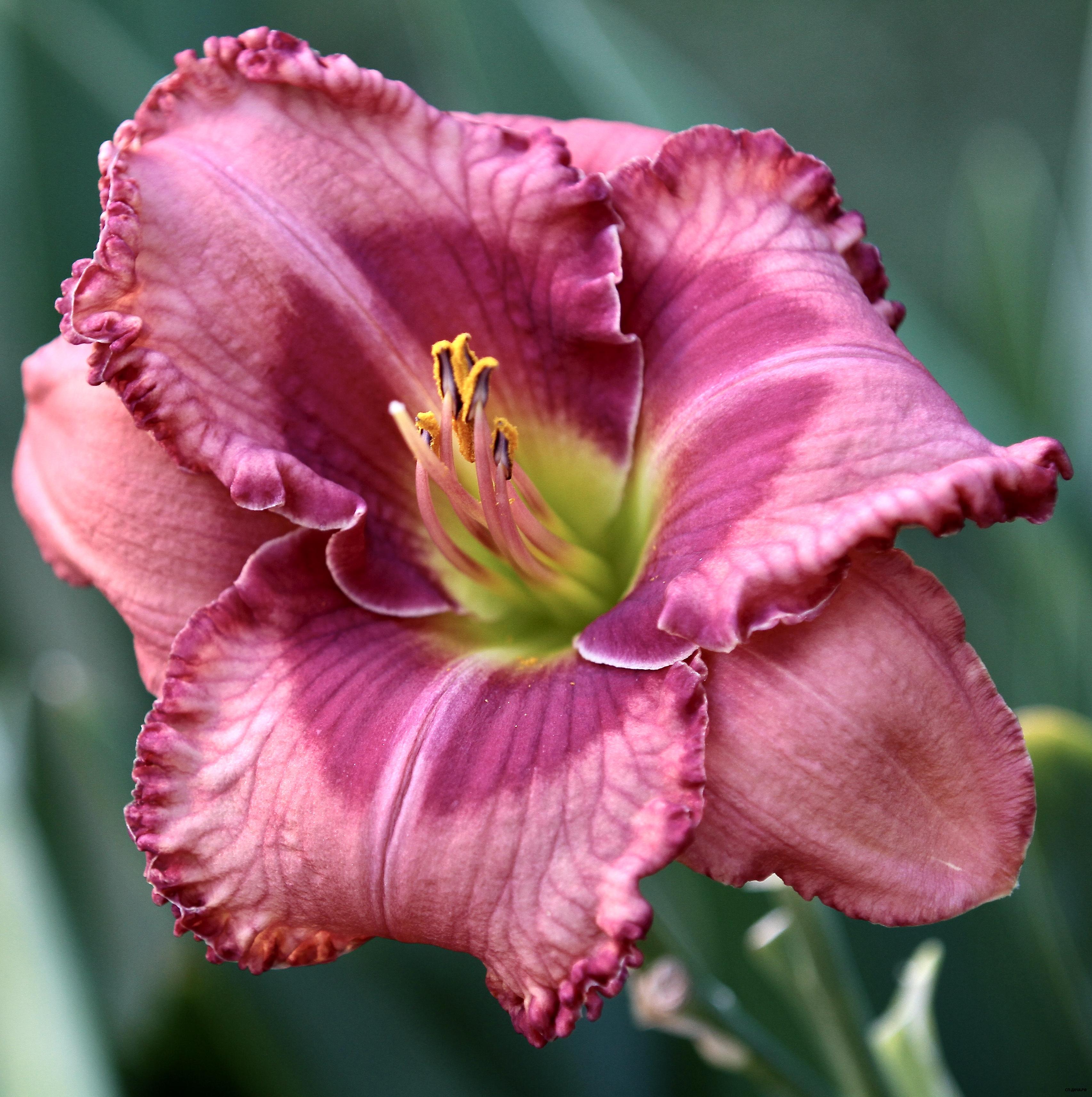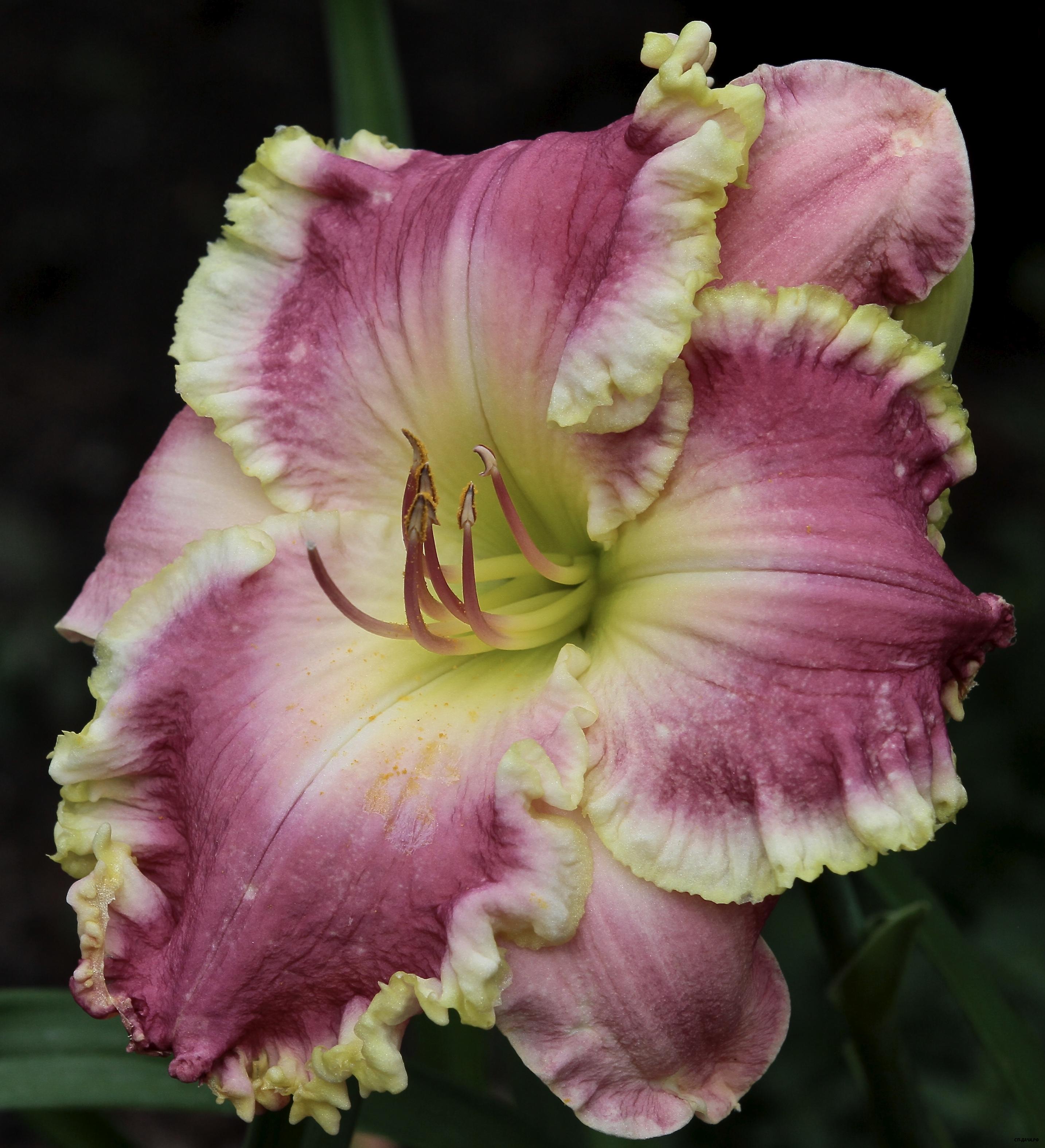 Очень крупный светло-лавандово-розовый с малиновым оттенком у желто-кремового горлышка. с гофрированным узким золотистым краем и зелёным горлом. Продолжительное цветение.Очень ароматный. Спящий, тетраплоид.