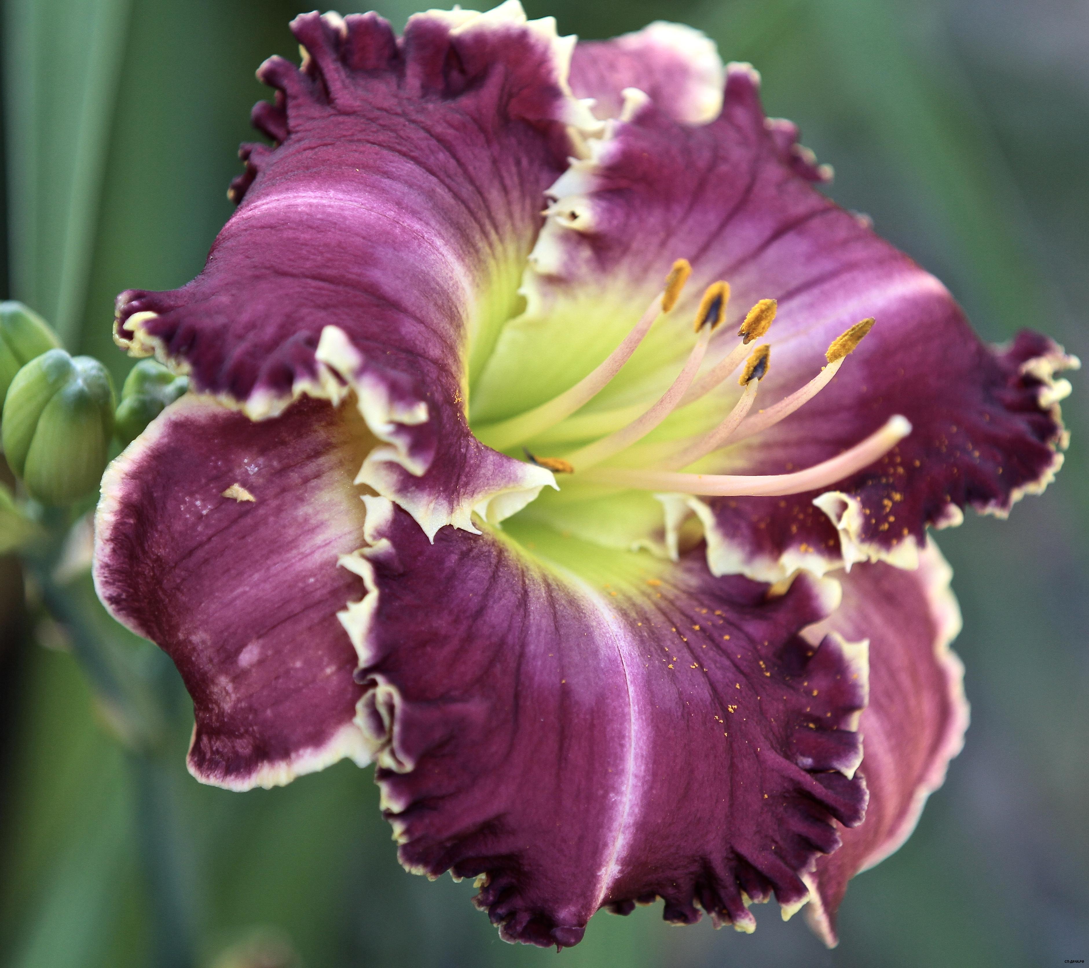 15см Большой цветок богатого, темно-пурпурного цвета, с лавандовым глазком вокруг лимонно-зеленого горла, с мощной, золотистой, гофрированной каймой. Spacecoast Scrambled 400р
