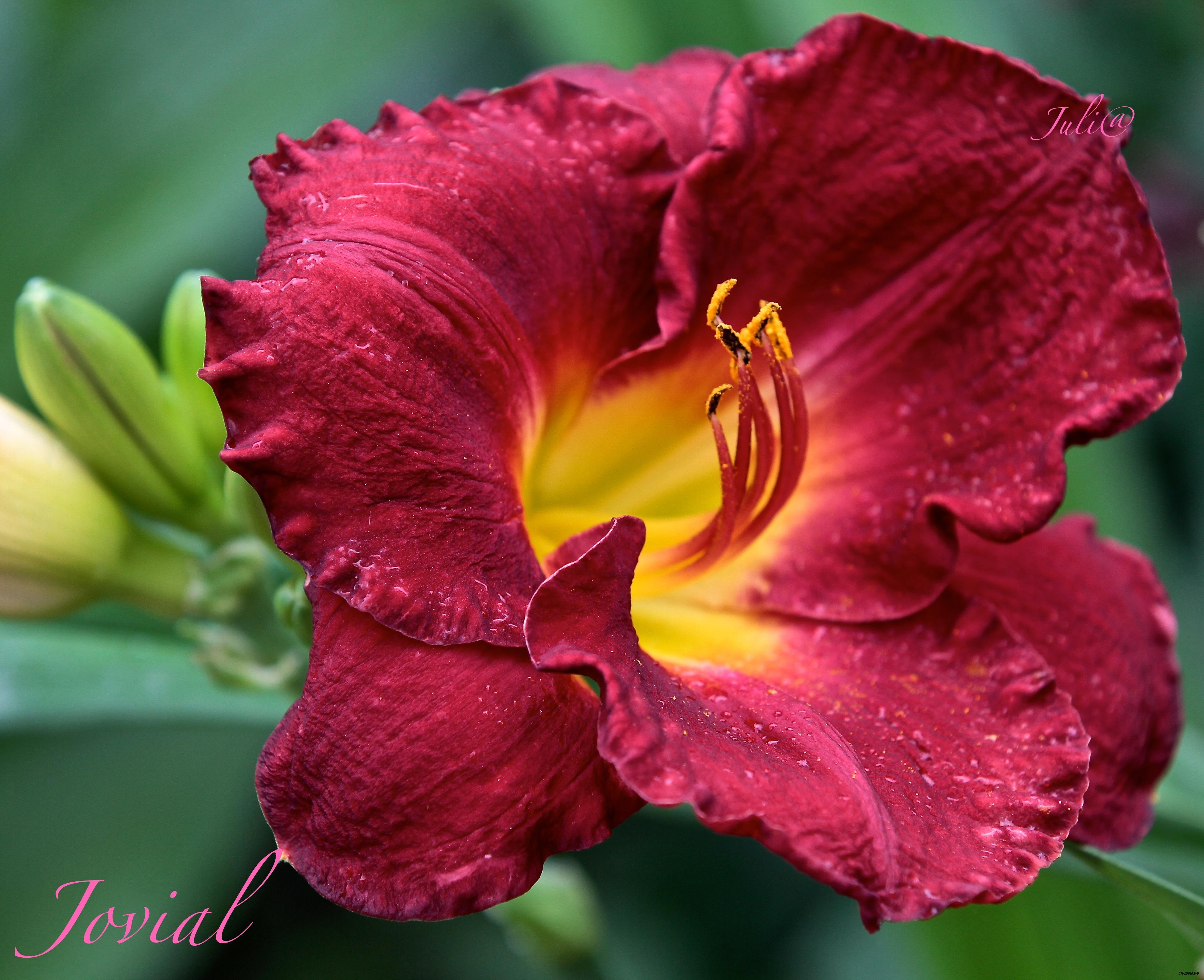 Высота - 51 см; диаметр цветка - 13 см. Цветы винно-красного цвета с желто-зеленым горлом. Душистый. Полувечнозеленый, тетраплоид.