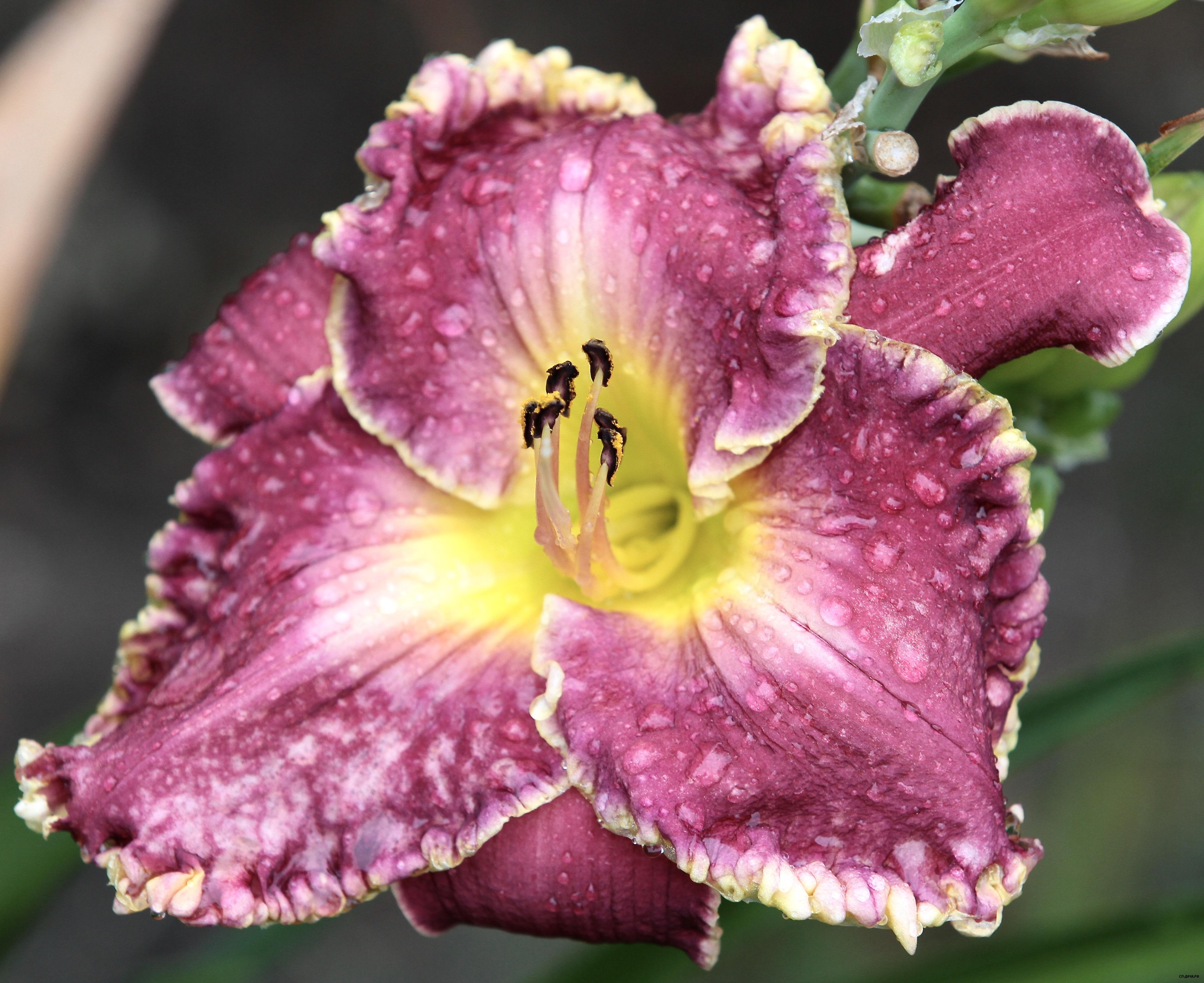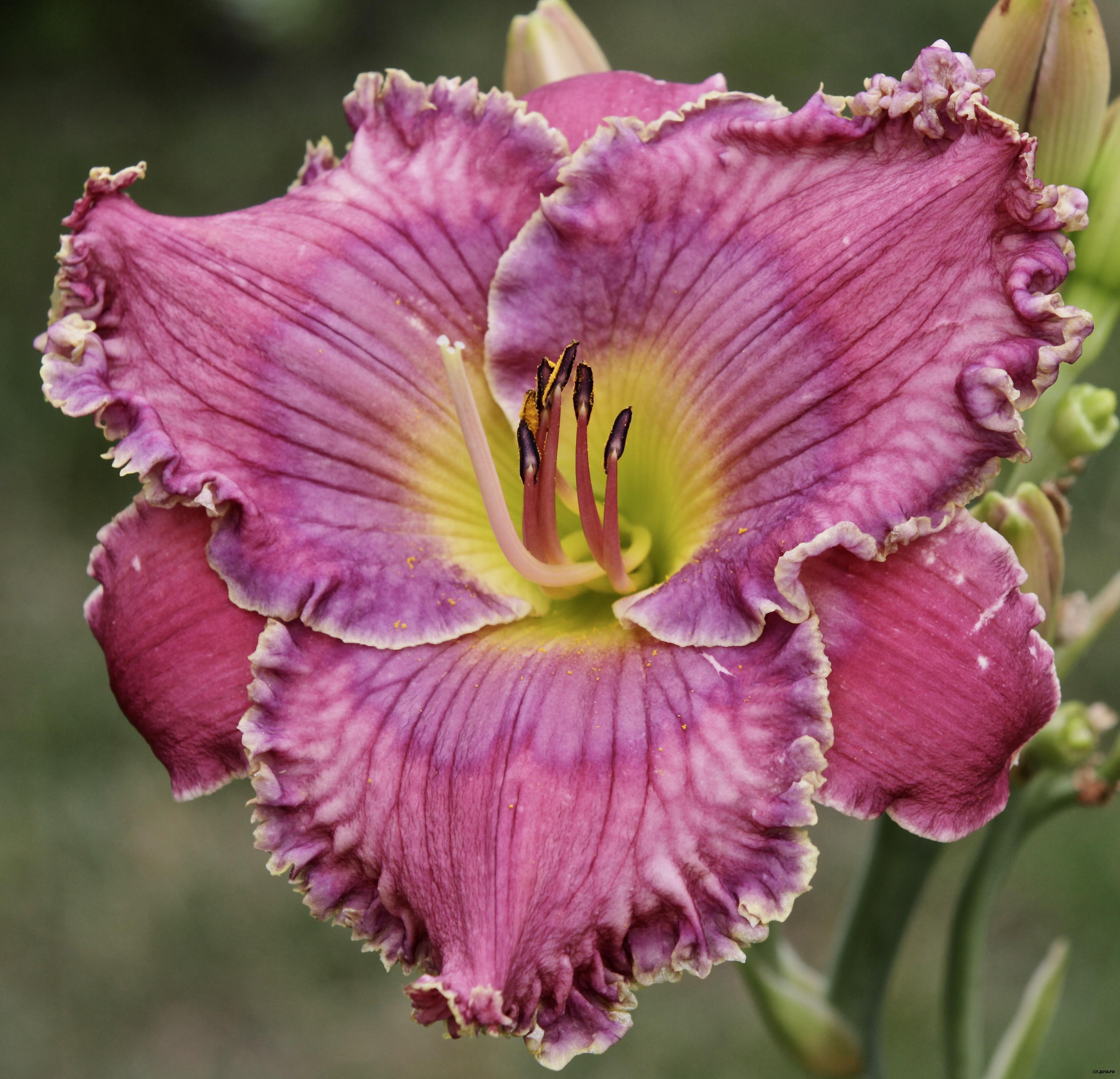 До 35 бутонов. Огромный малиново-розово-лавандовый с широкой 3см золотистой пузырчатой каймой, глазок золотой, горло зелёное. Ароматный, плоский. Длительное цветение.