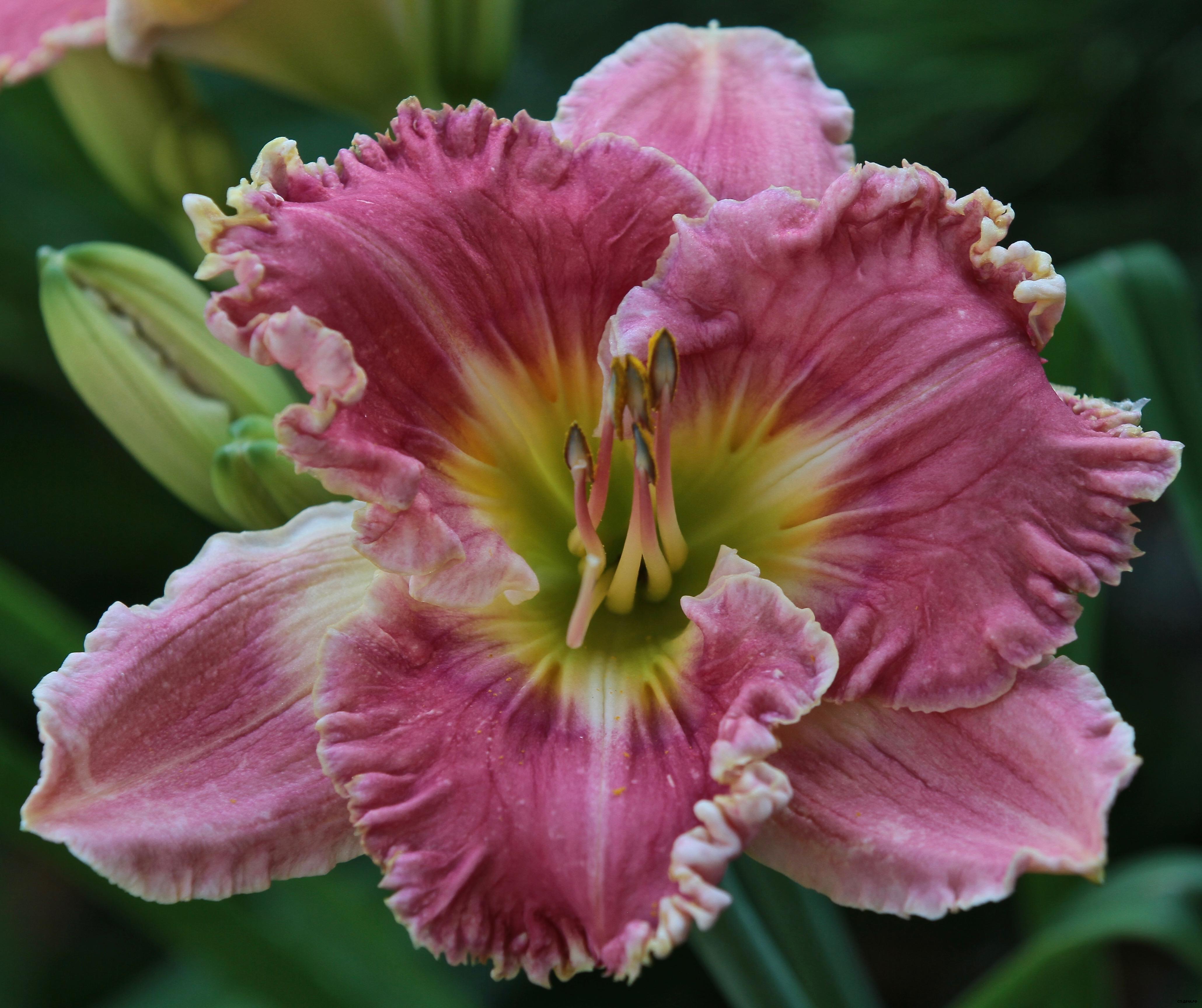 Этот цветок сделает ваш сад ярче, будто Вы смотрите через розовые очки. Красивого розового цвета со скульптурными элементами вокруг горла цвета шартрез. Всю эту красоту дополняет кружевная оборка. Великолепен! На каждом цветоносе 25 бутонов.