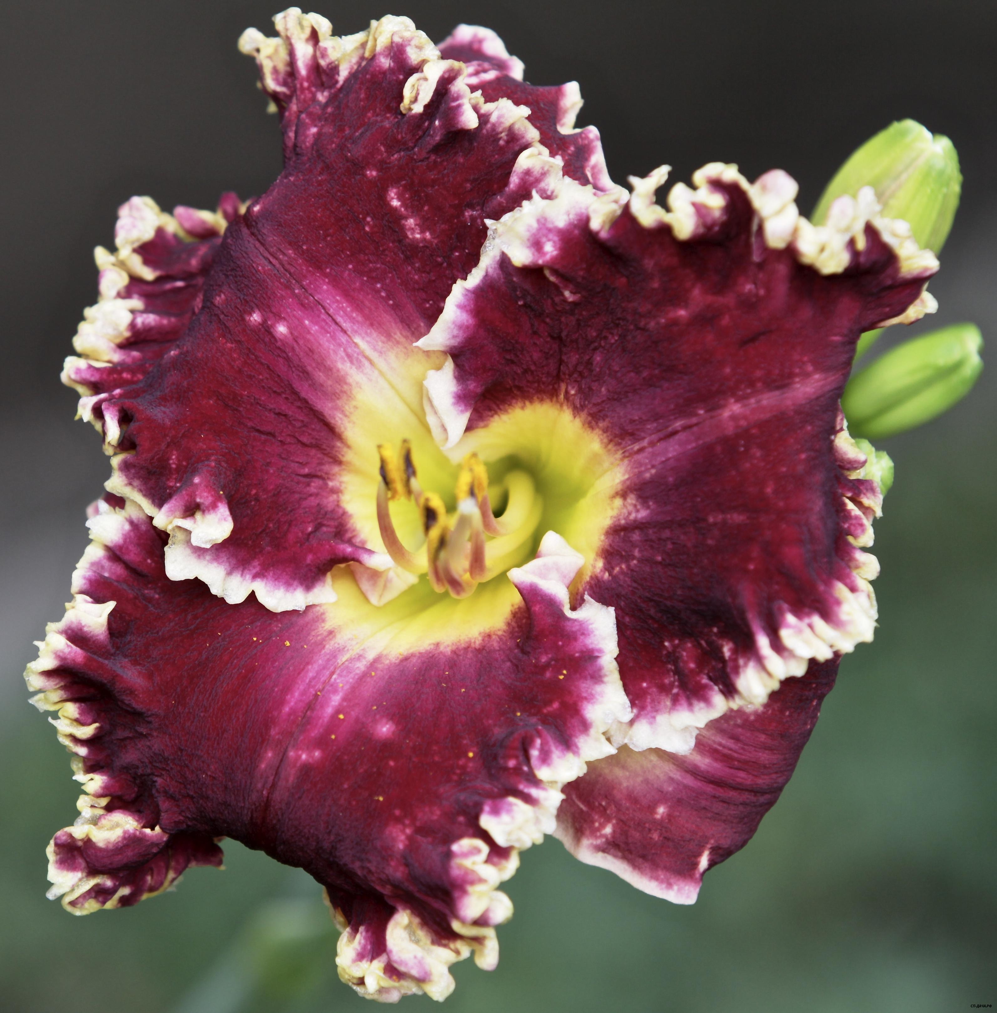 Пурпурно-черный с серебристо белой гофрированной каймой "акульи зубы". Зеленое горло. На каждом цветоносе до 20 бутонов. Великолепен! Обладатель награды: Honorable Mention: 2009