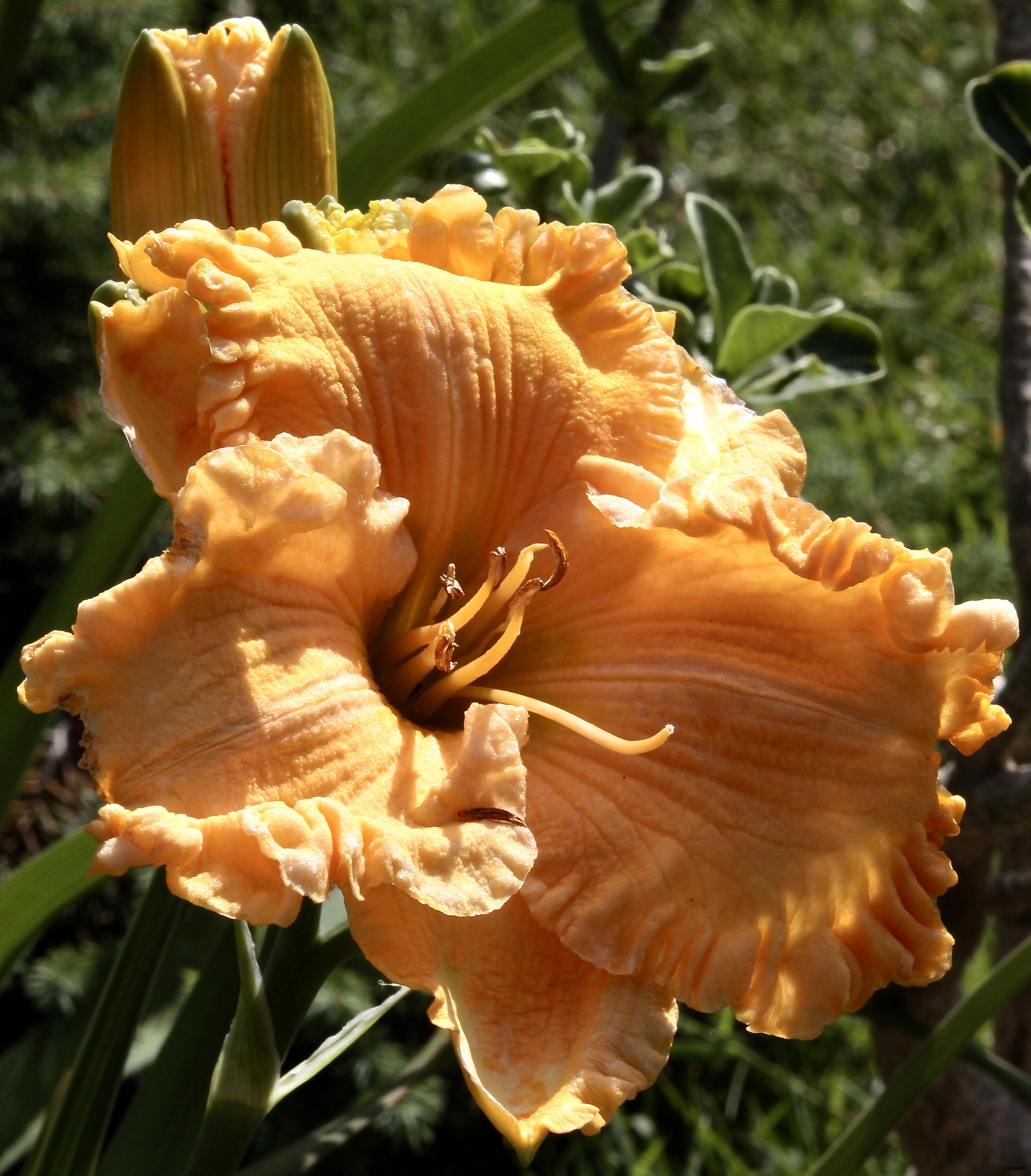 Гигантский оранжево-дынный цветок с кремовыми прожилками и с очень широкой, сильно гофрированной каймой. Ароматный. Обильное и продолжительное цветение. На каждом цветоносе 40 бутонов. Хорошее нарастание куста в Подмосковье. Яркий и солнечный цветок. Обладатель награды JC: 2007