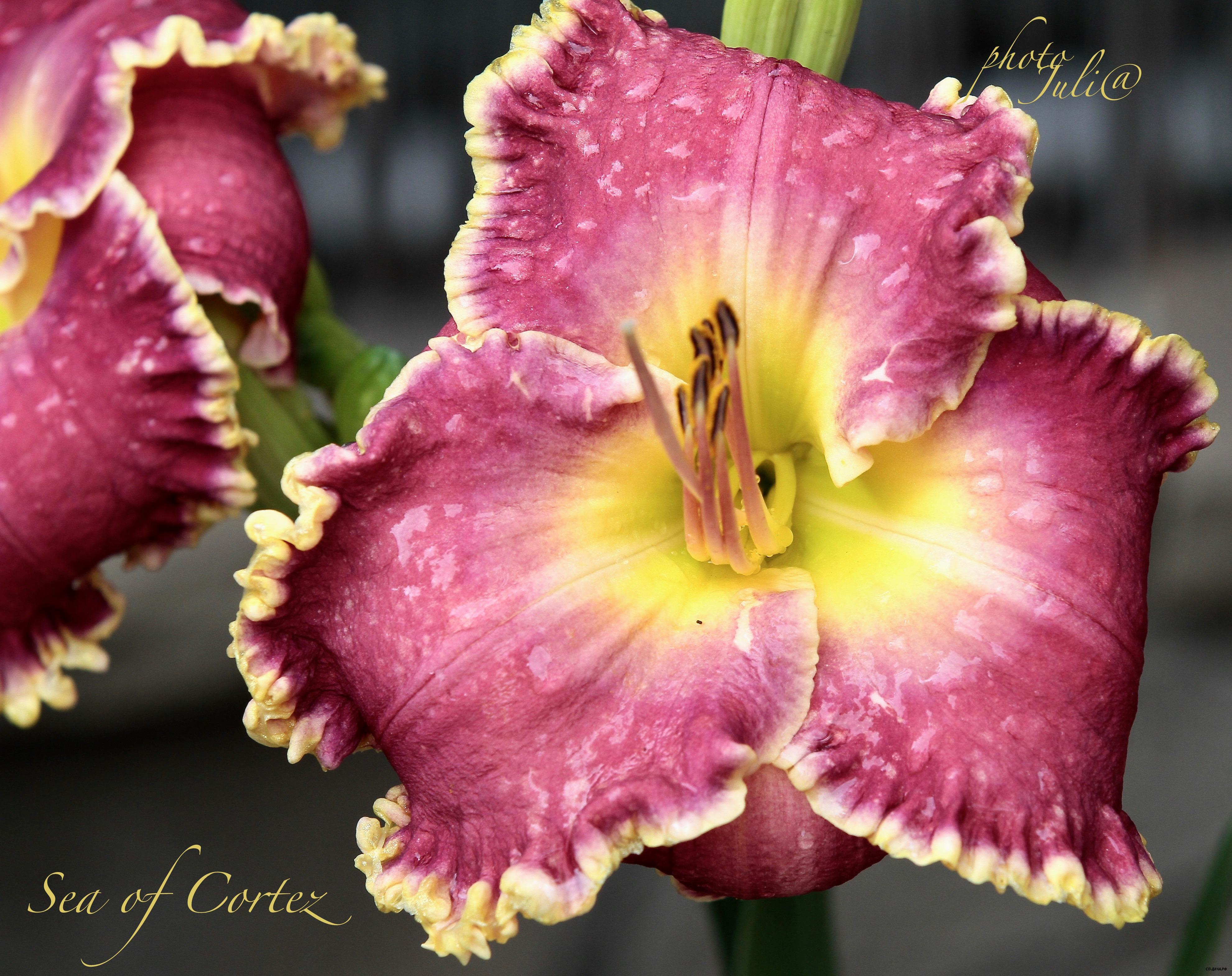 * Sea of Cortez 400 15см Большой цветок богатого, темно-пурпурного цвета, с лавандовым глазком вокруг лимонно-зеленого горла, с мощной, золотистой, гофрированной каймой.