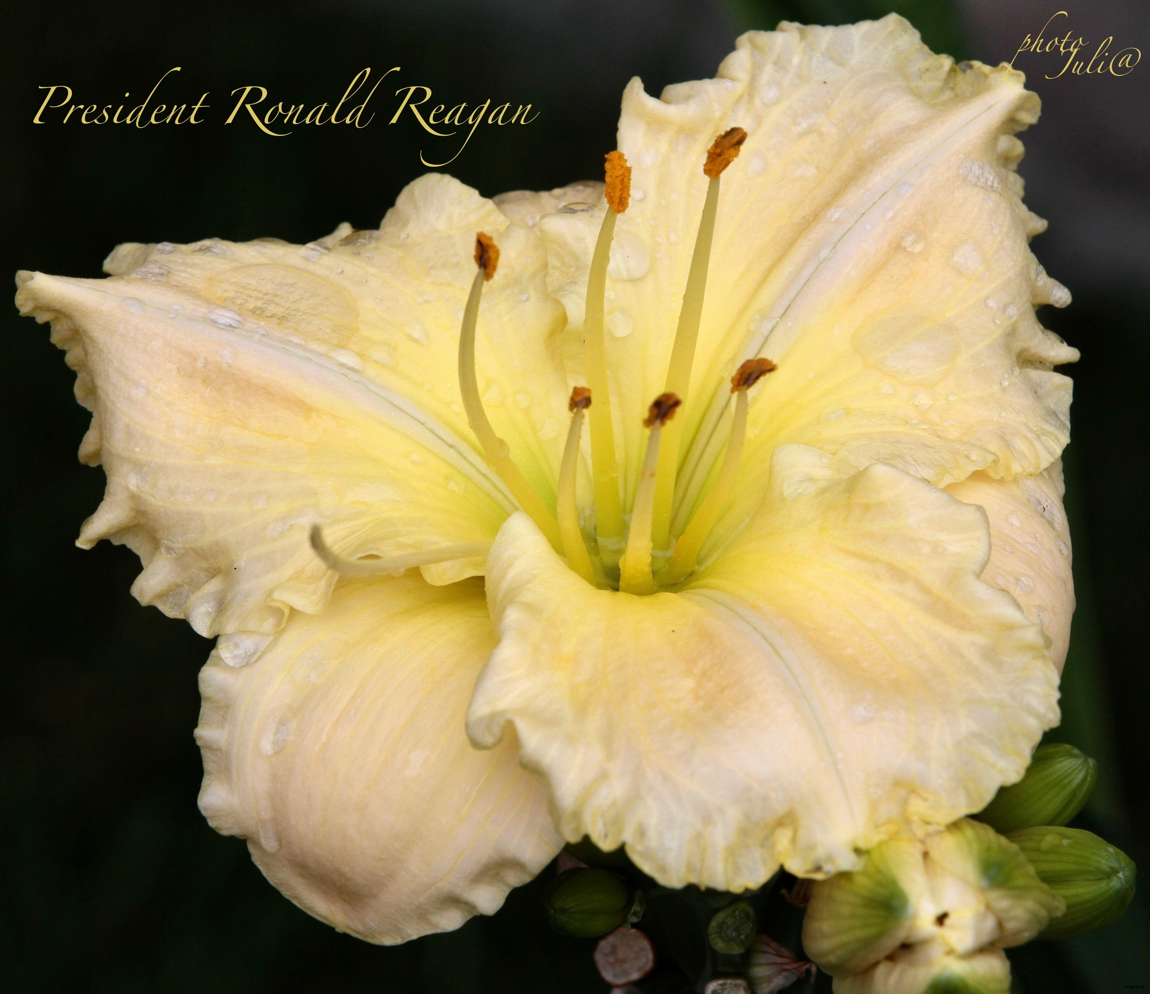 Тетраплоидный сорт, кремовые лепестки с жёлто-зеленым горлом и тонкой золотистой обводкой по рифленому краю, жёлтое горло. Цветоносы высотой 50 см. Диаметр цветов 15 см.